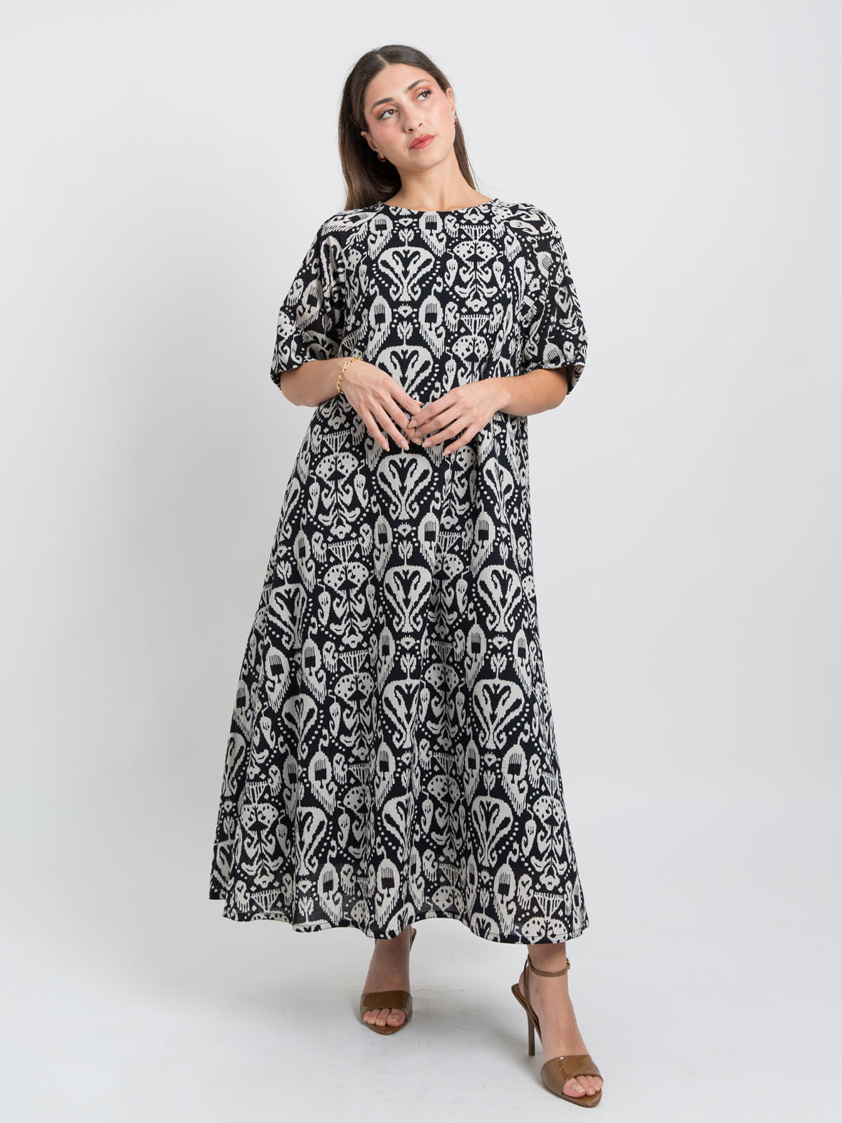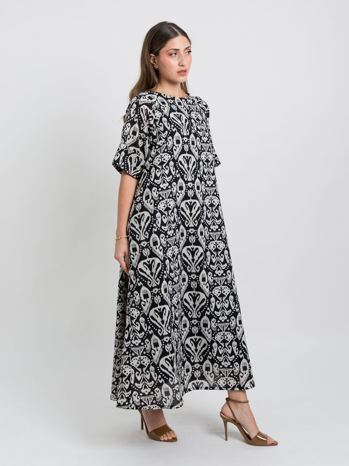 Half Cloche Short Sleeves Jalabiya Ankle Length in Printed Cotton Fabric