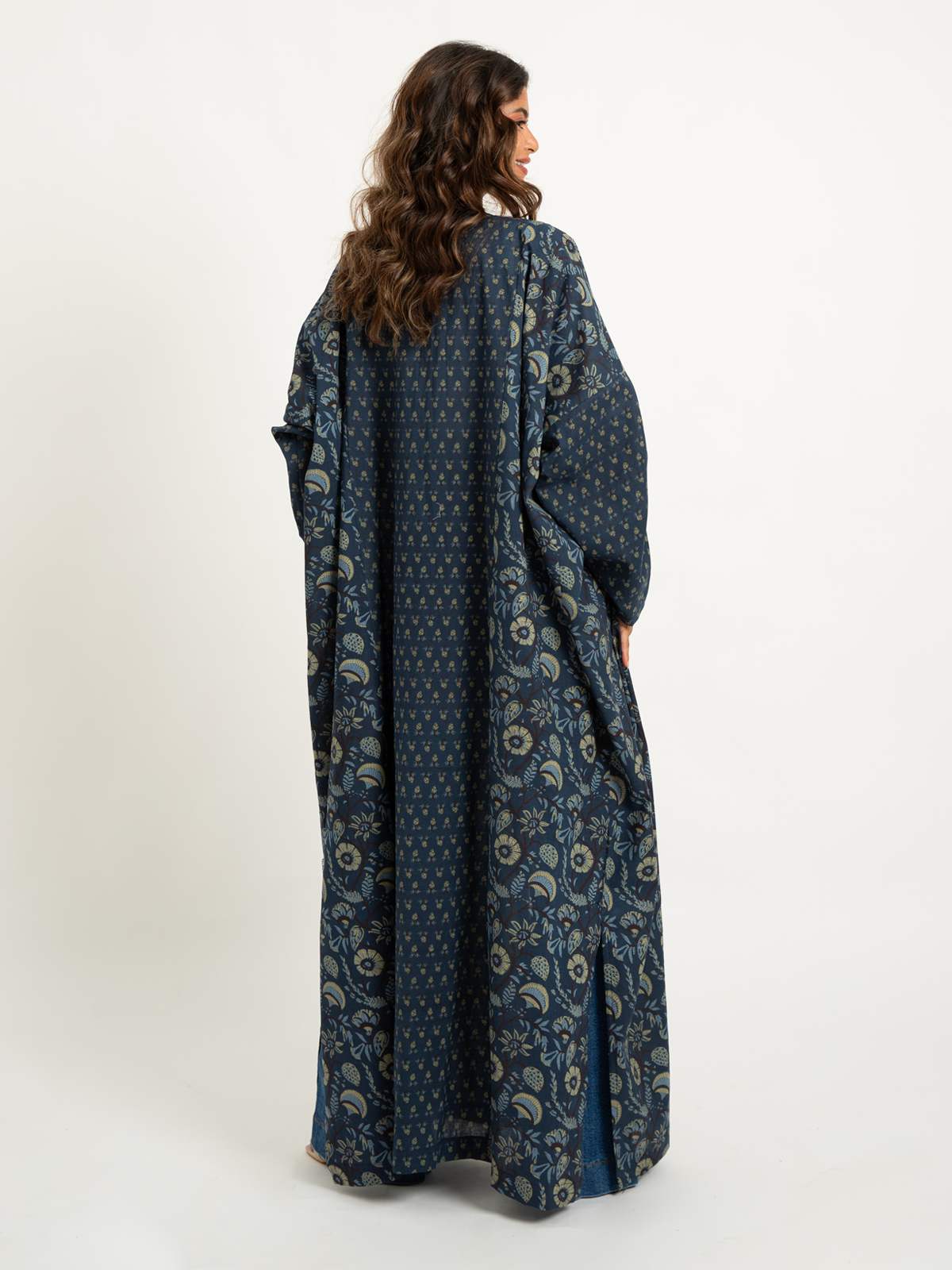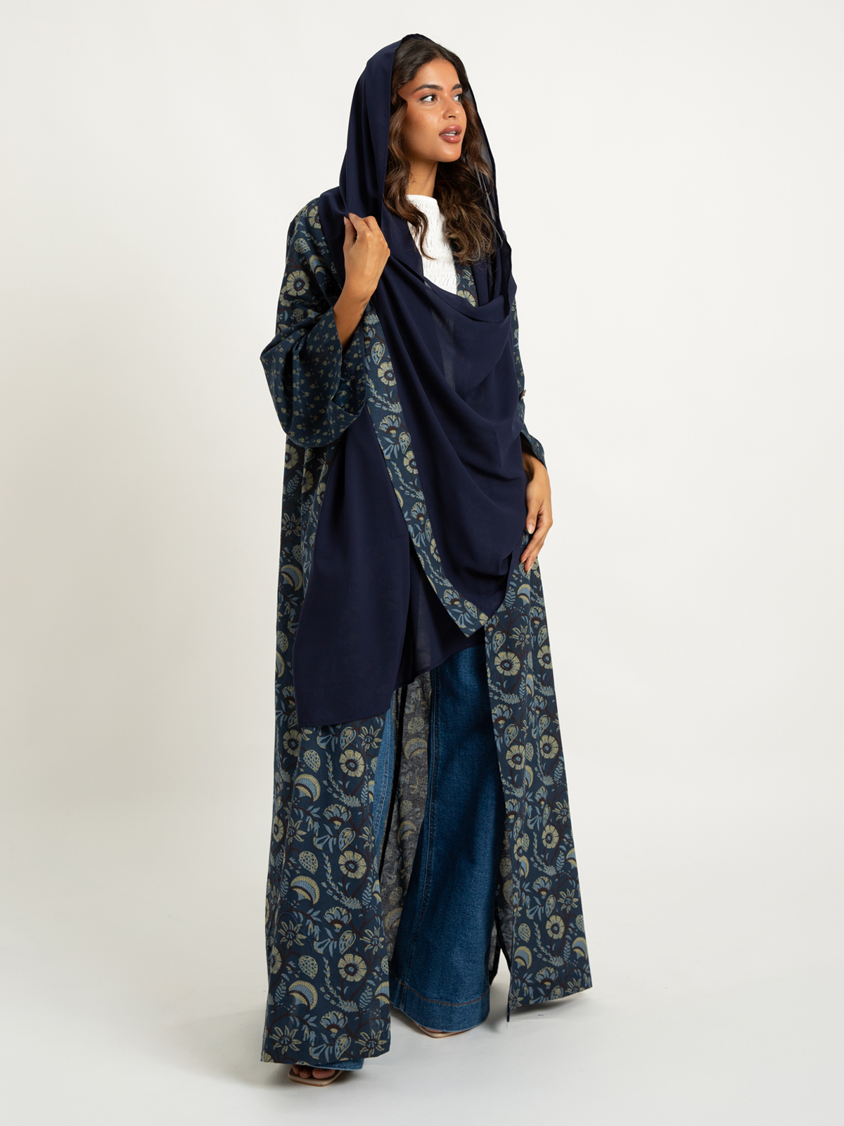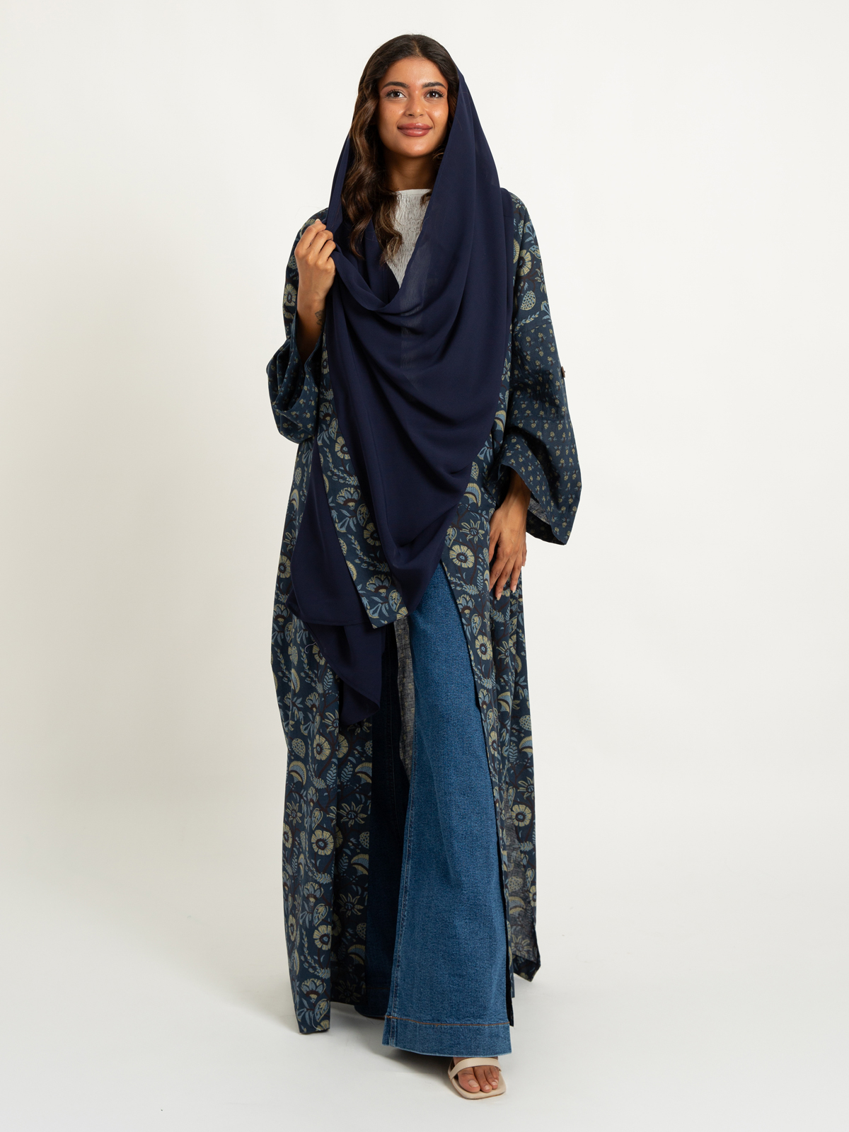 Long Wide-fit Open Abaya in Printed Cotton Fabric