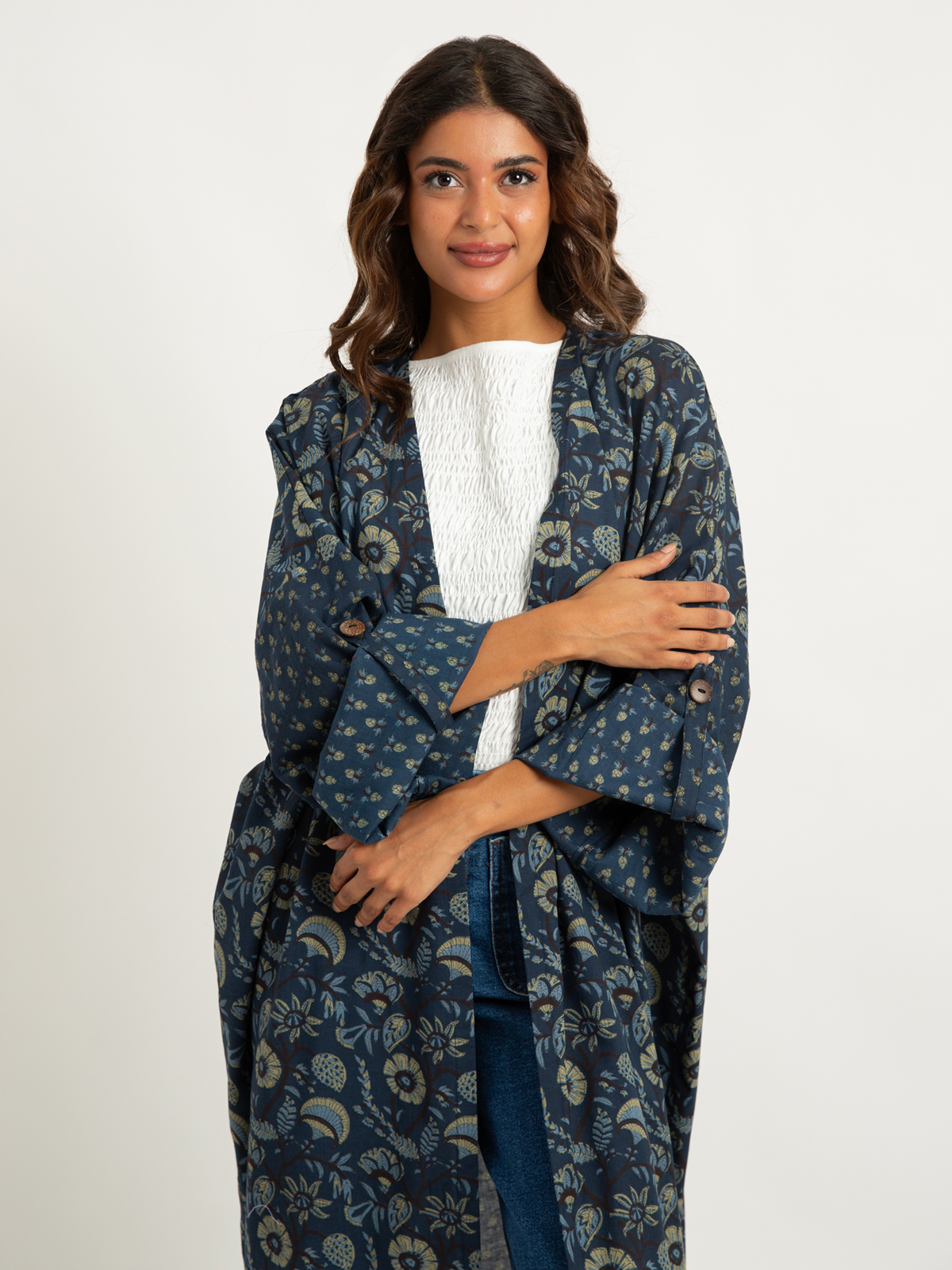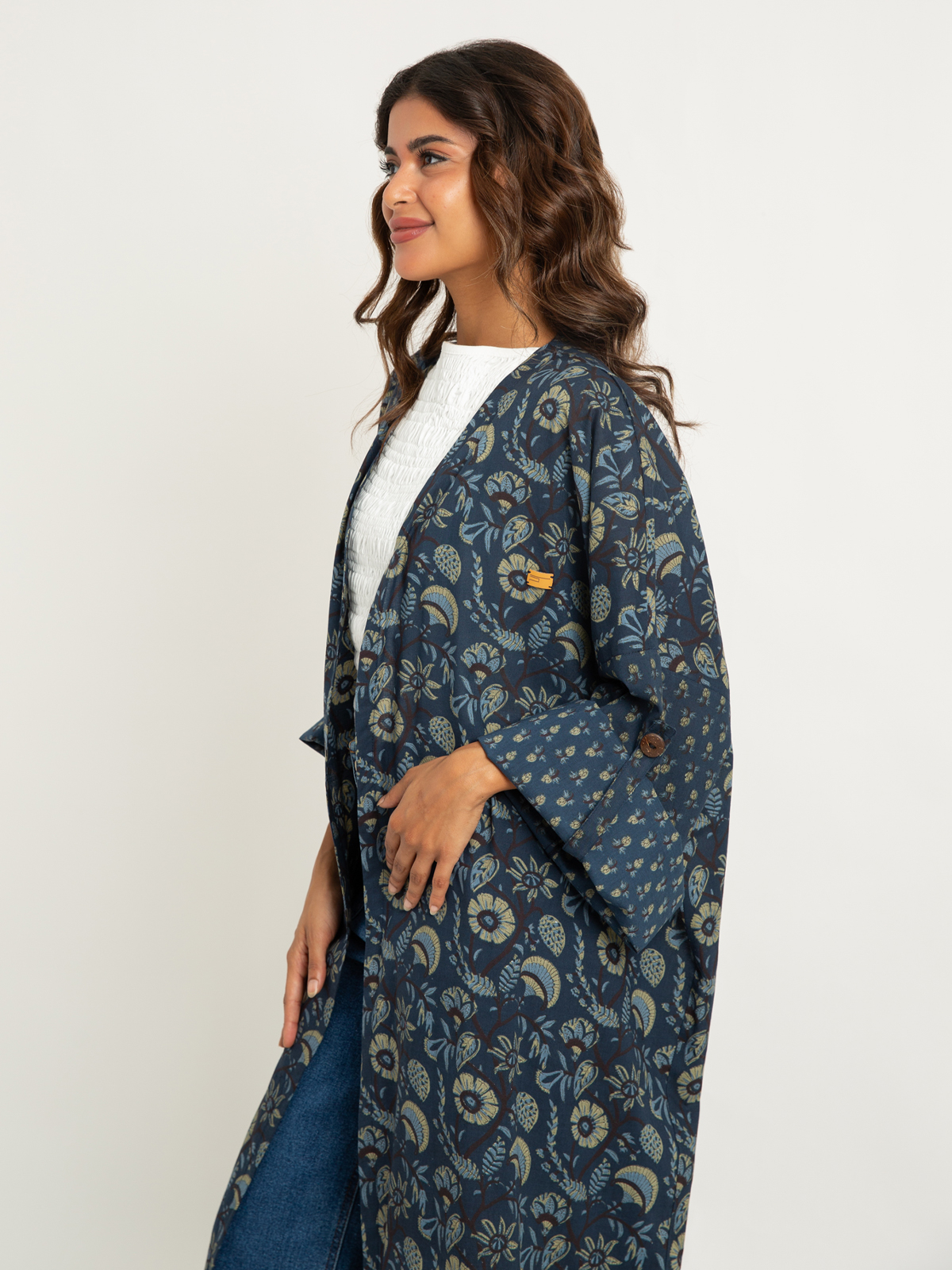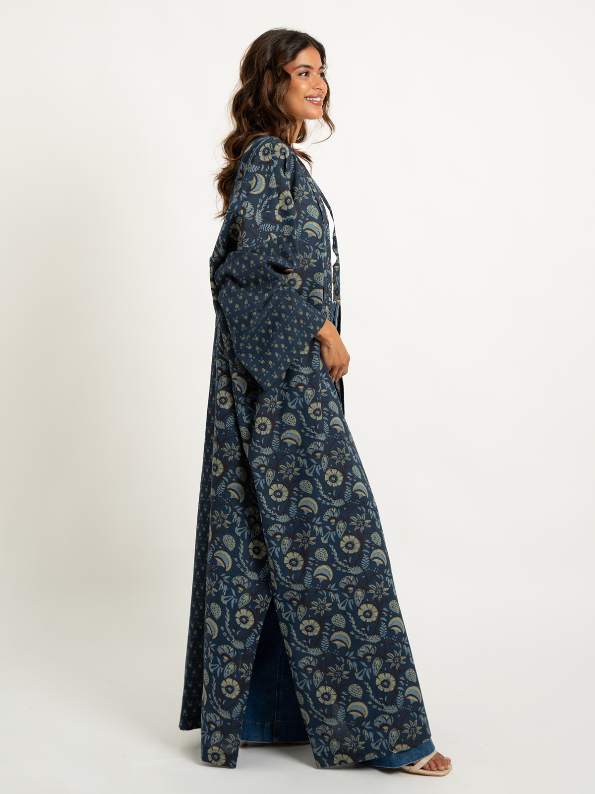 Long Wide-fit Open Abaya in Printed Cotton Fabric