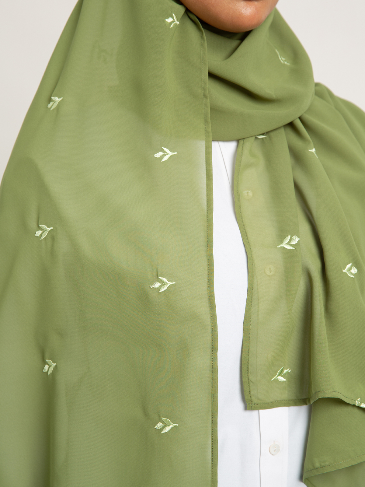 Hijab color: Apple Green with Flower Petals Embroidery.