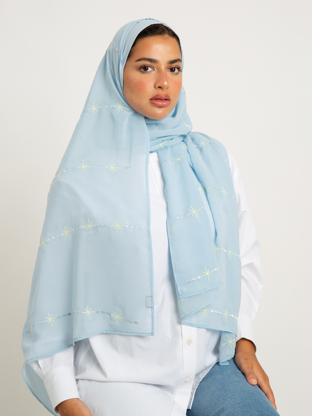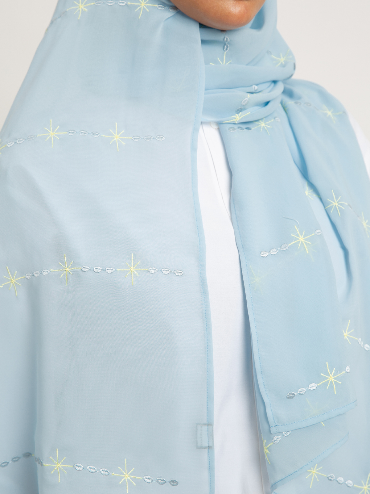 Hijab color: Baby Blue with Galaxy Threads Embroidery.