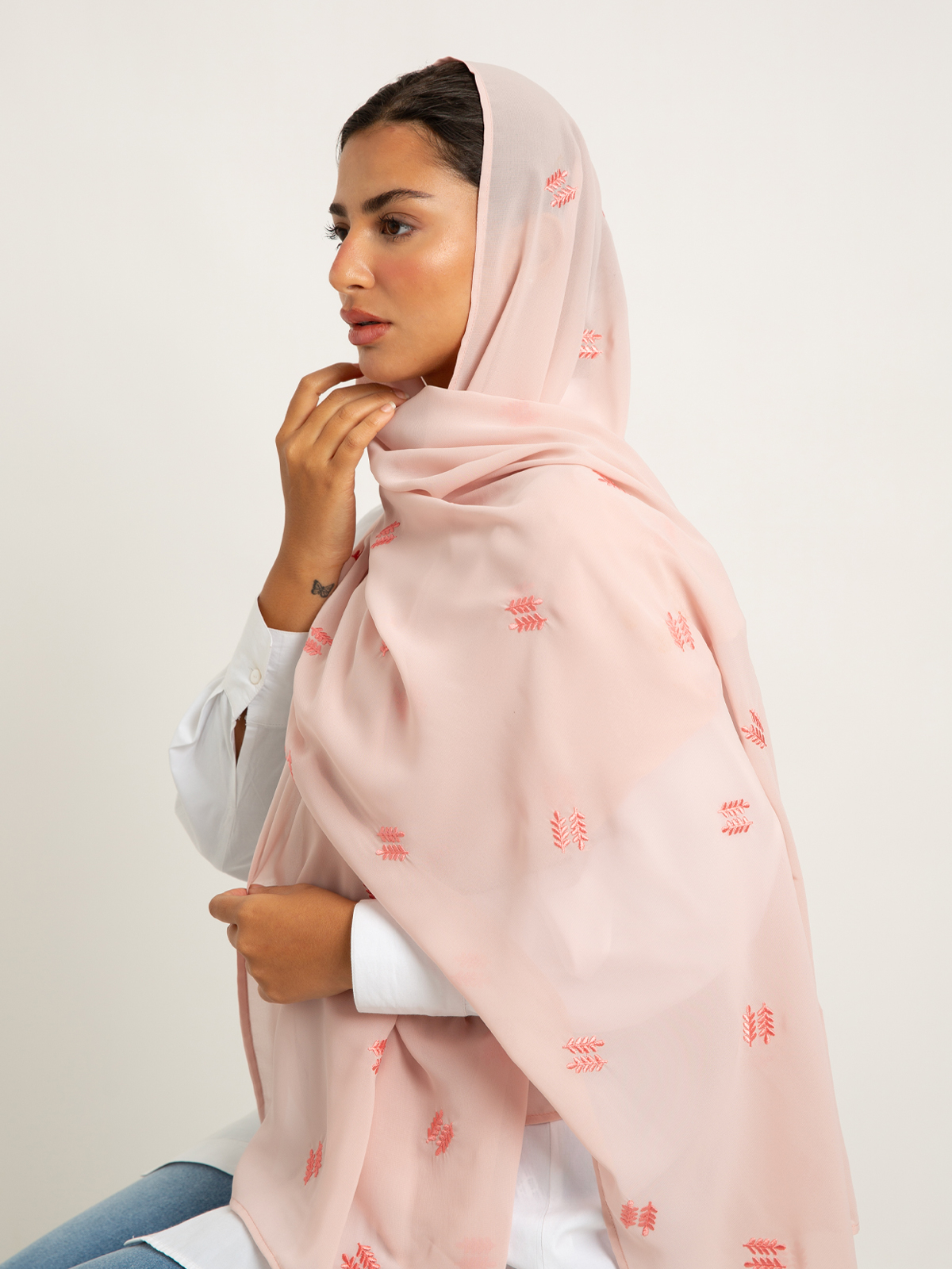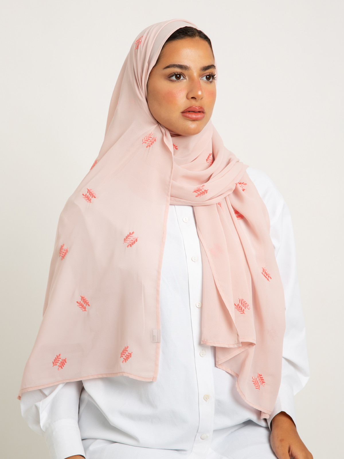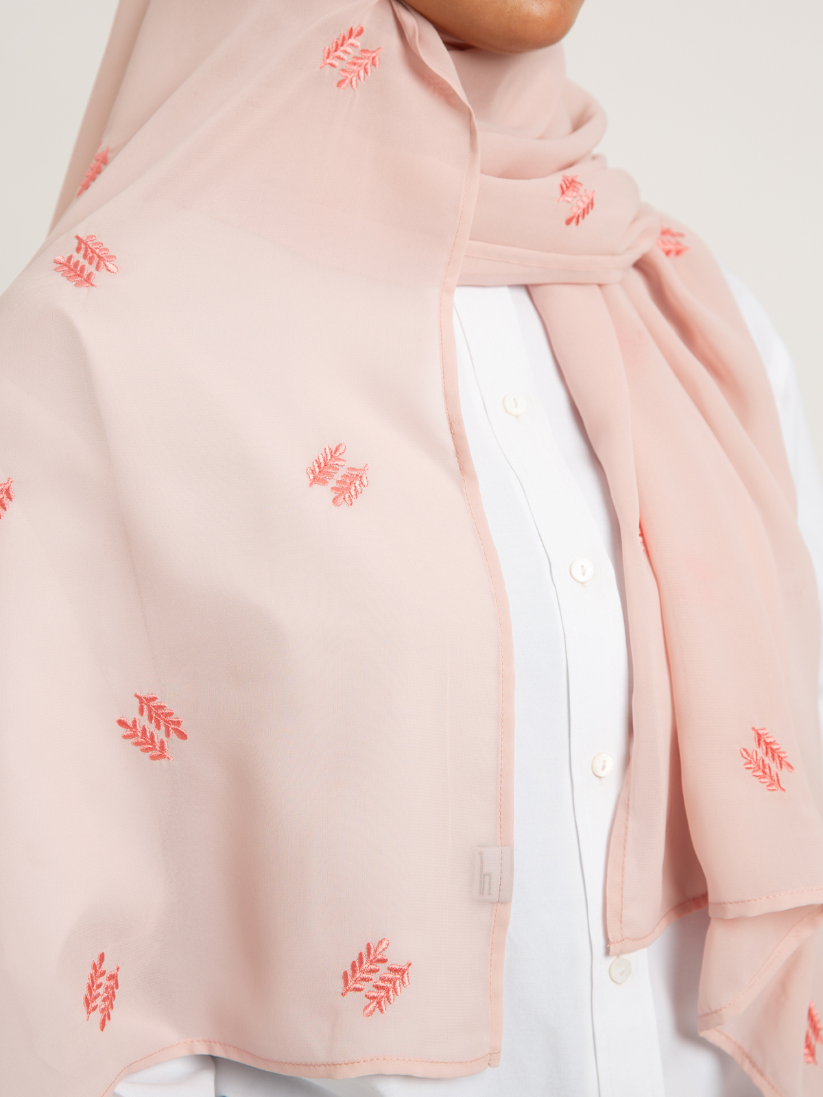 Hijab color: Baby Pink with Pine Rose Embroidery.