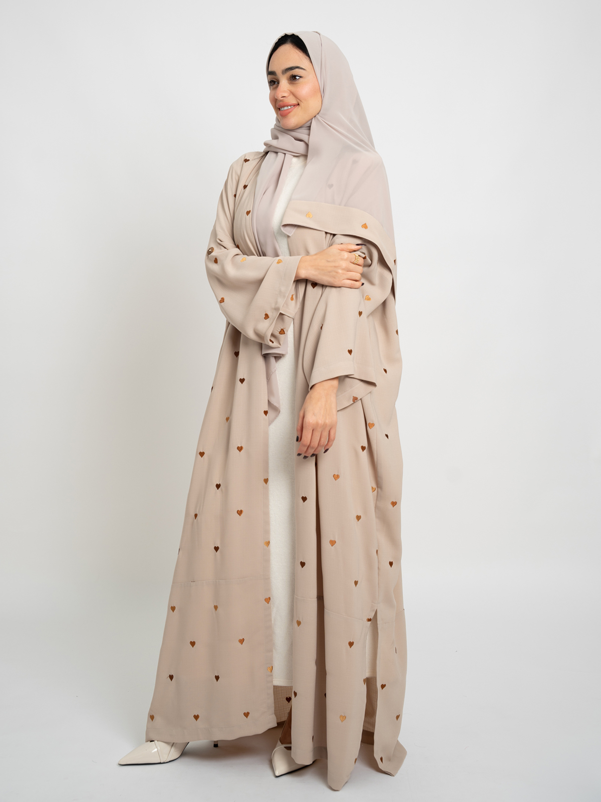 Ankle Length Wide-fit Open Abaya in Embroidered Linen-feel Fabric