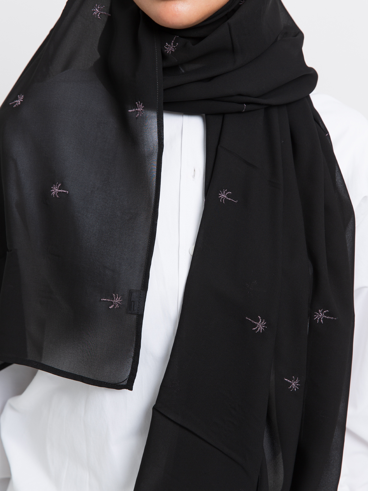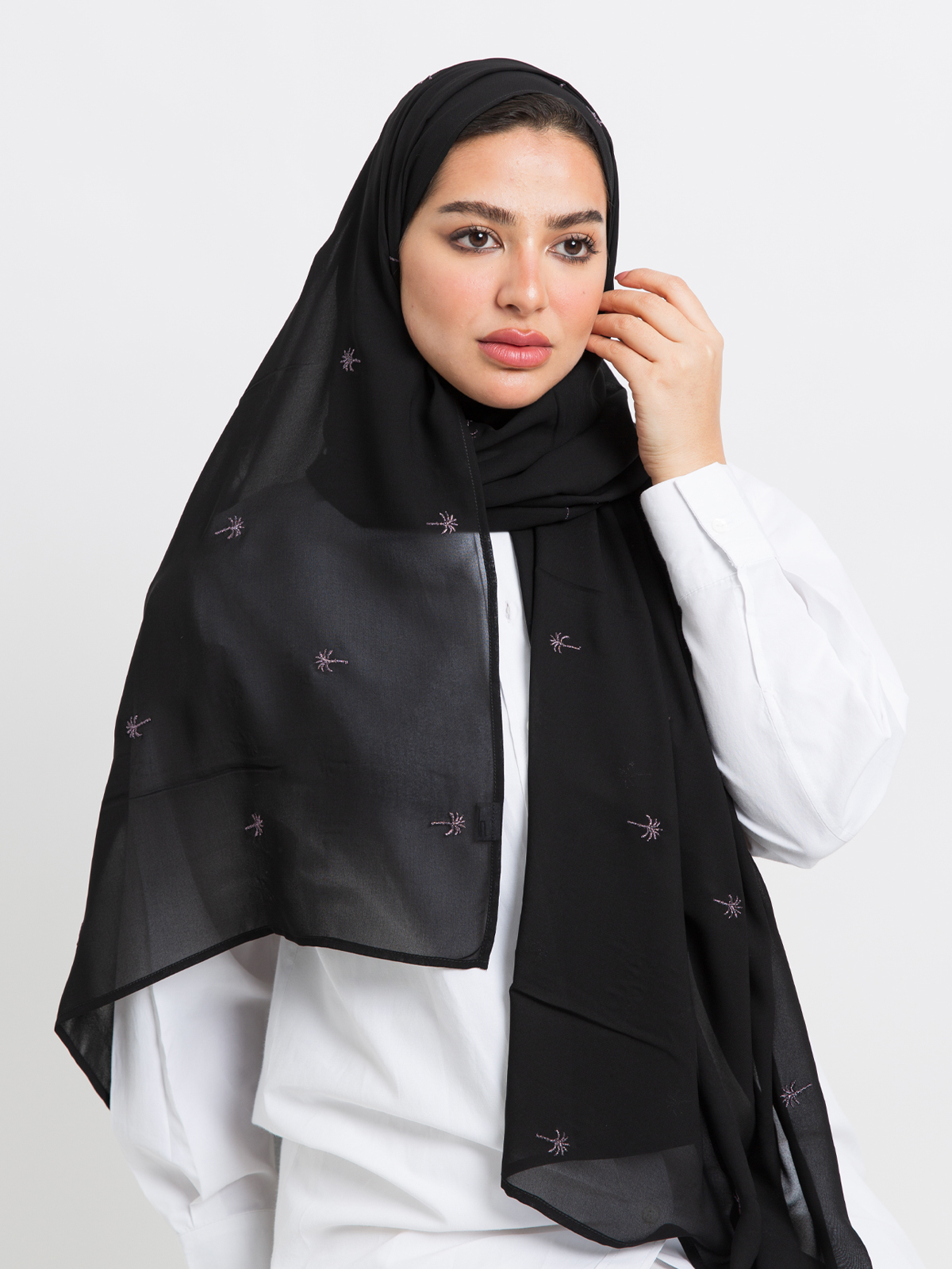 Hijab color: Black with Mauve Nakhil Embroidery.