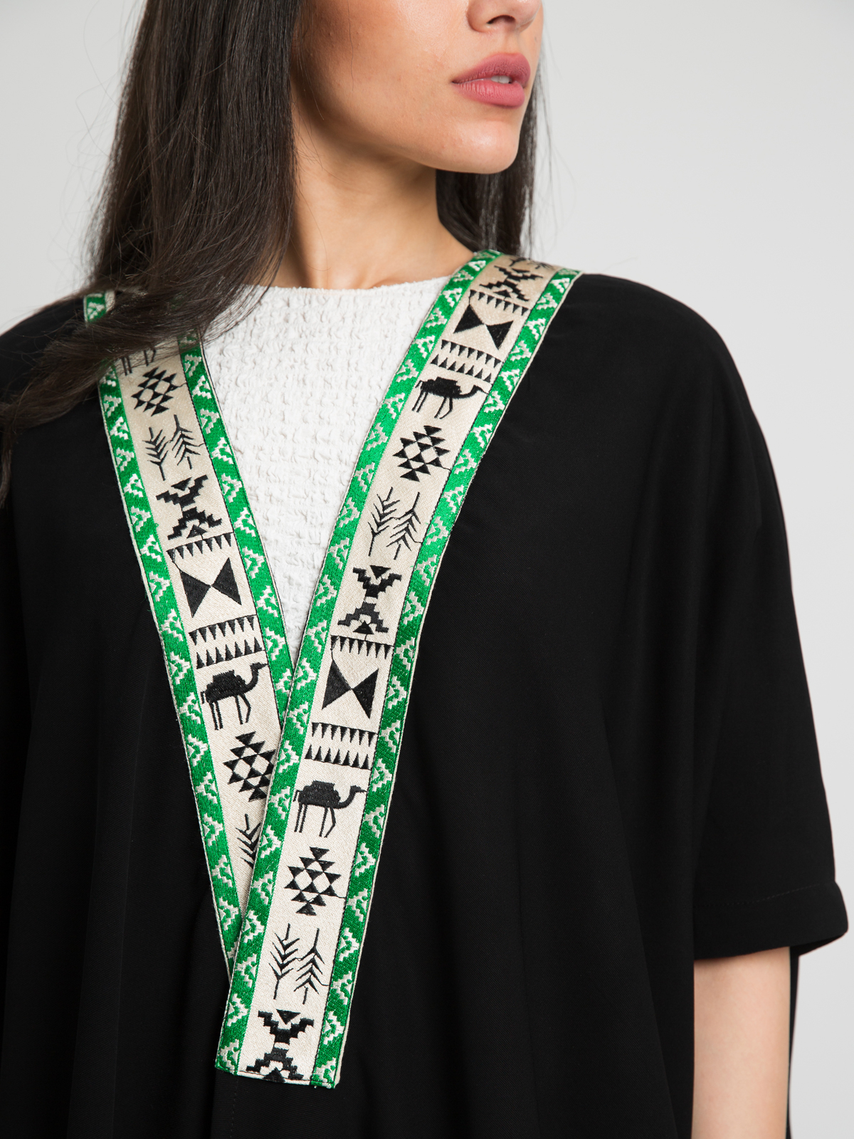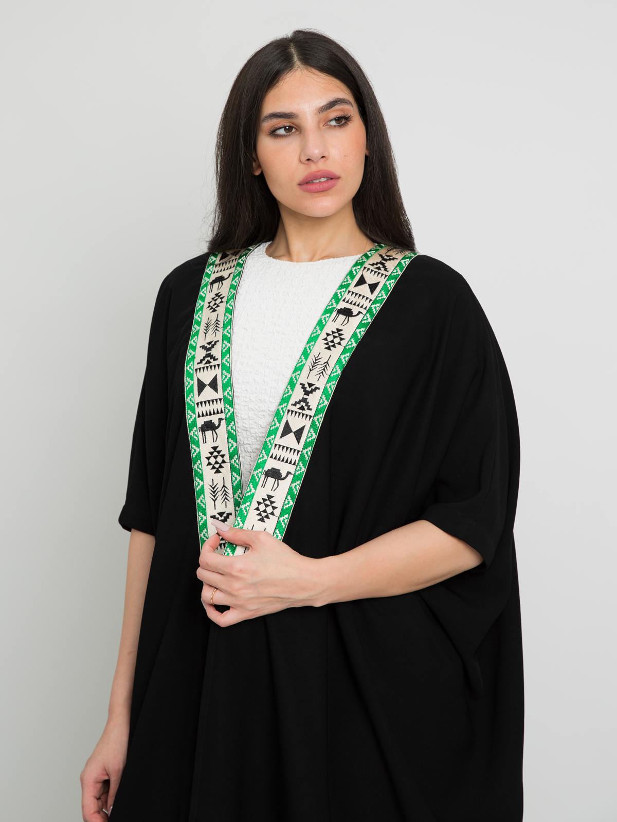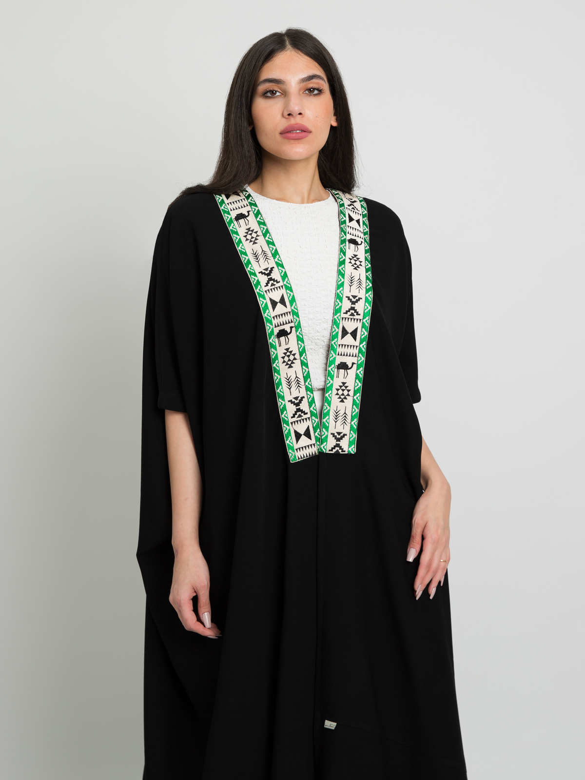 Black with Green Camel Kulfa - Elbow Length Bisht Abaya in Crepe Fabric