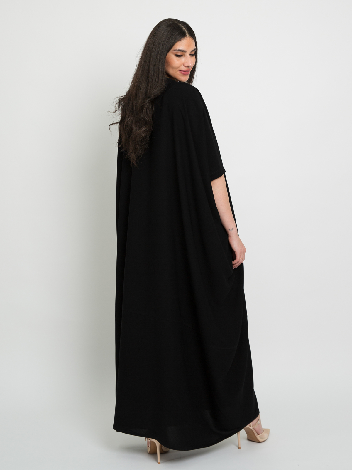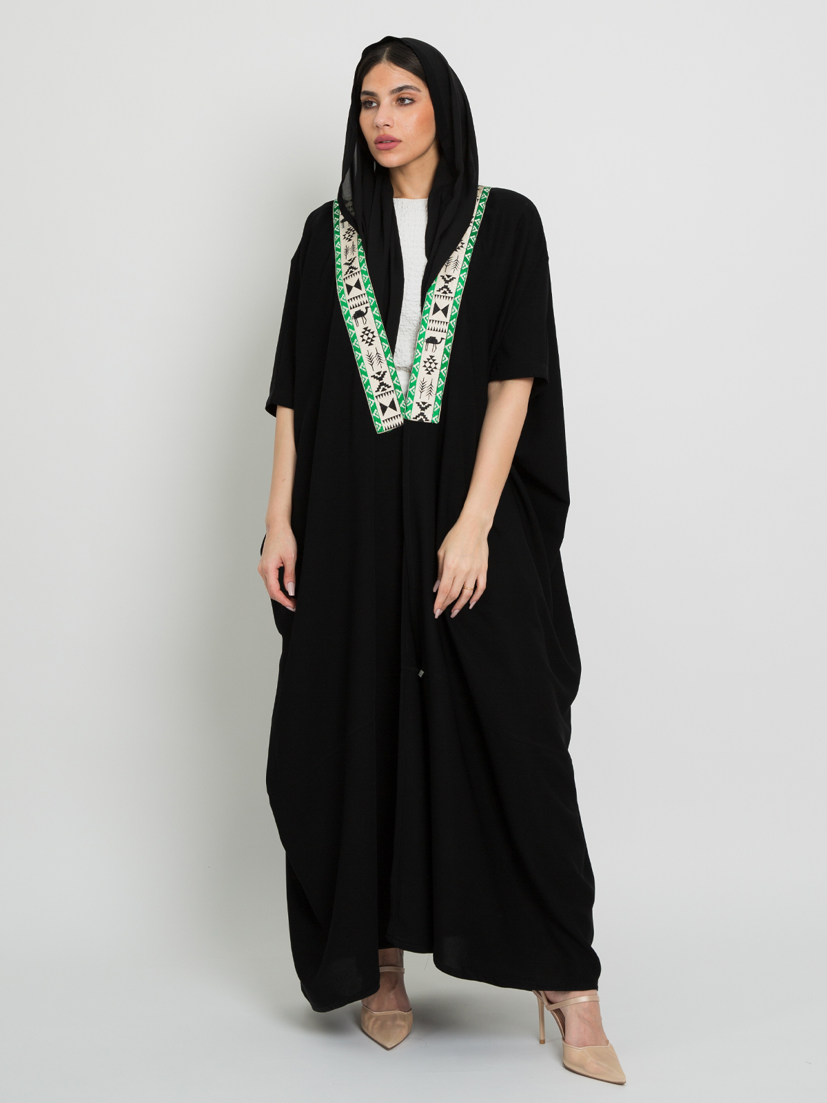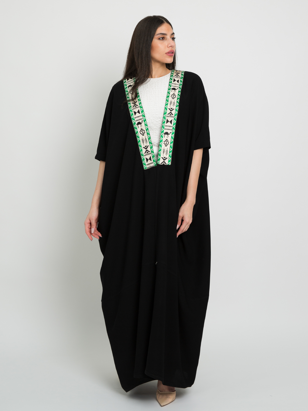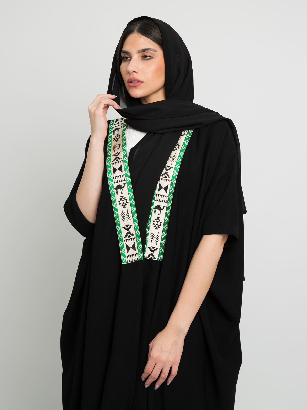 Black with Green Camel Kulfa - Elbow Length Bisht Abaya in Crepe Fabric