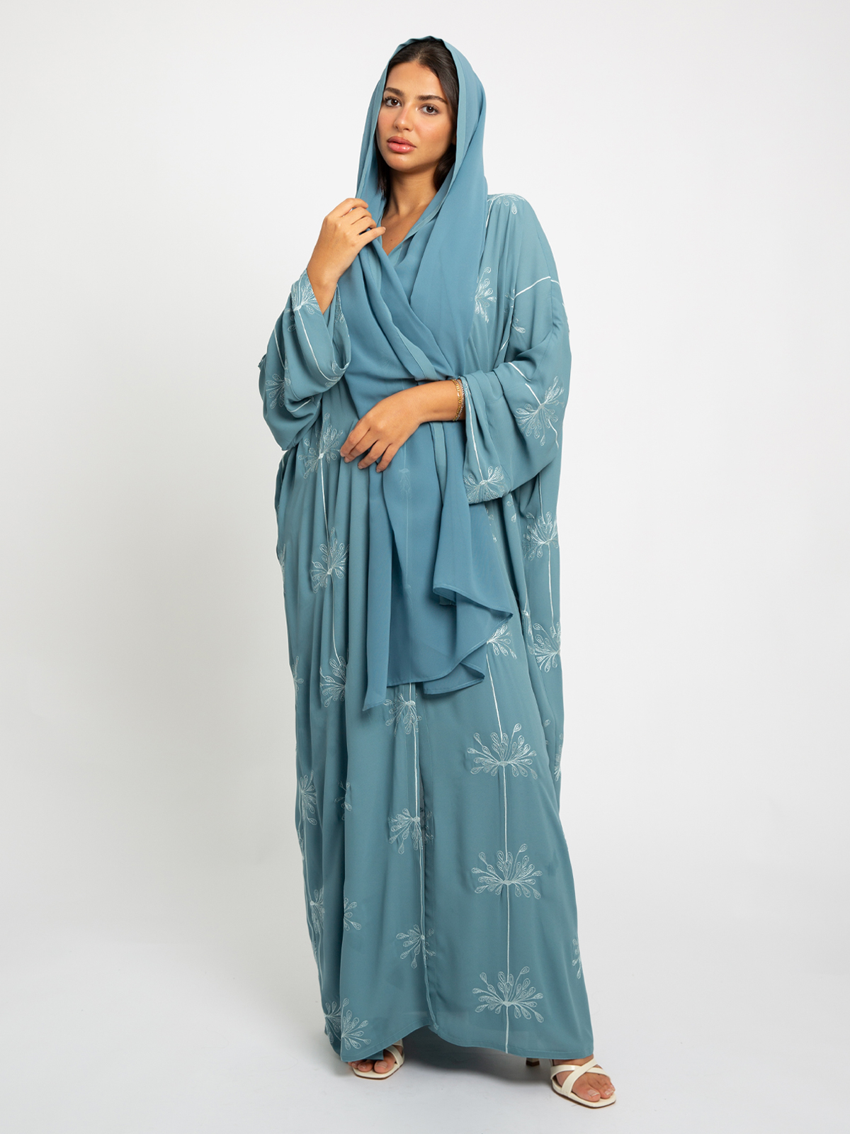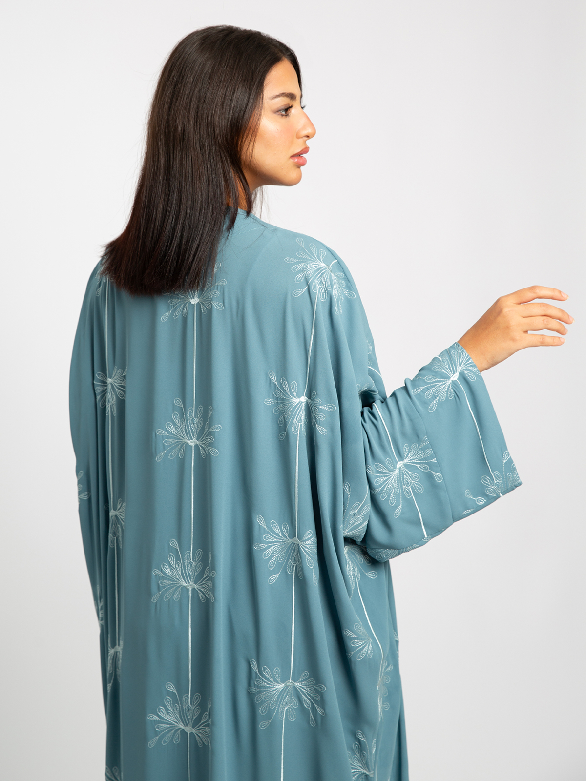 Wide-fit Long Open Abaya in Embroidered Light Crepe Fabric