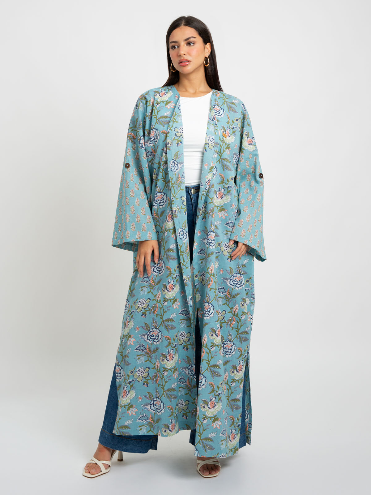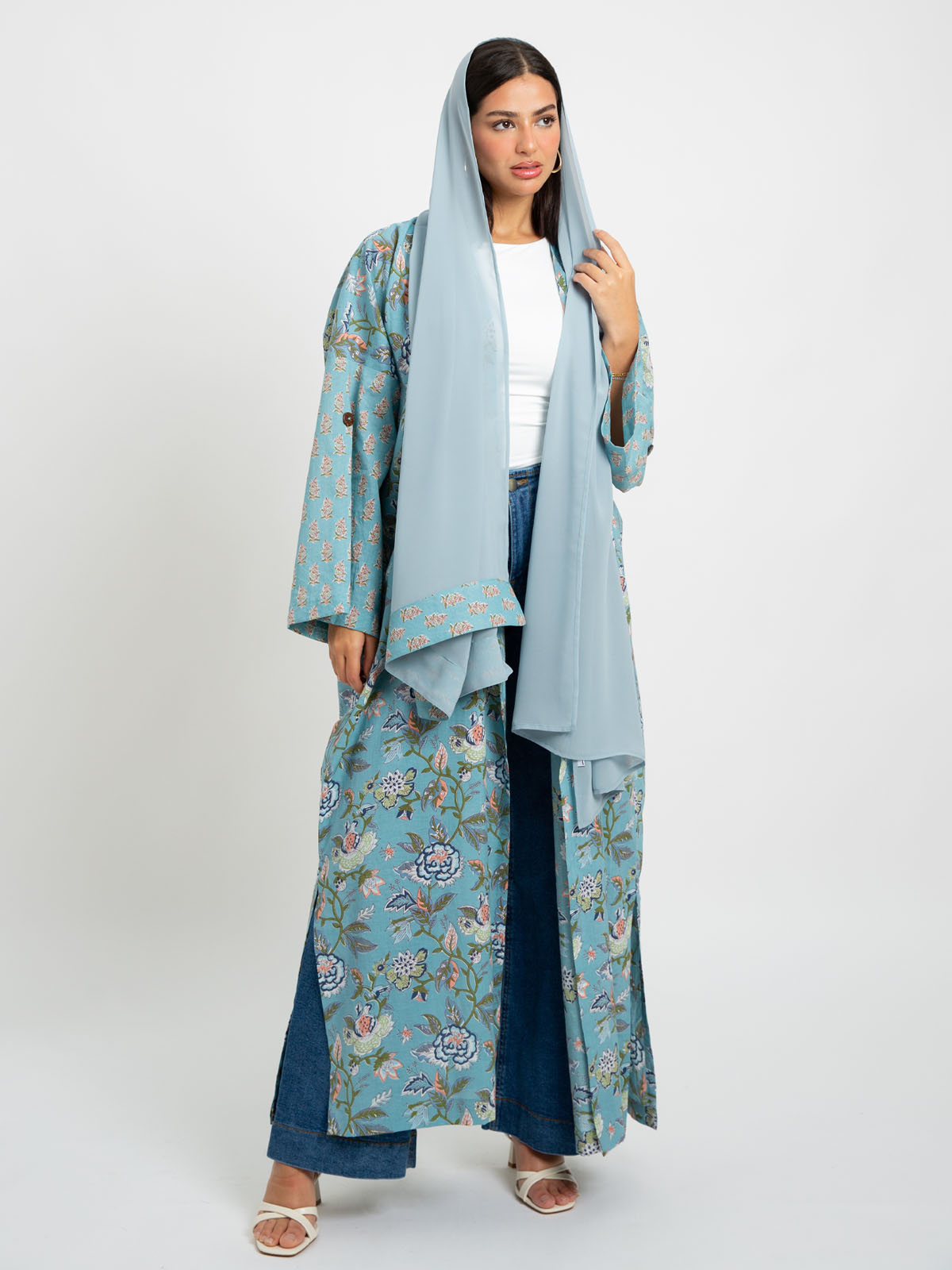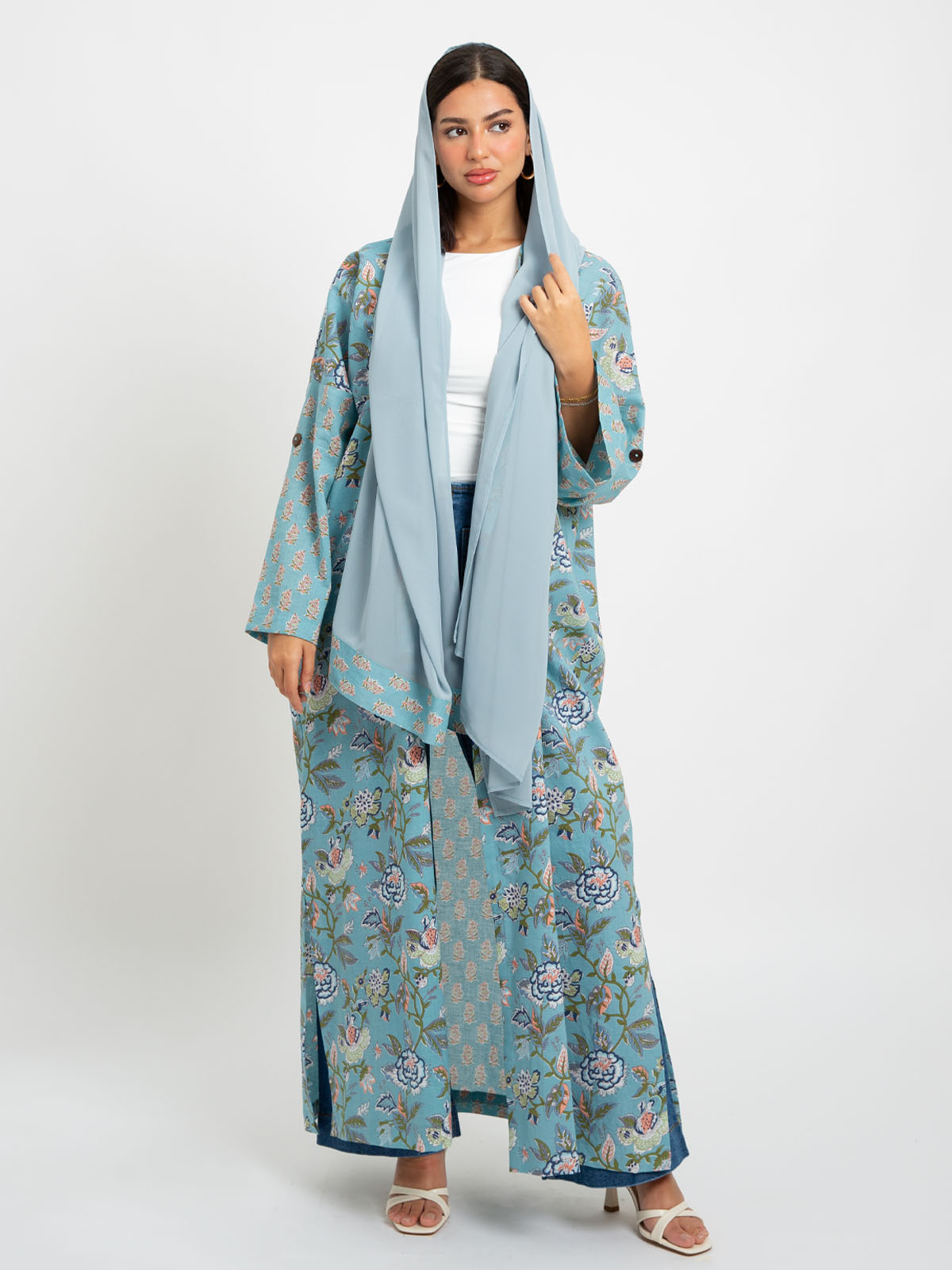Long Wide-fit Open Abaya in Printed Cotton Fabric