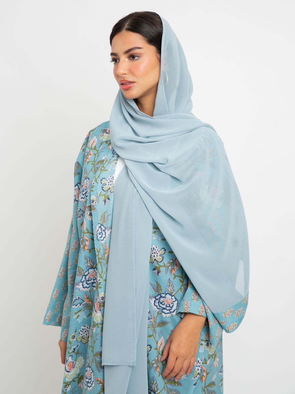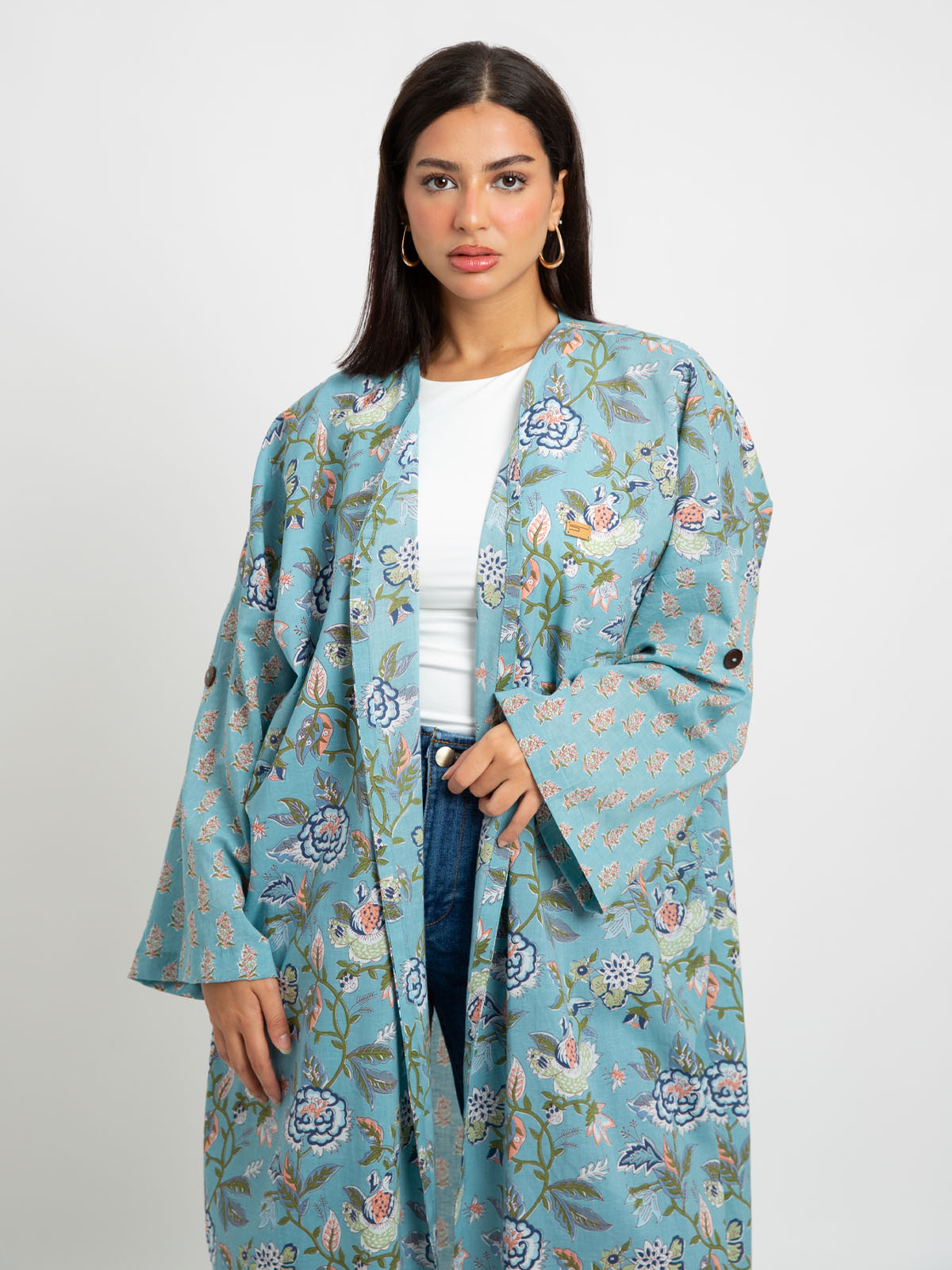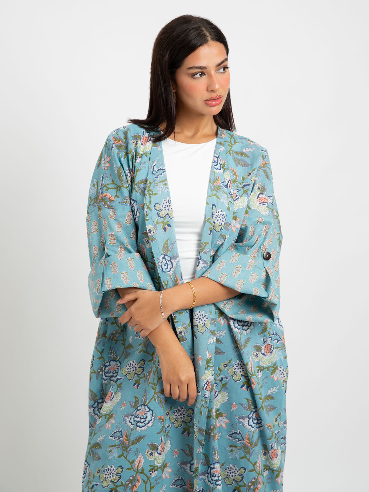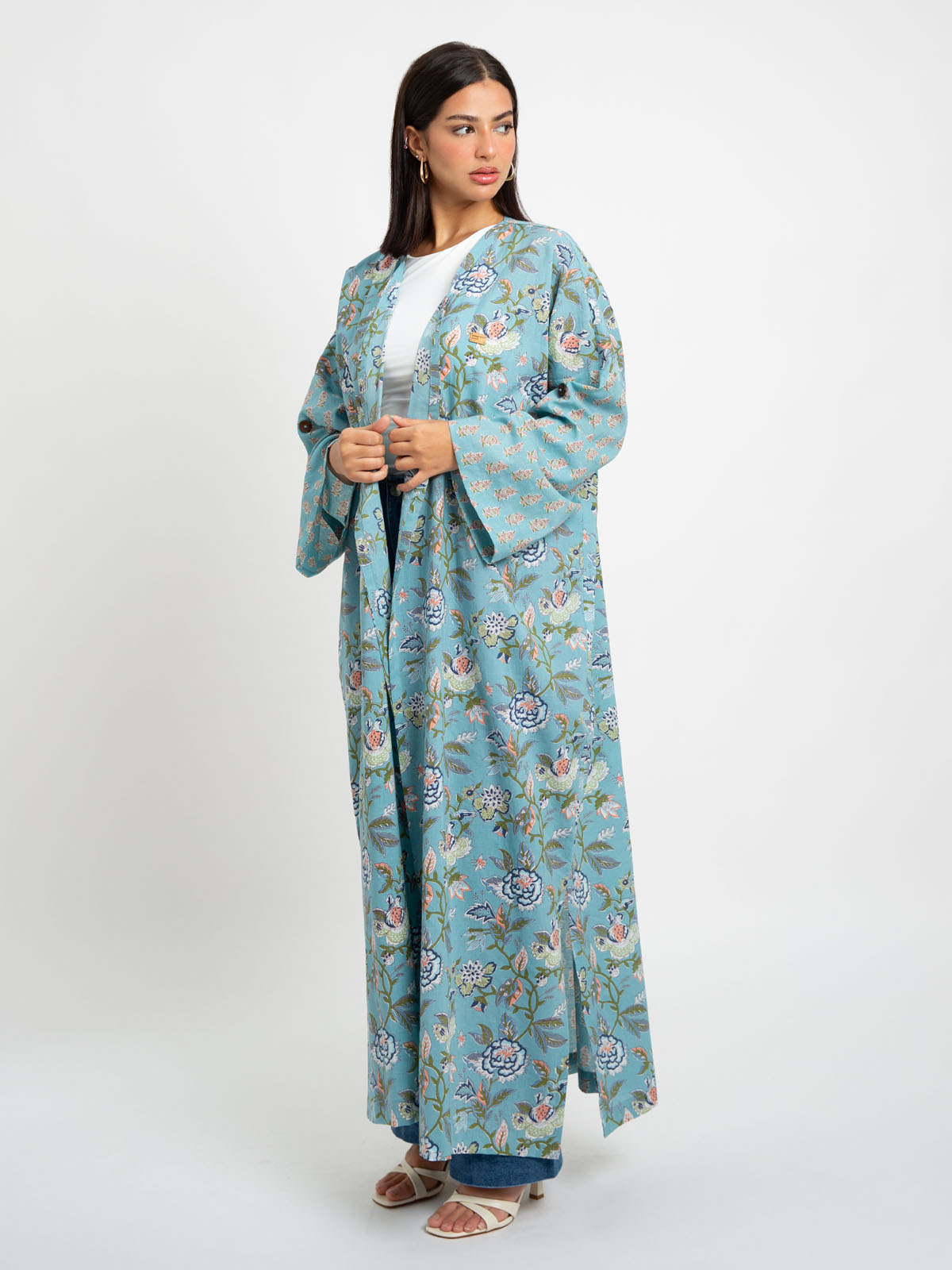 Long Wide-fit Open Abaya in Printed Cotton Fabric