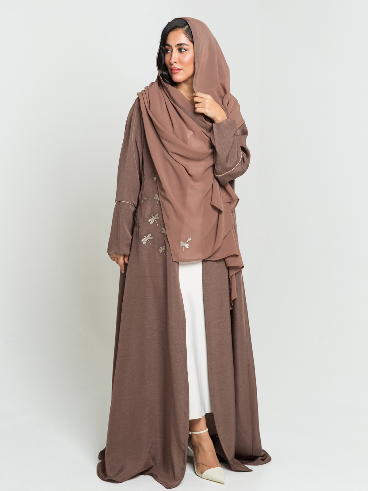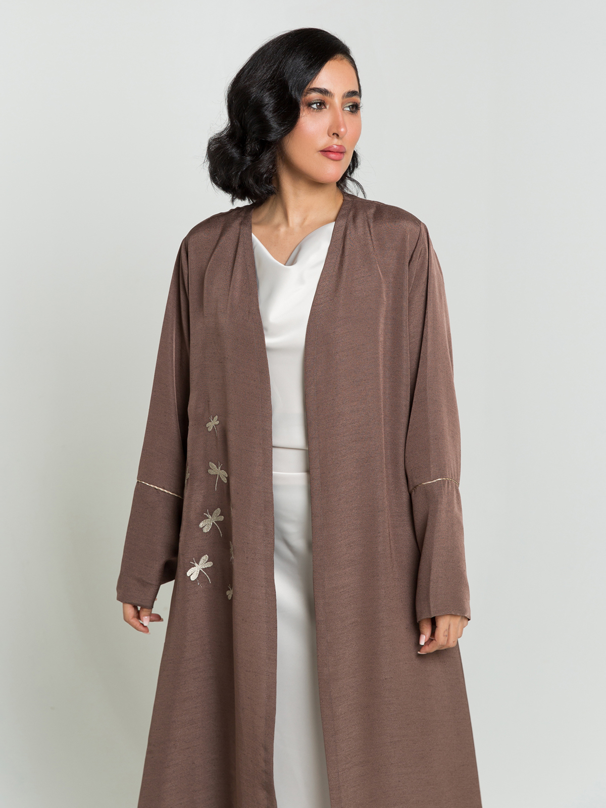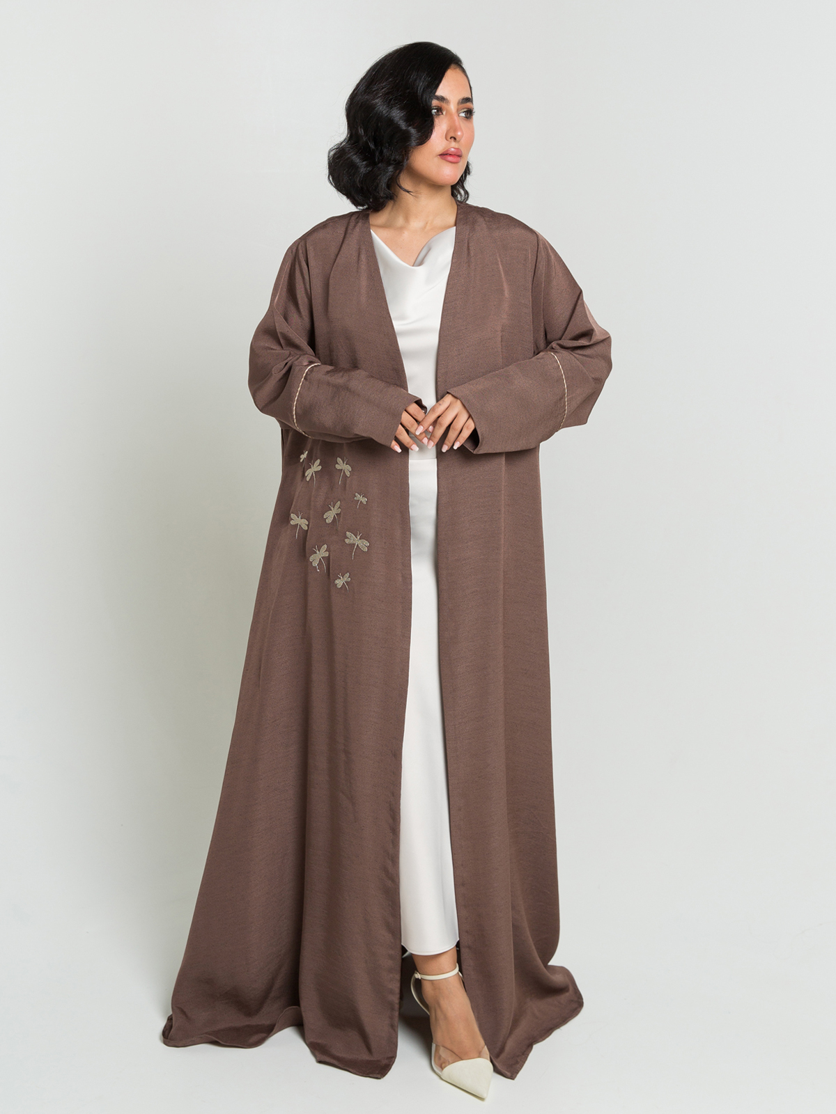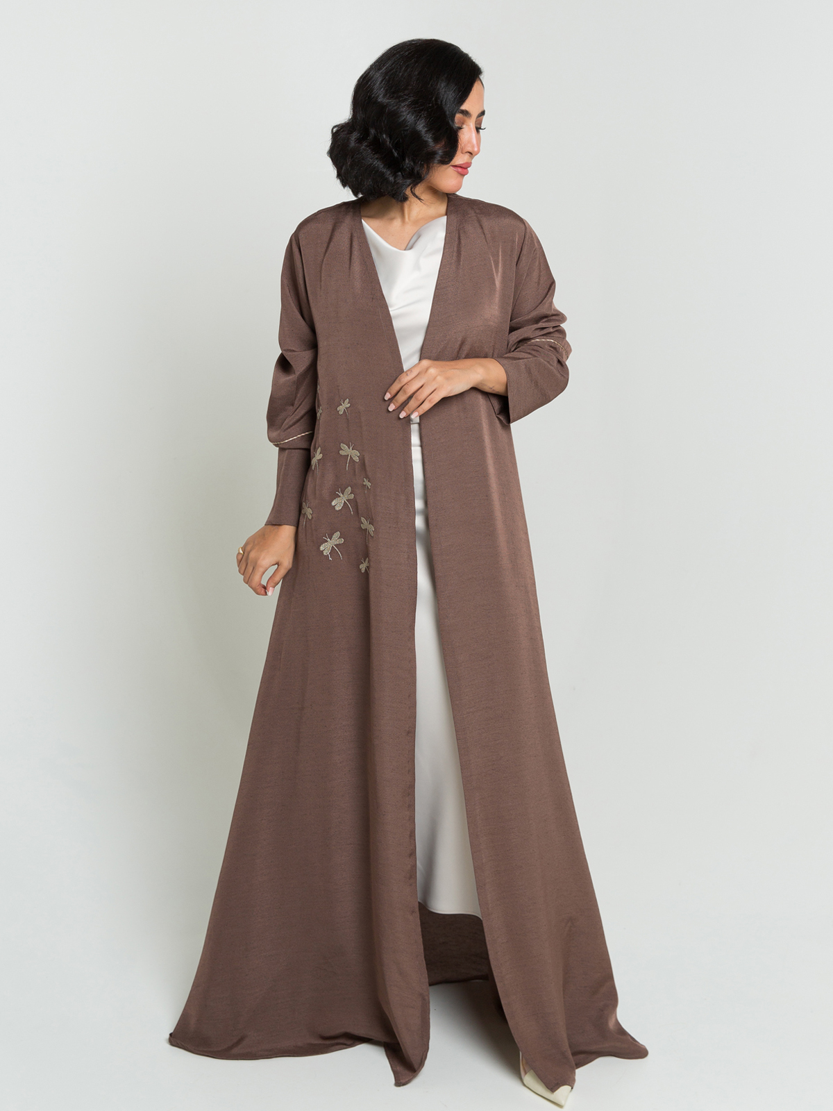 Brown Dragonfly Dance Embroidery A-Cut Abaya