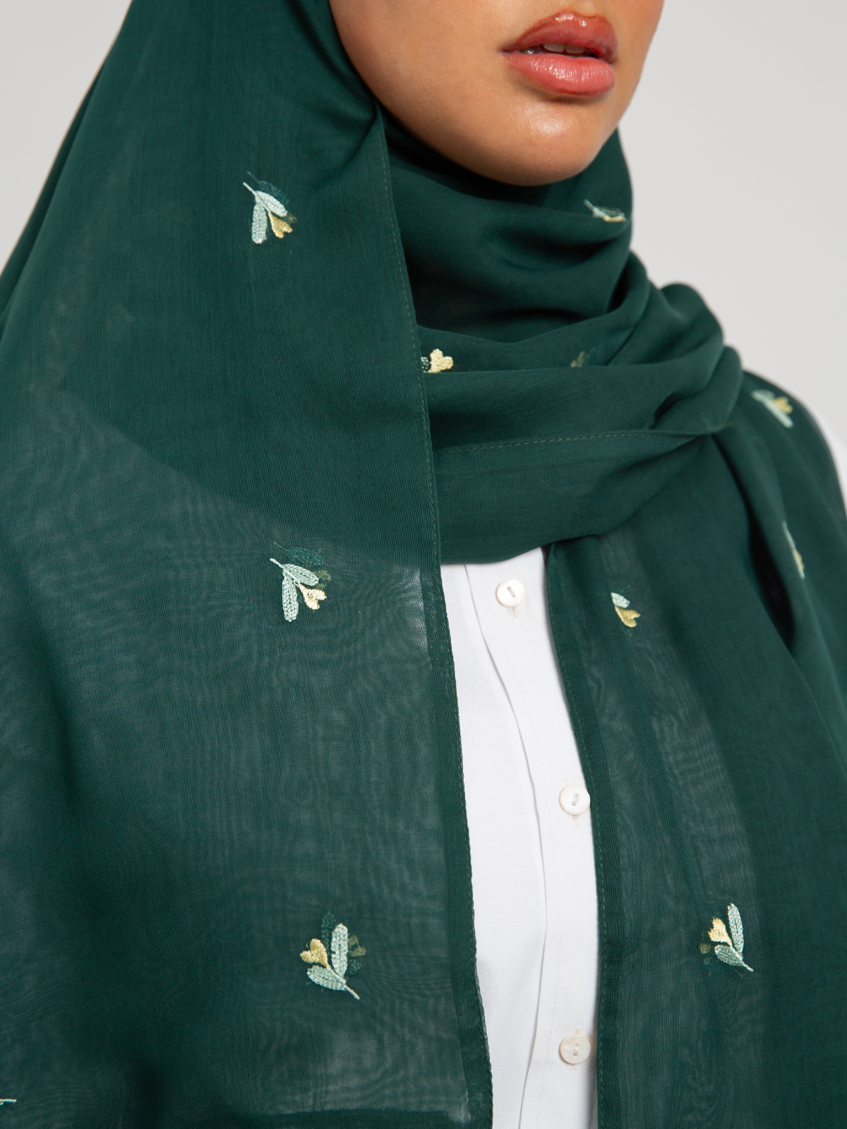 Hijab color: Dark Green Tarha with Heart Flower Embroidery.