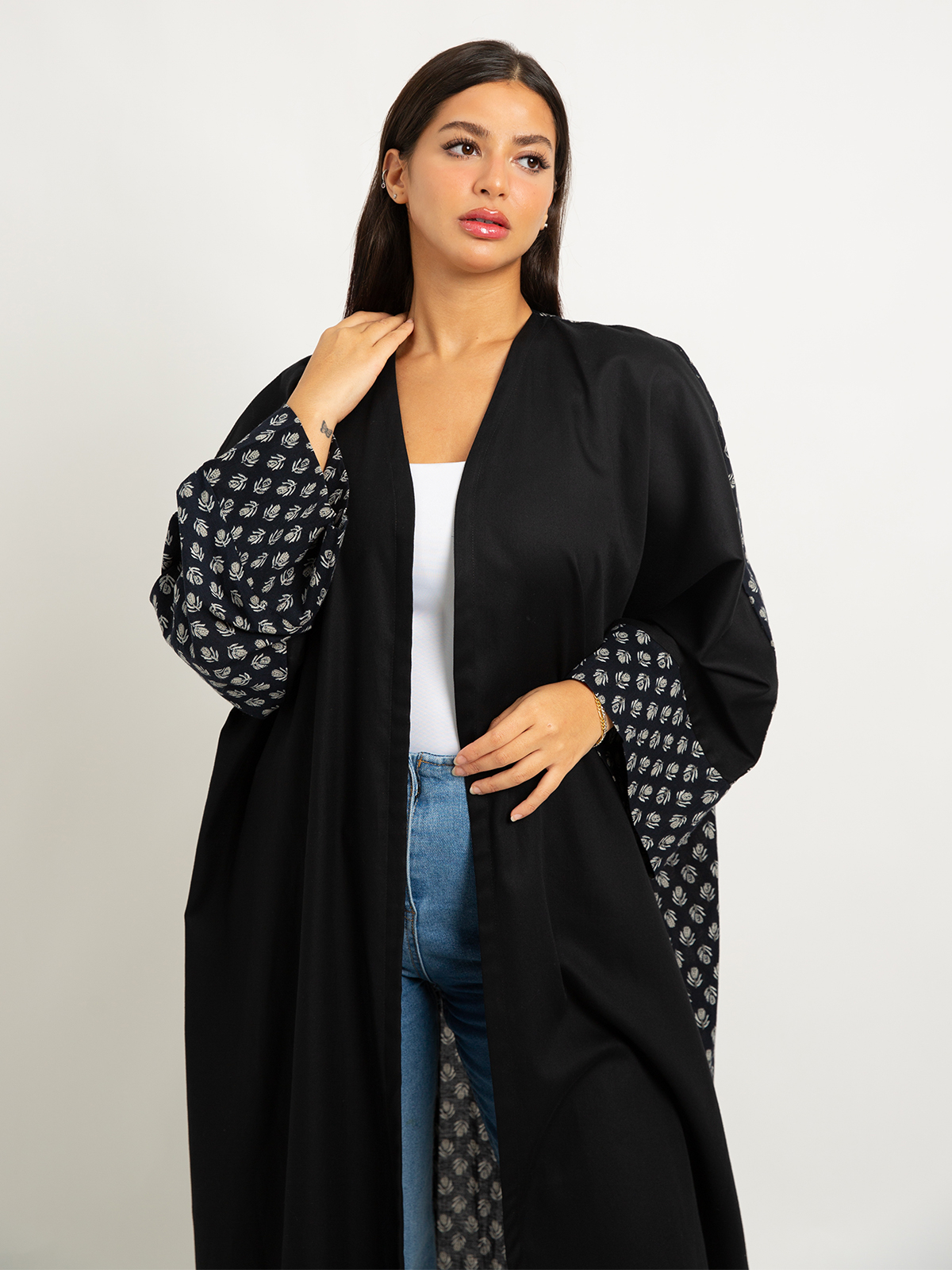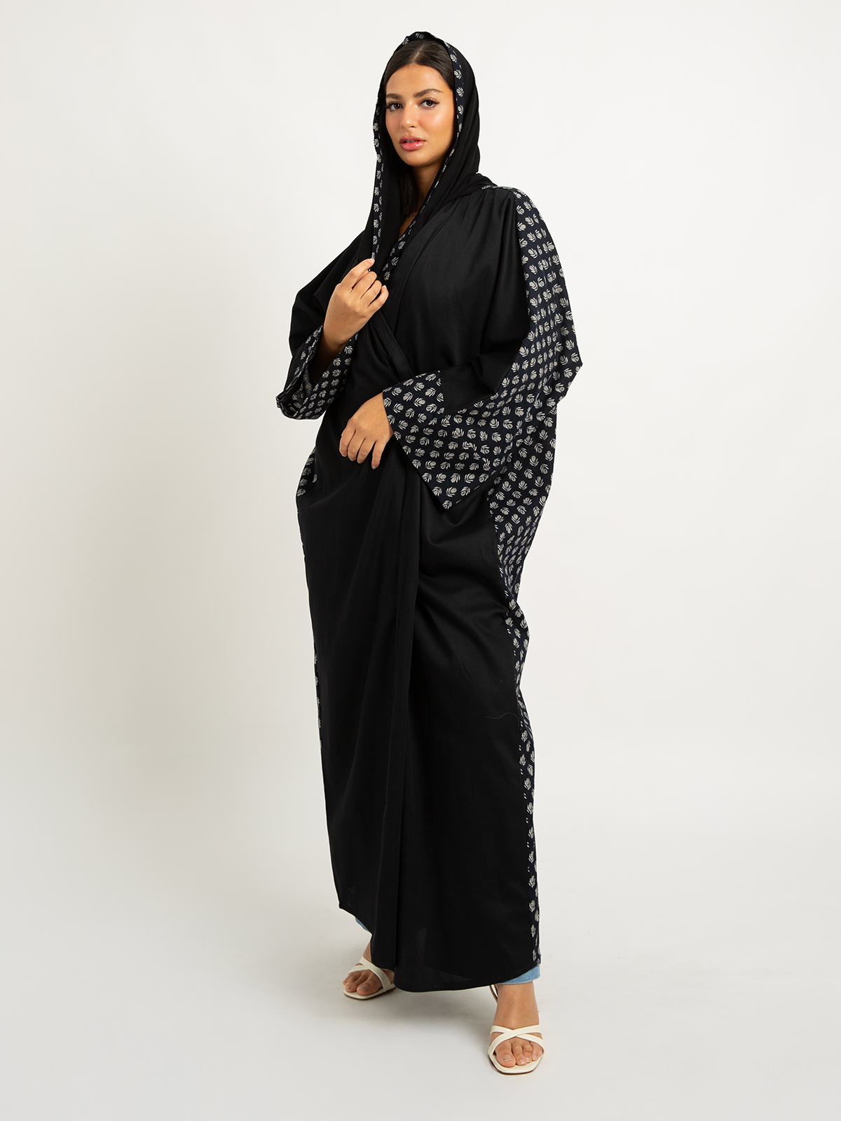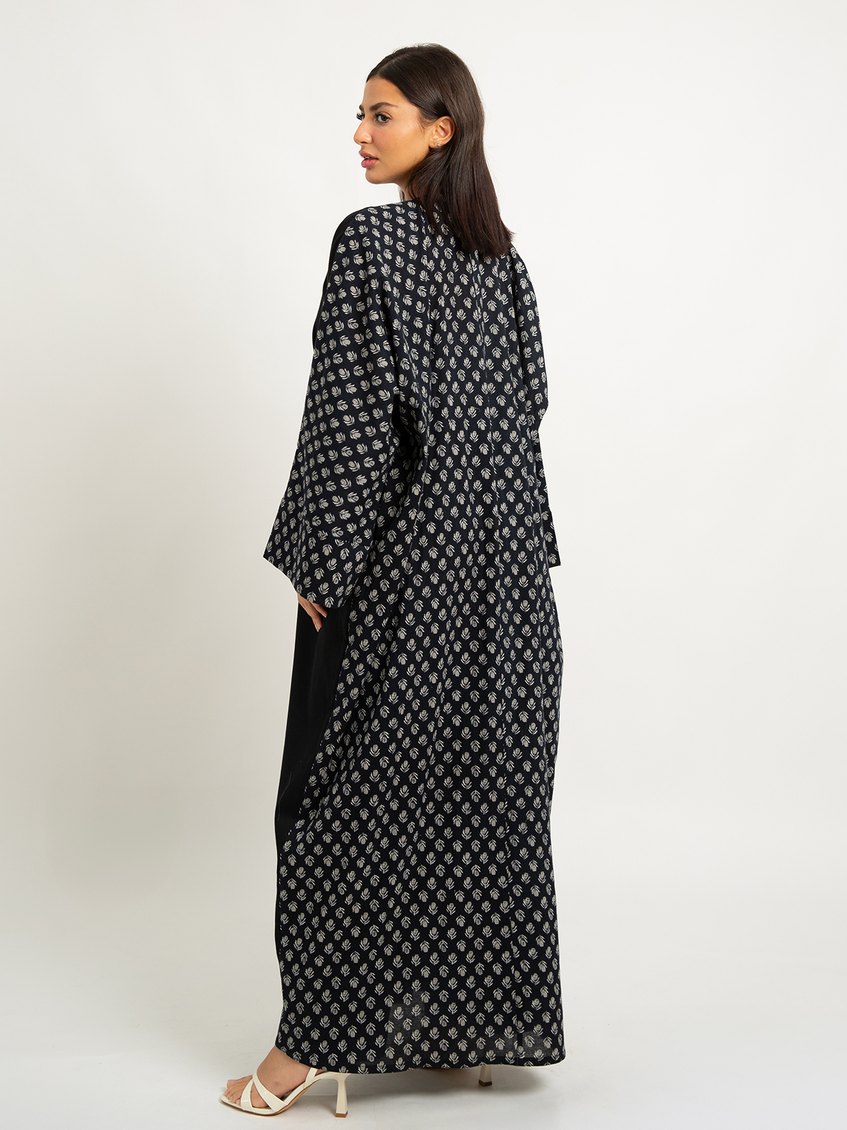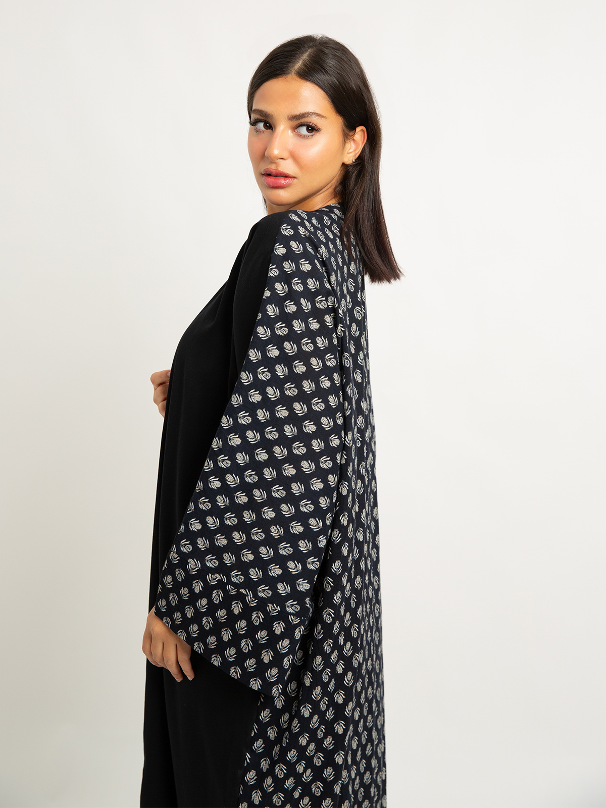 Wide-fit Long Open Abaya in Printed Cotton Fabric