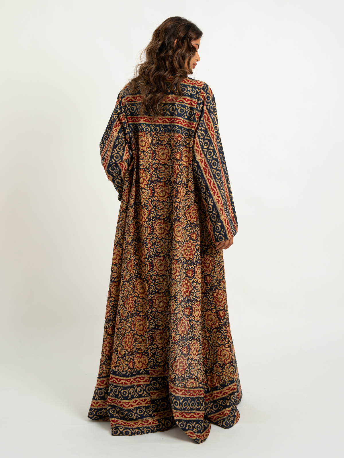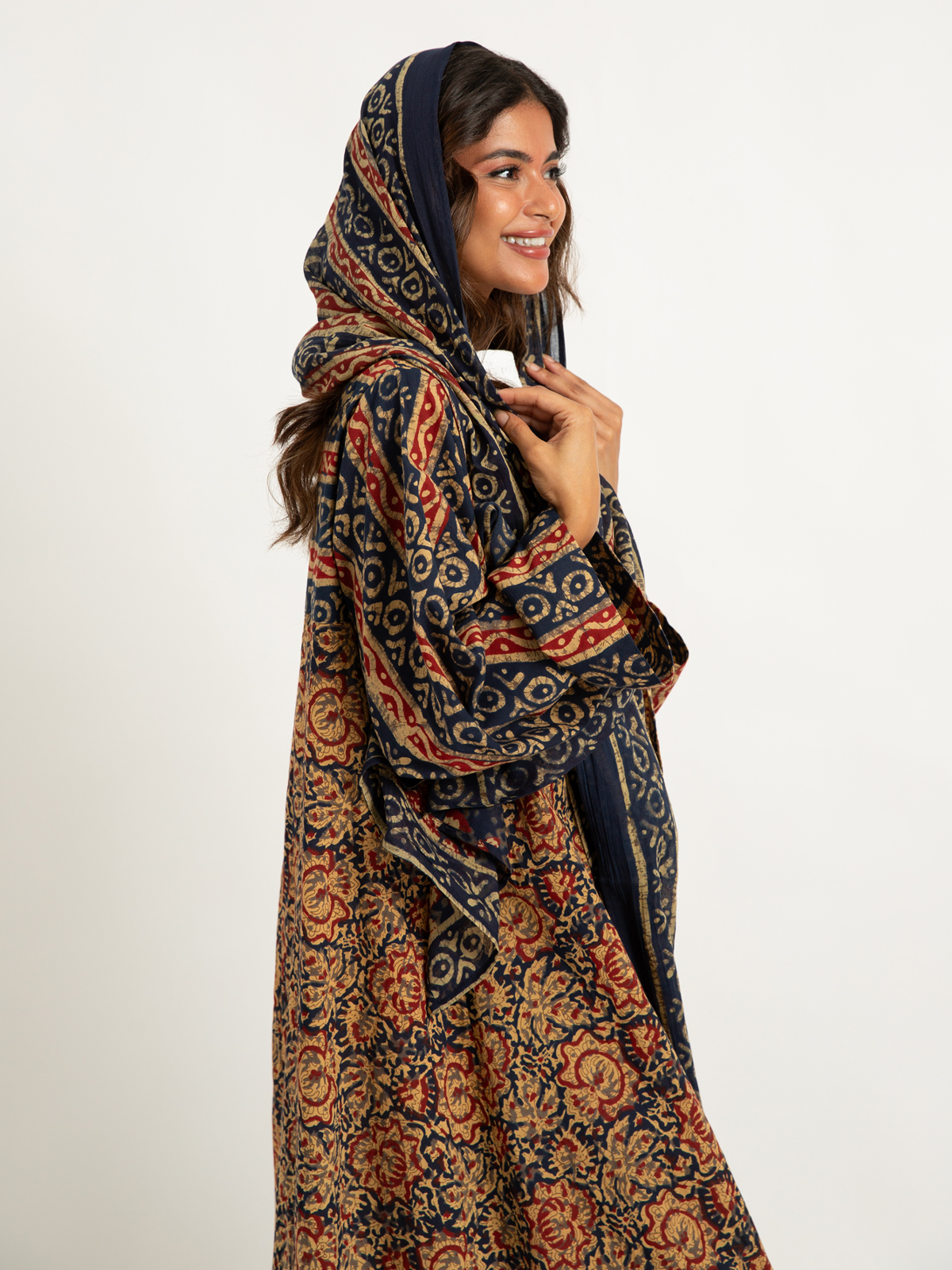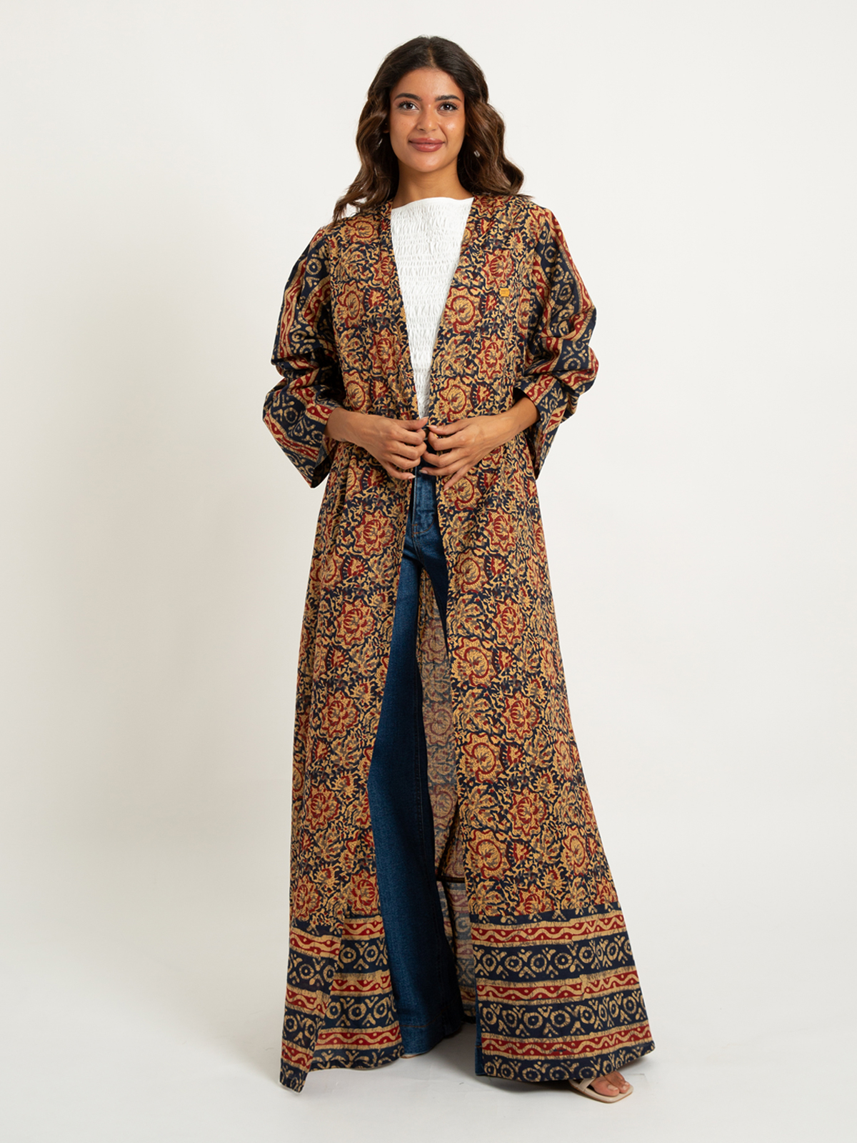 Half Cloche A-Cut Long Open Abaya in Printed Cotton Fabric