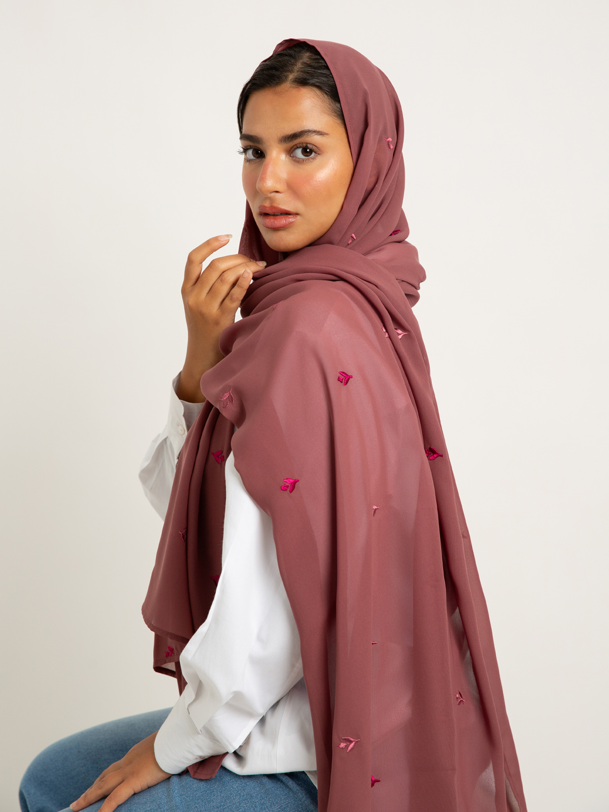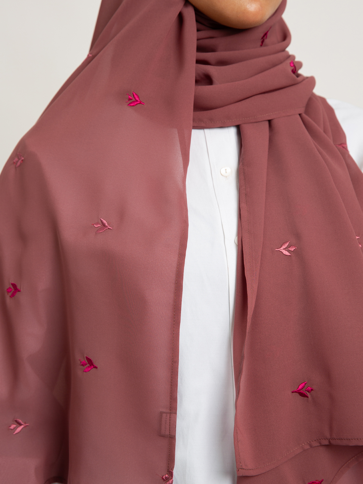 Hijab color: Dusty Rose with Flower Petals Embroidery.