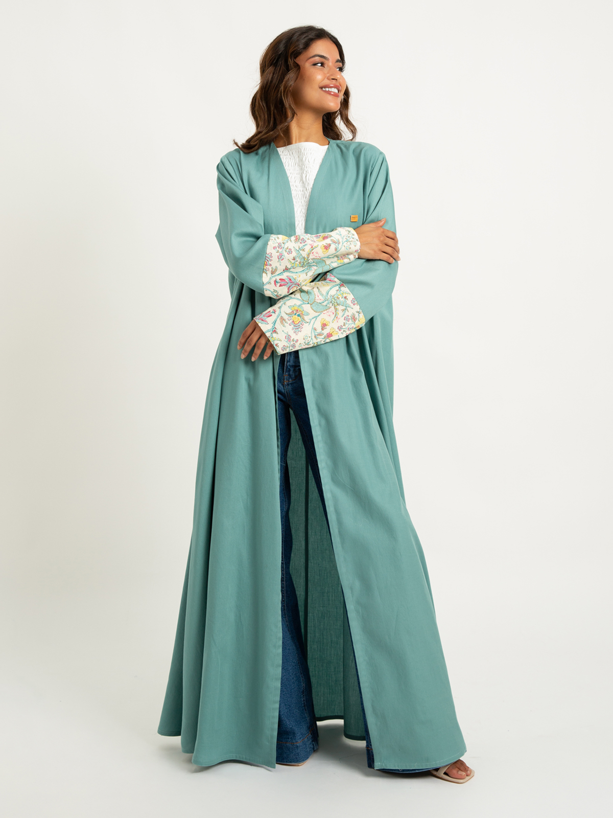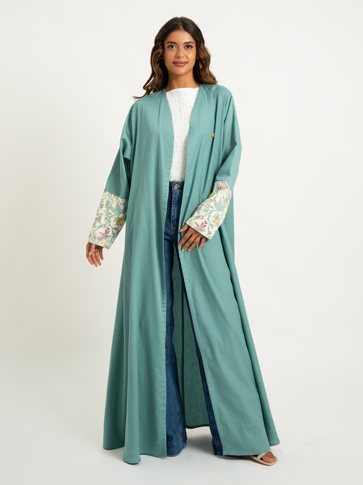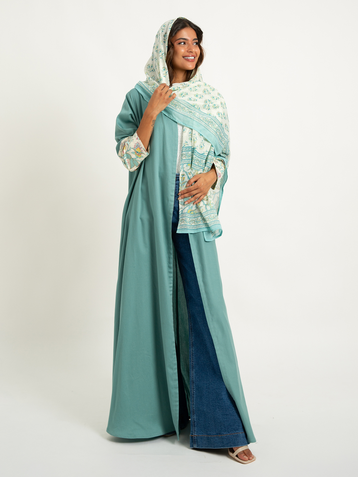 A breezy, relaxed-fit A-cut half cloche abaya made of 100% natural cotton, designed with comfort and attention to detail in mind.