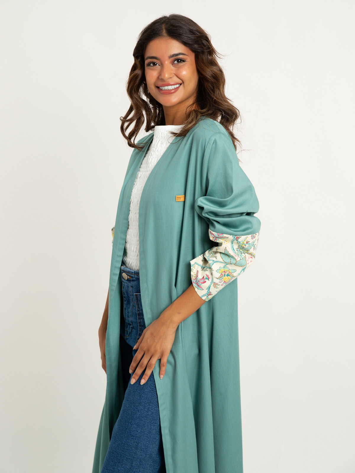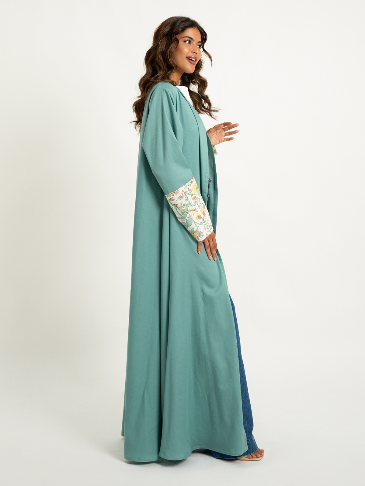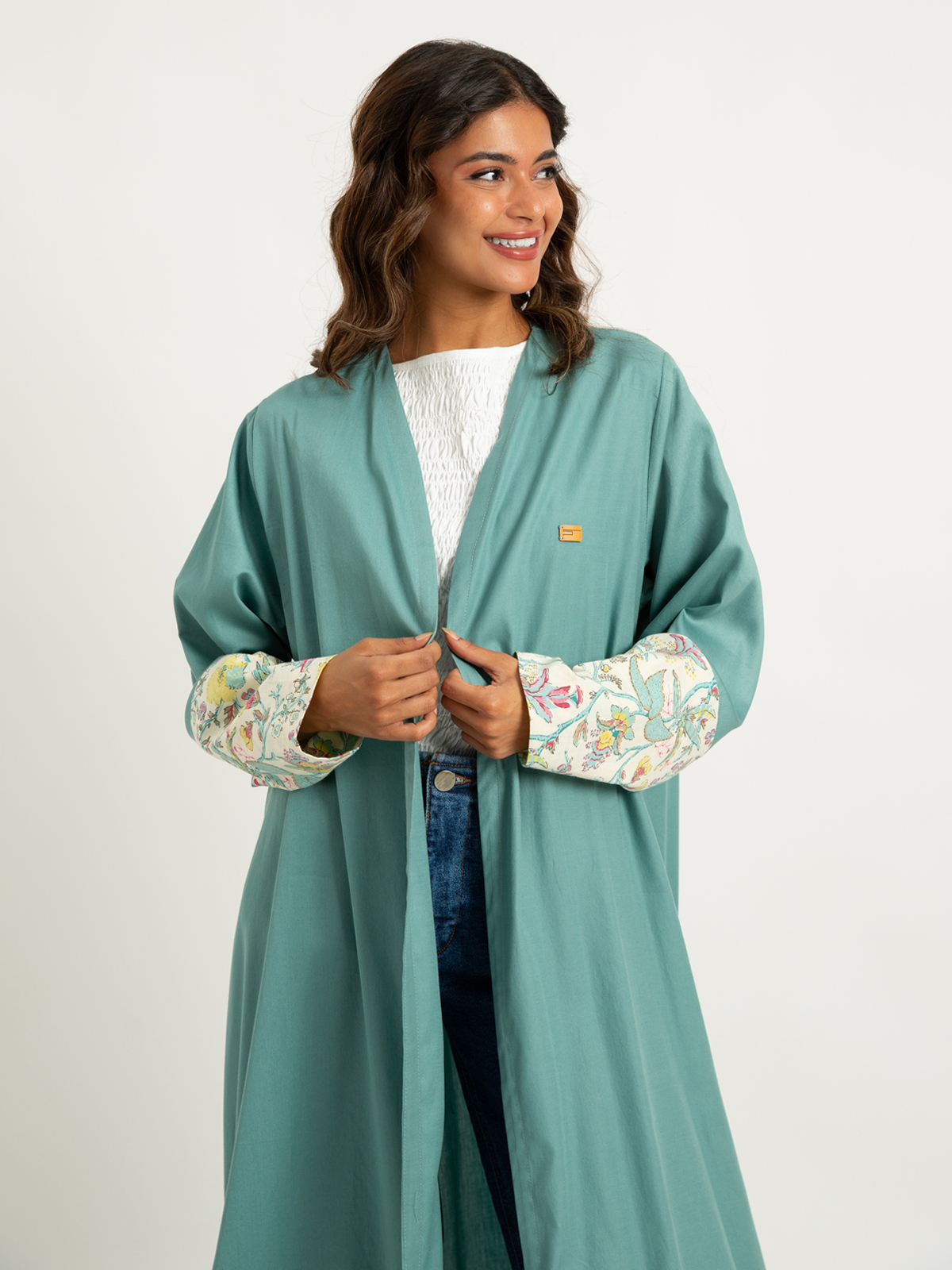 A breezy, relaxed-fit A-cut half cloche abaya made of 100% natural cotton, designed with comfort and attention to detail in mind.