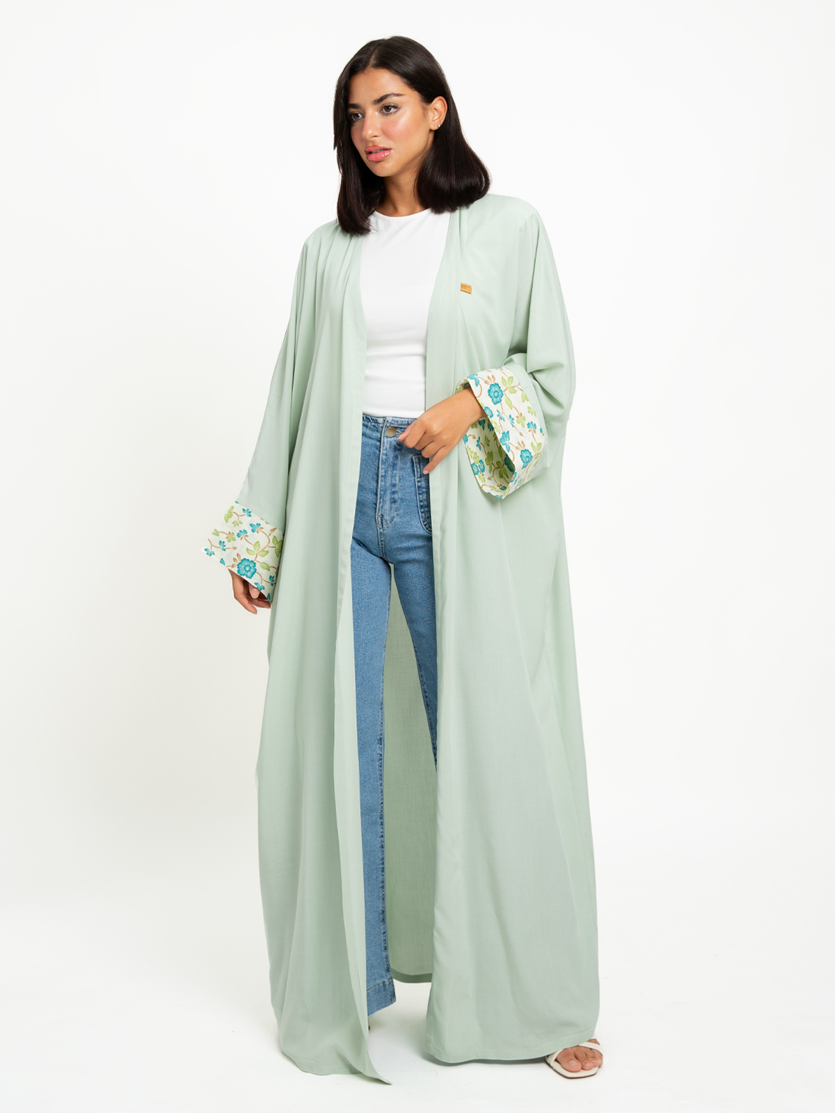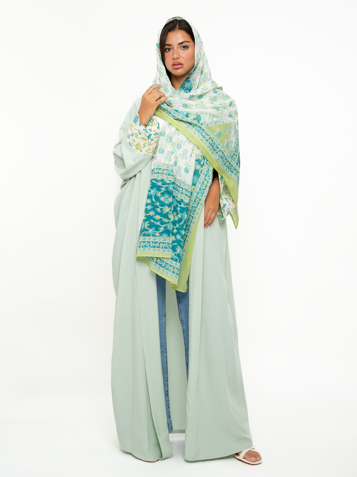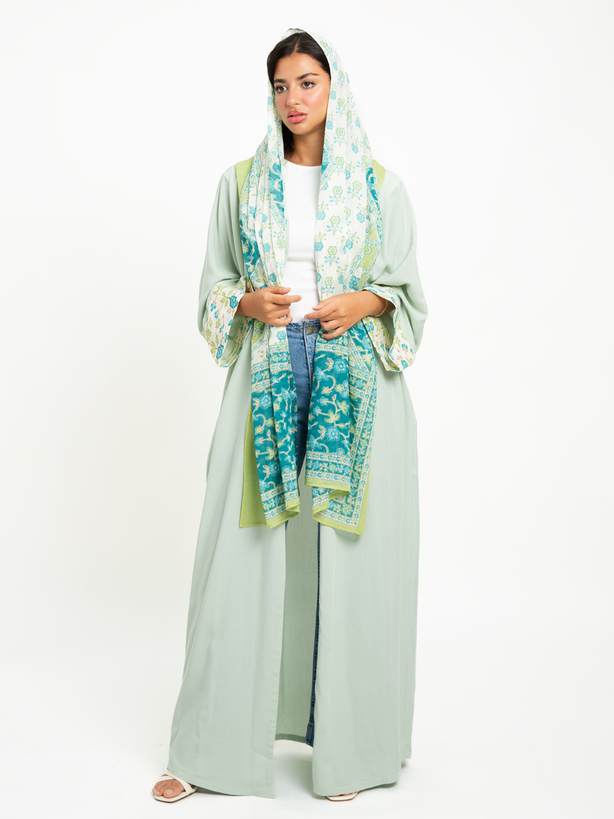 Wide-fit Long Open Abaya in Printed Cotton Fabric