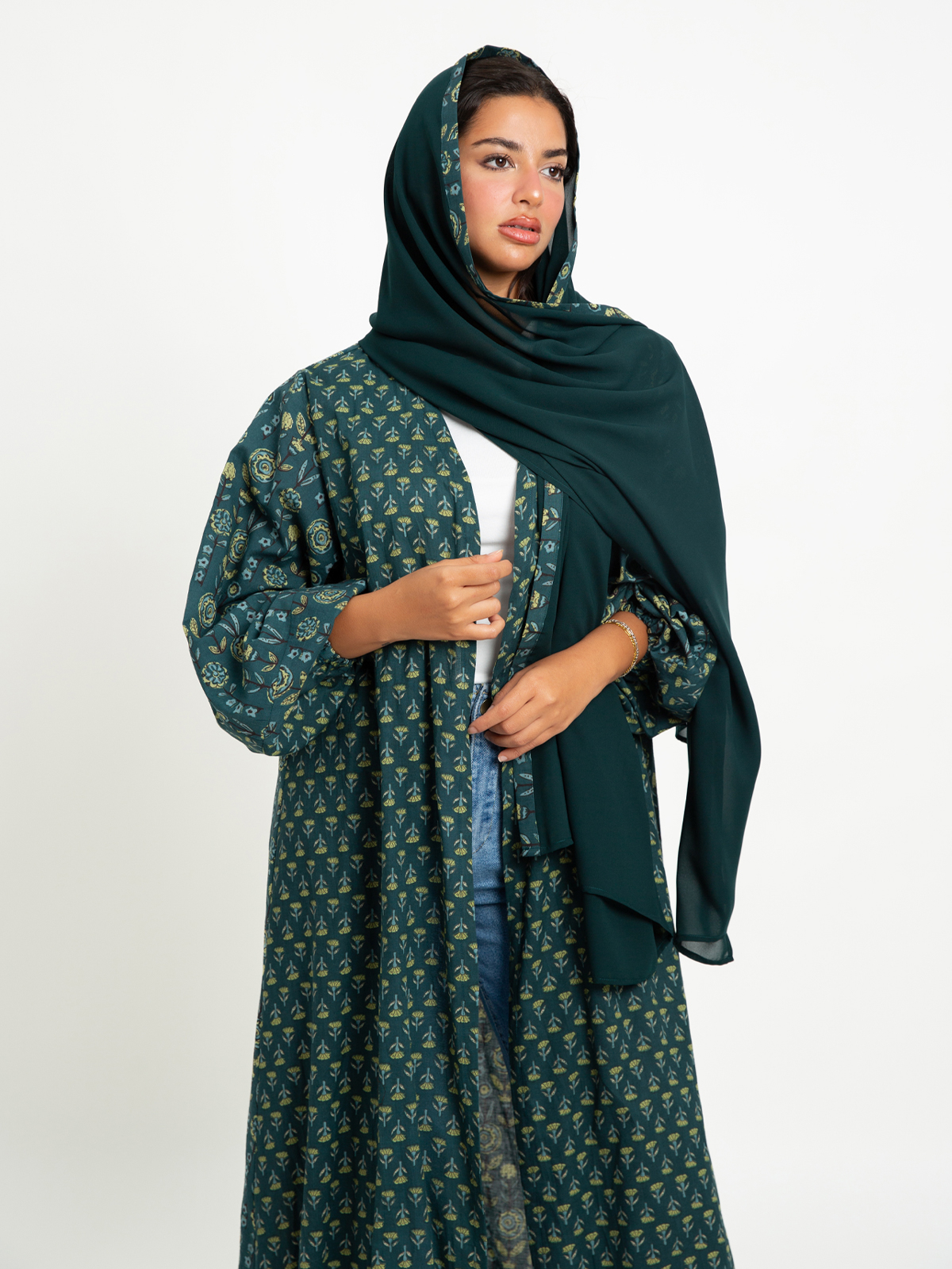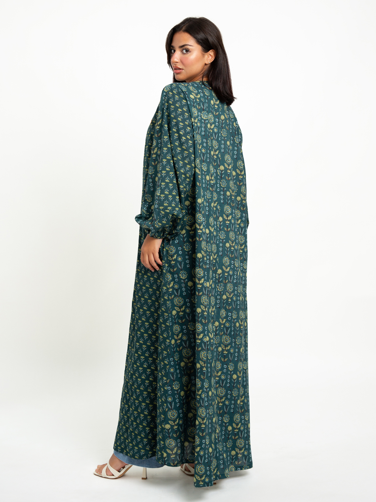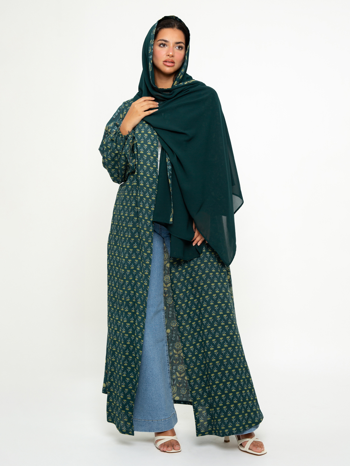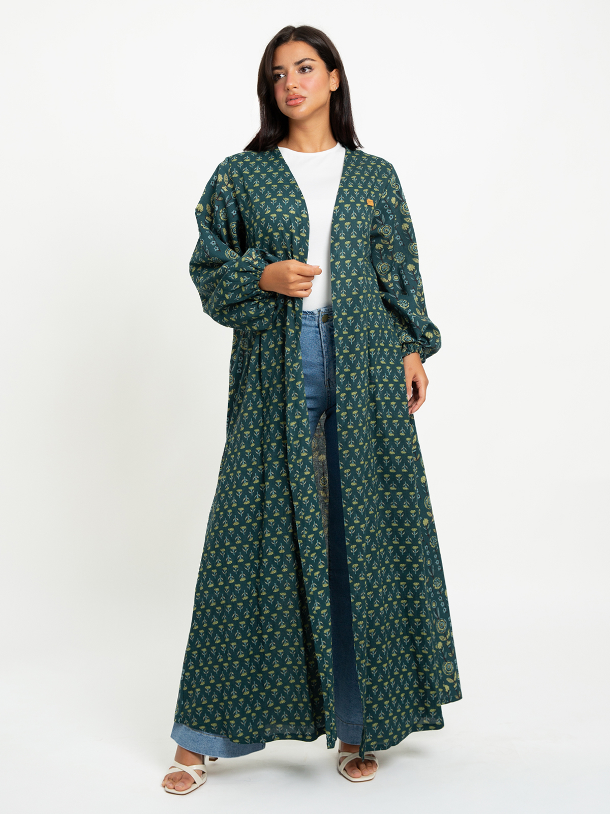 Half Cloche A-Cut Long Open Abaya in Printed Cotton Fabric
