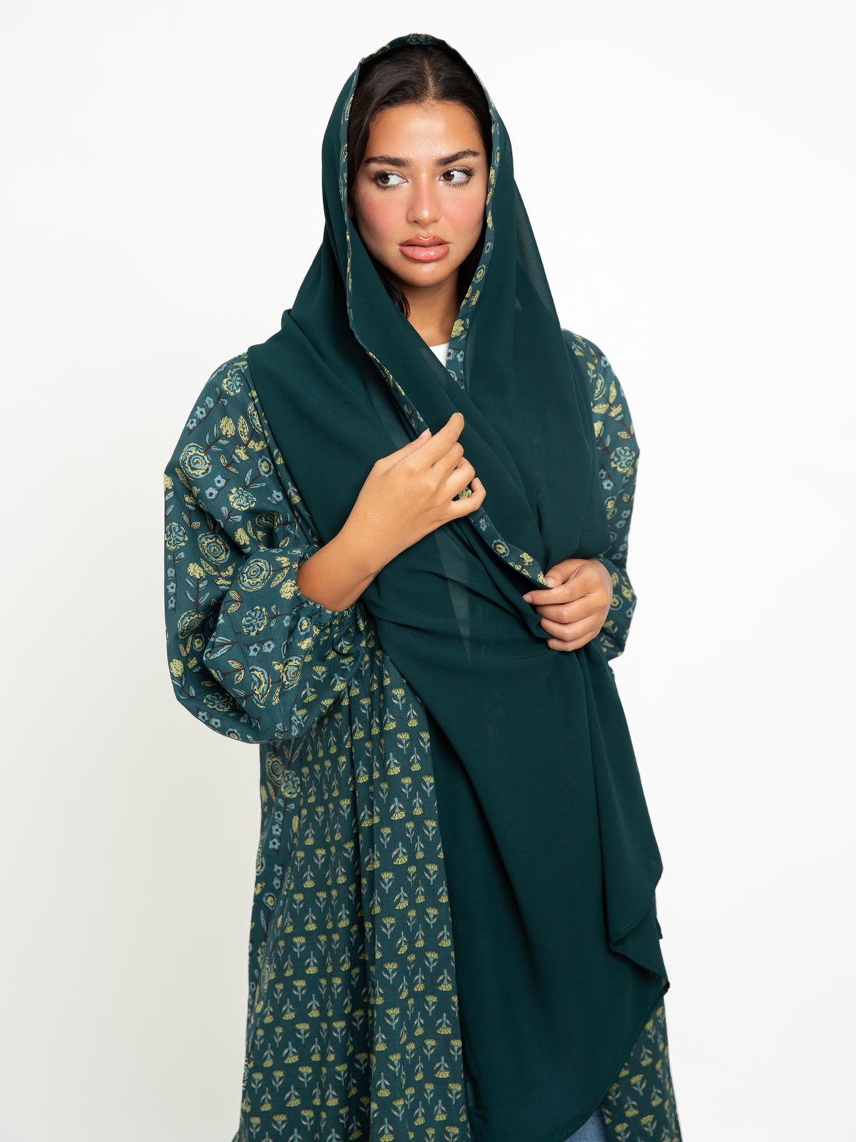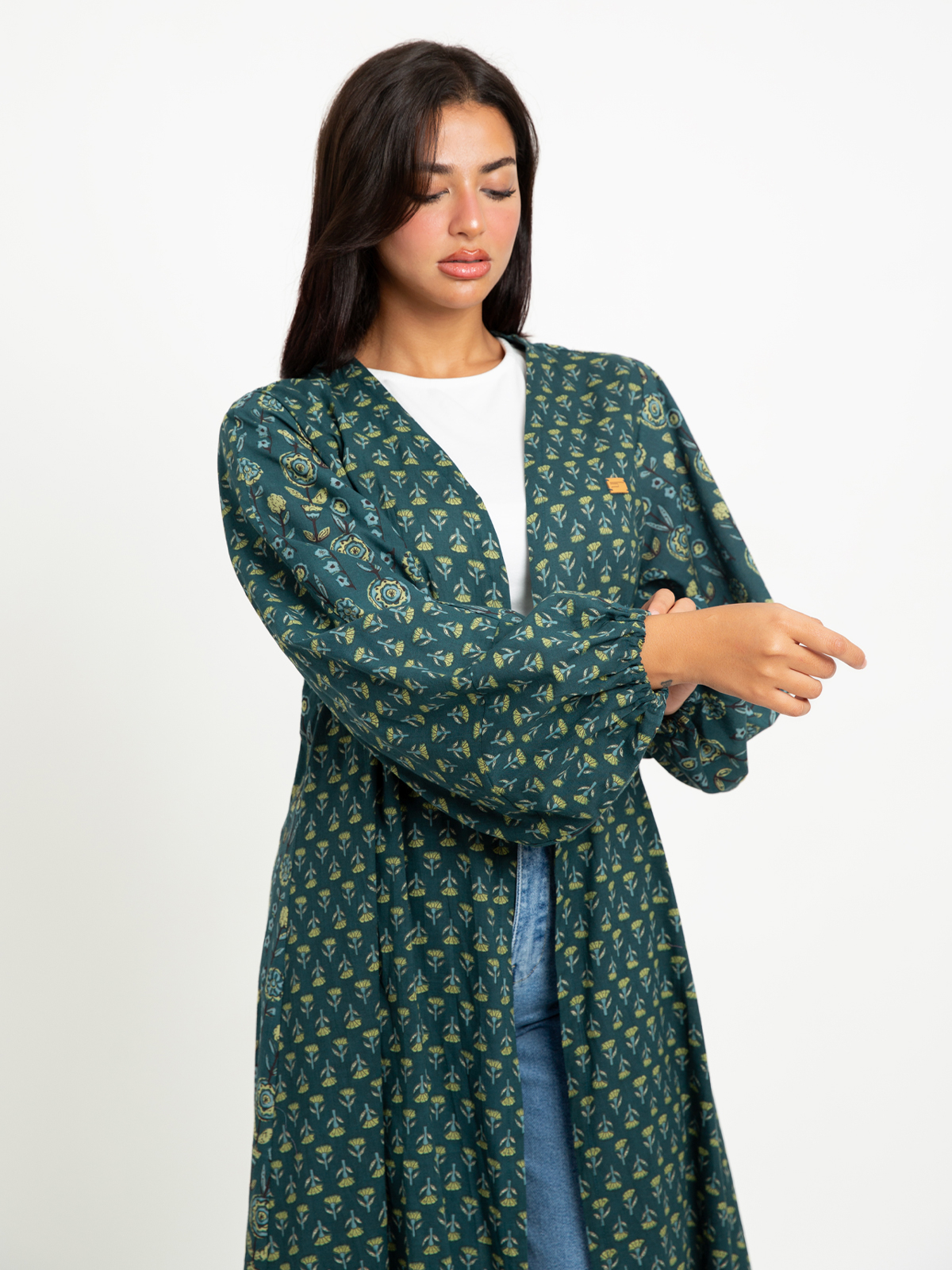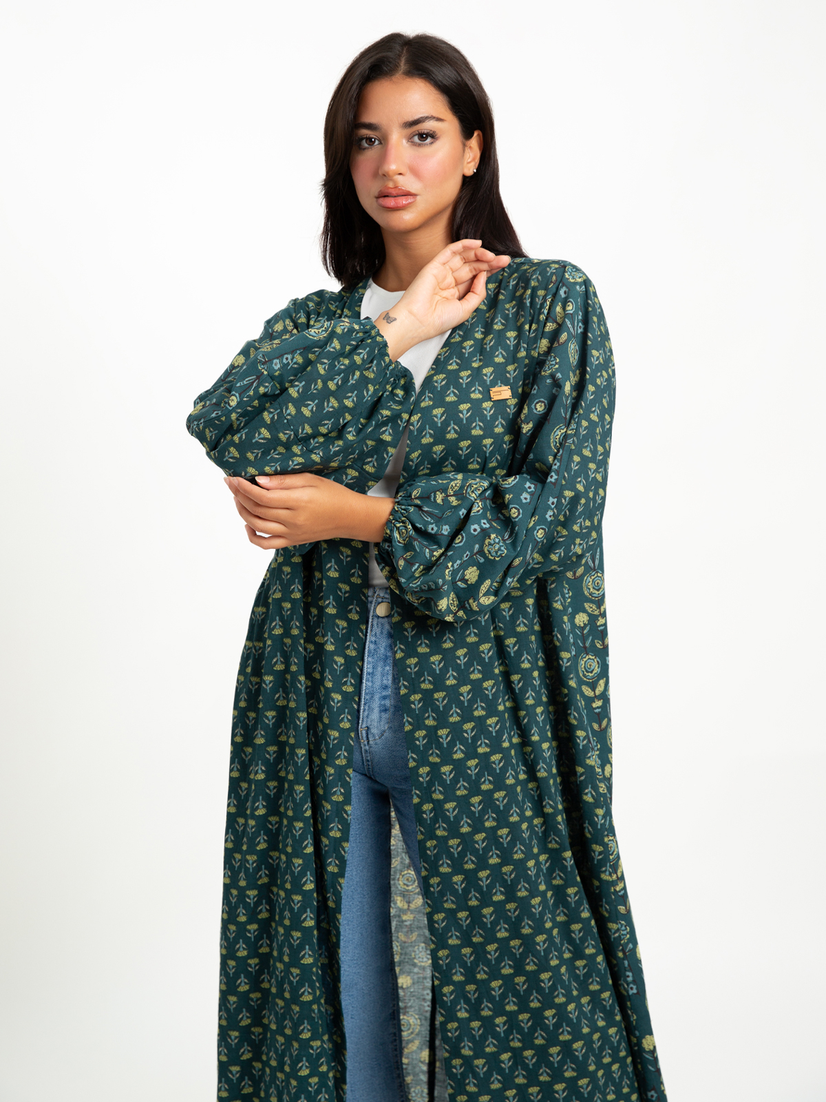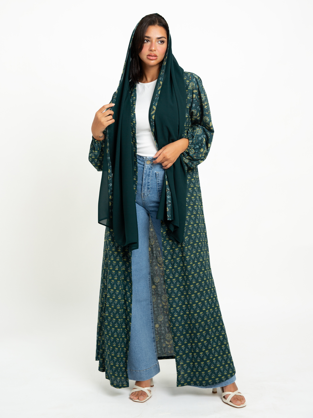 Half Cloche A-Cut Long Open Abaya in Printed Cotton Fabric