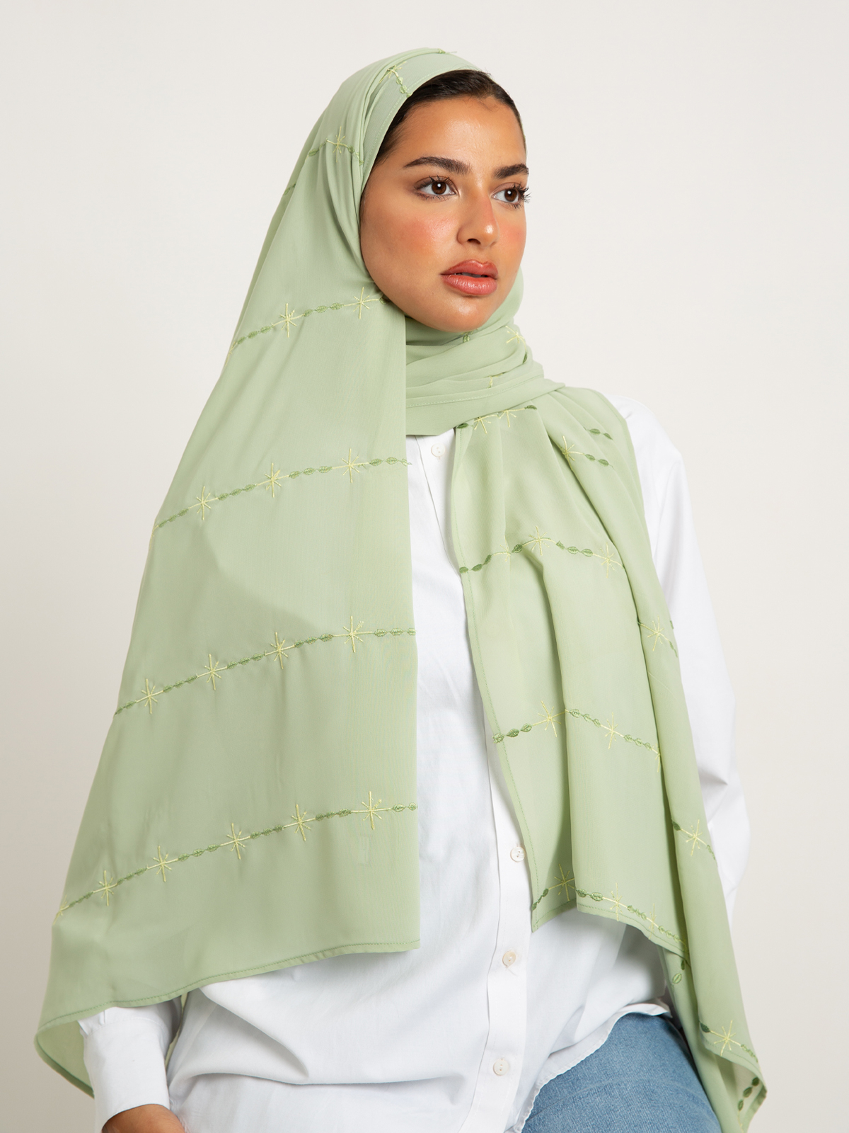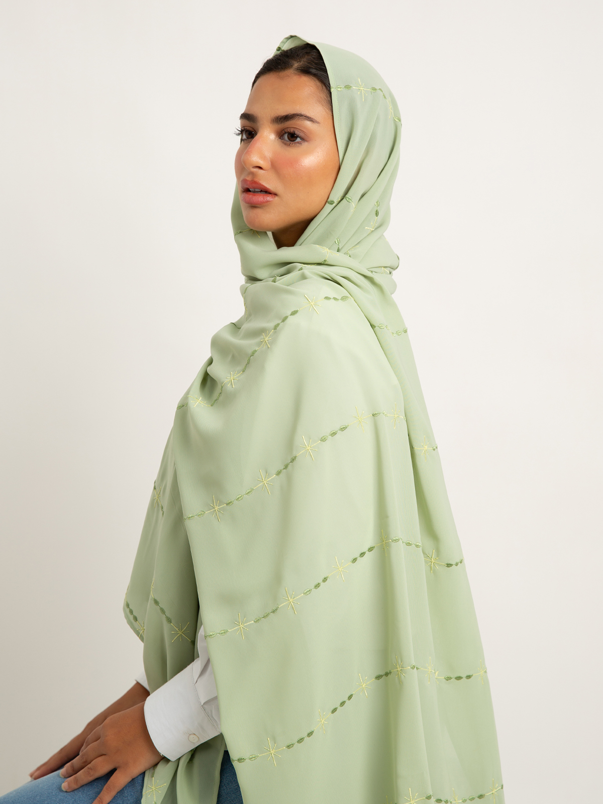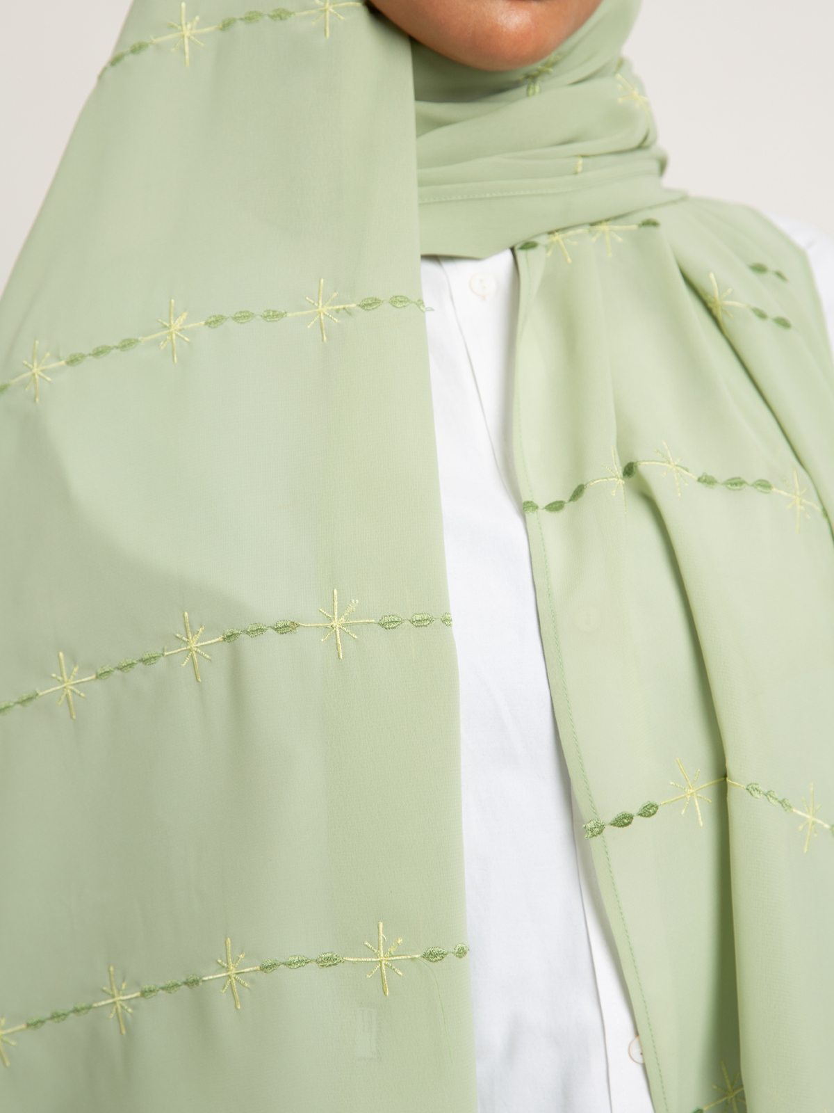 Hijab color: Light Green with Galaxy Threads Embroidery.