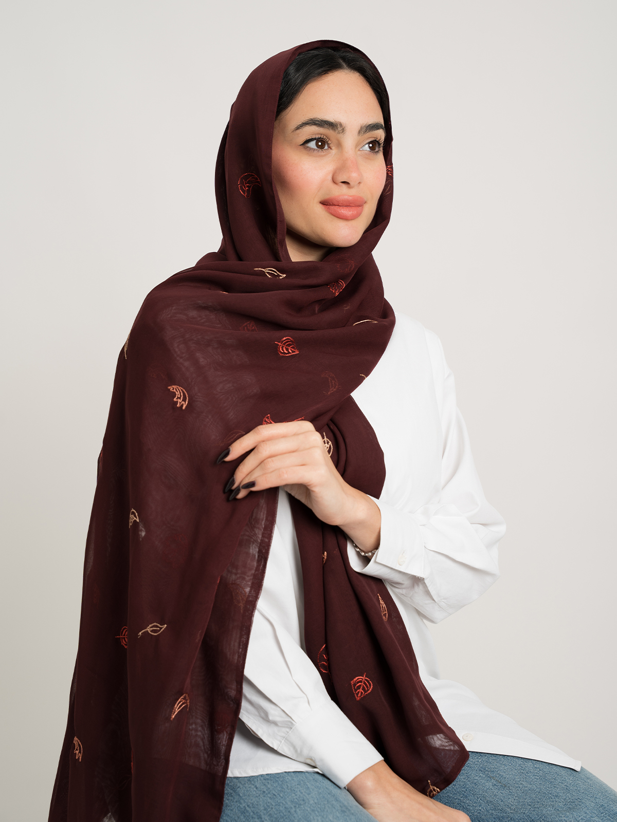 Hijab color: Maroon with Falling leaves Embroidery.