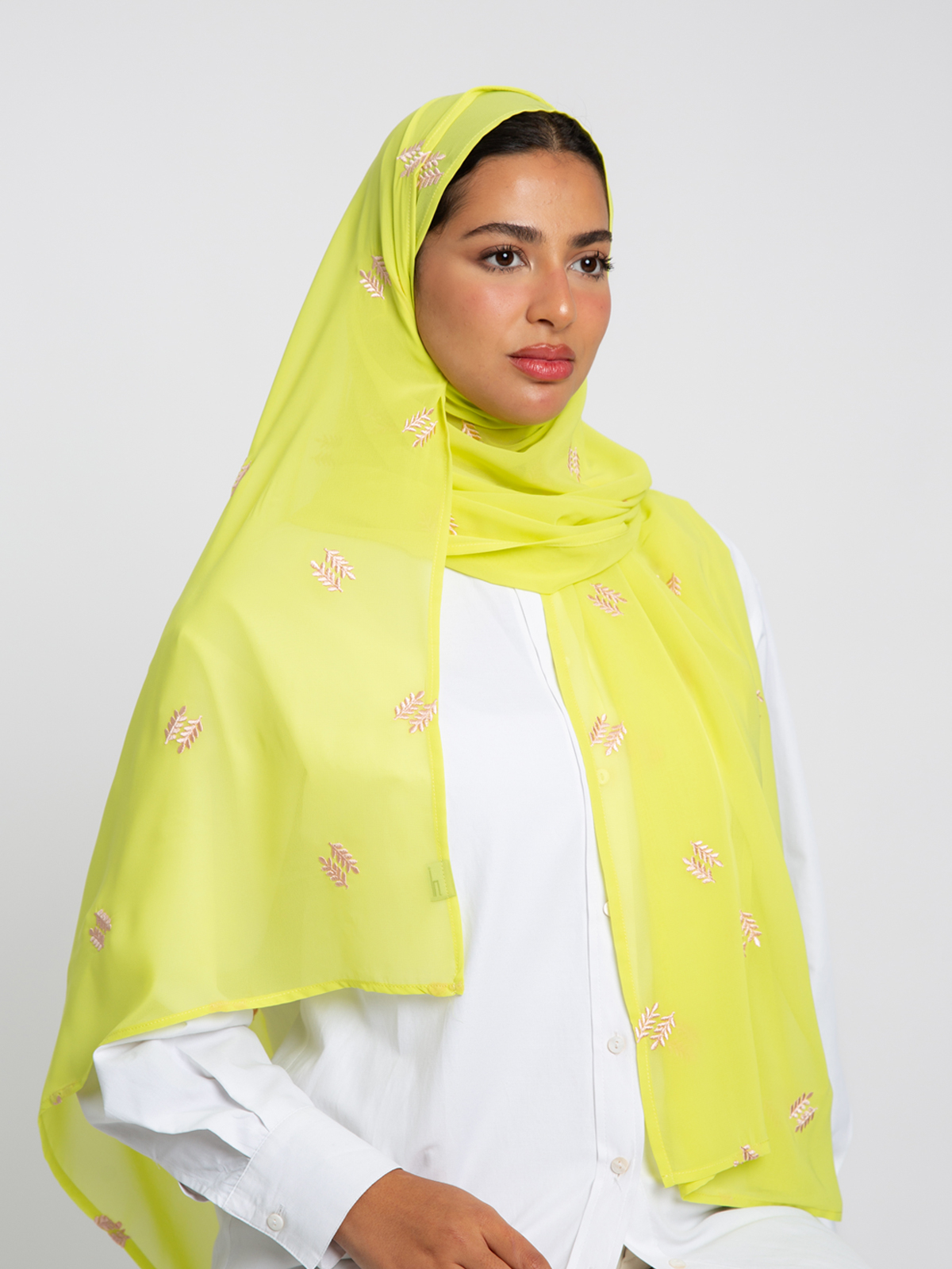 Hijab color: Neon Yellow Tarha with Spikes Embroidery.