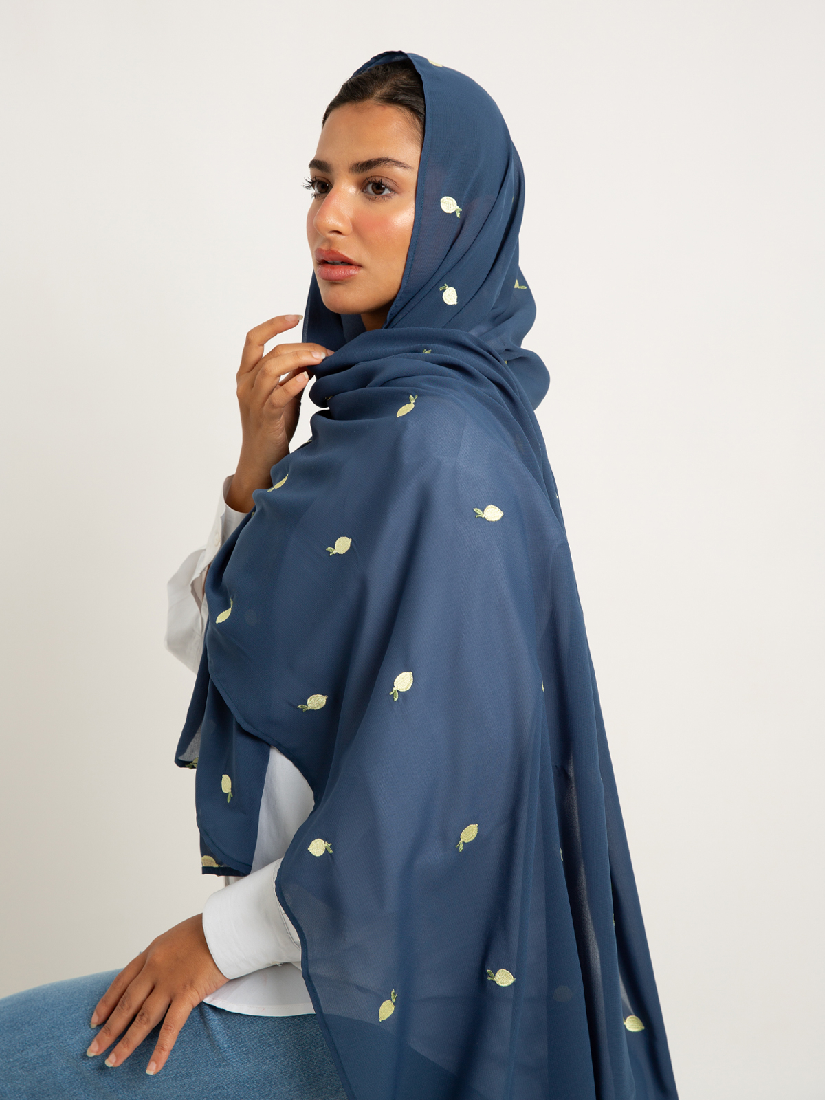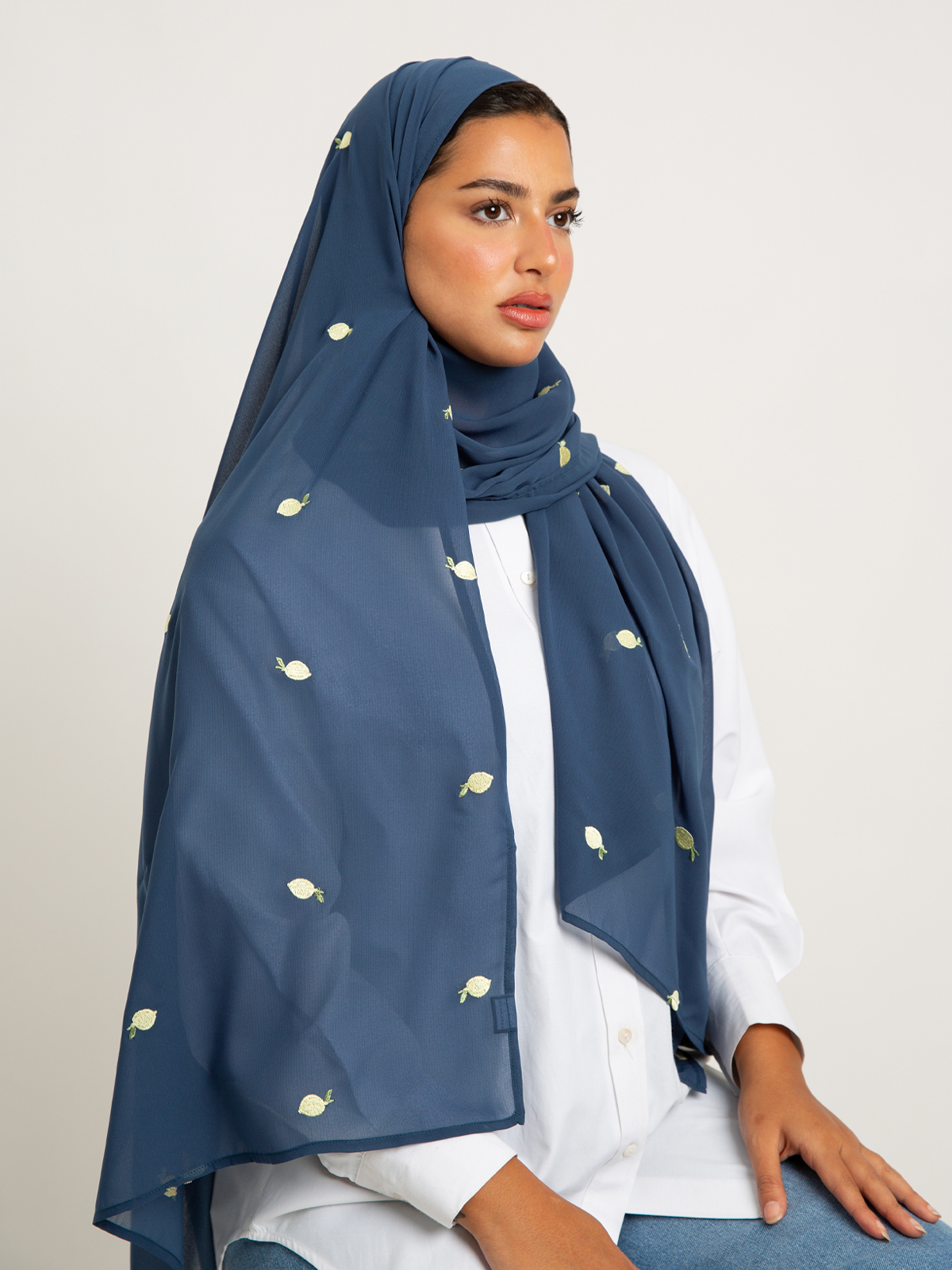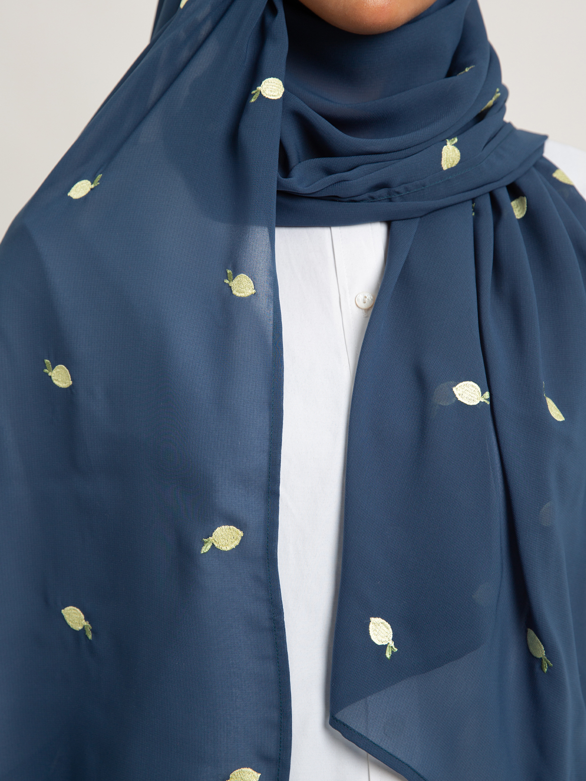 Hijab color: Teal with Lemons Embroidery.