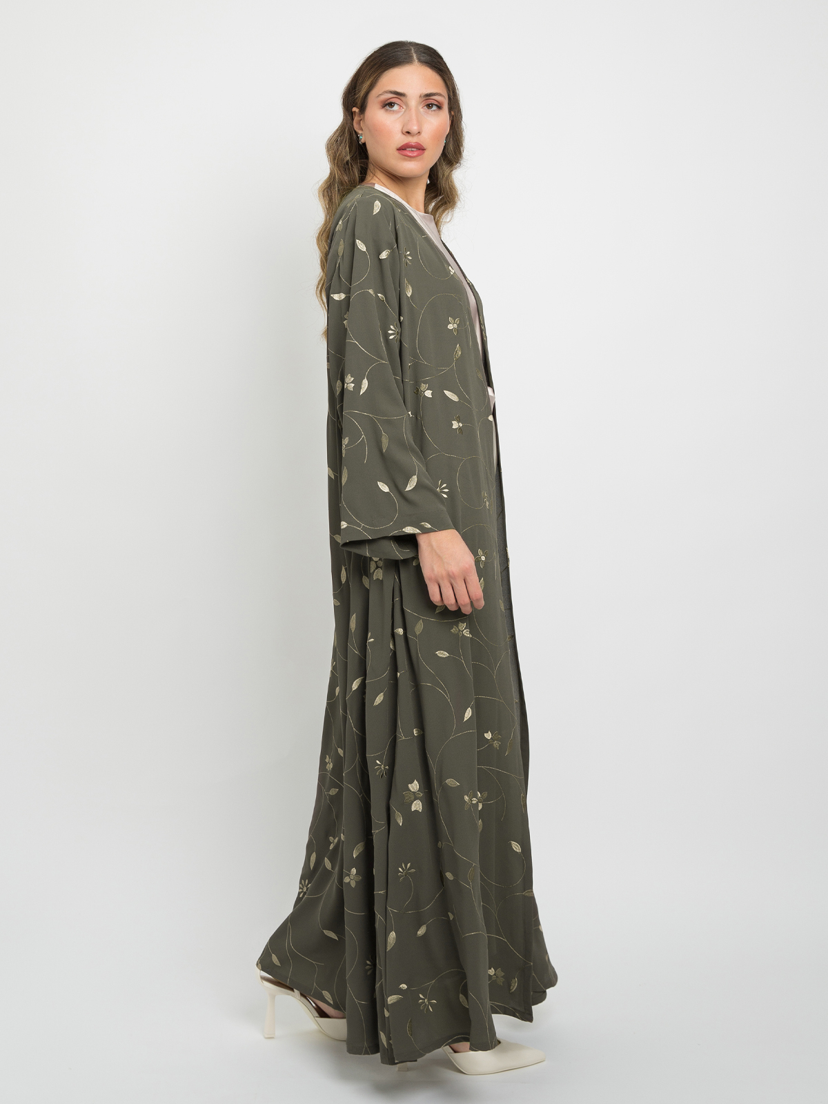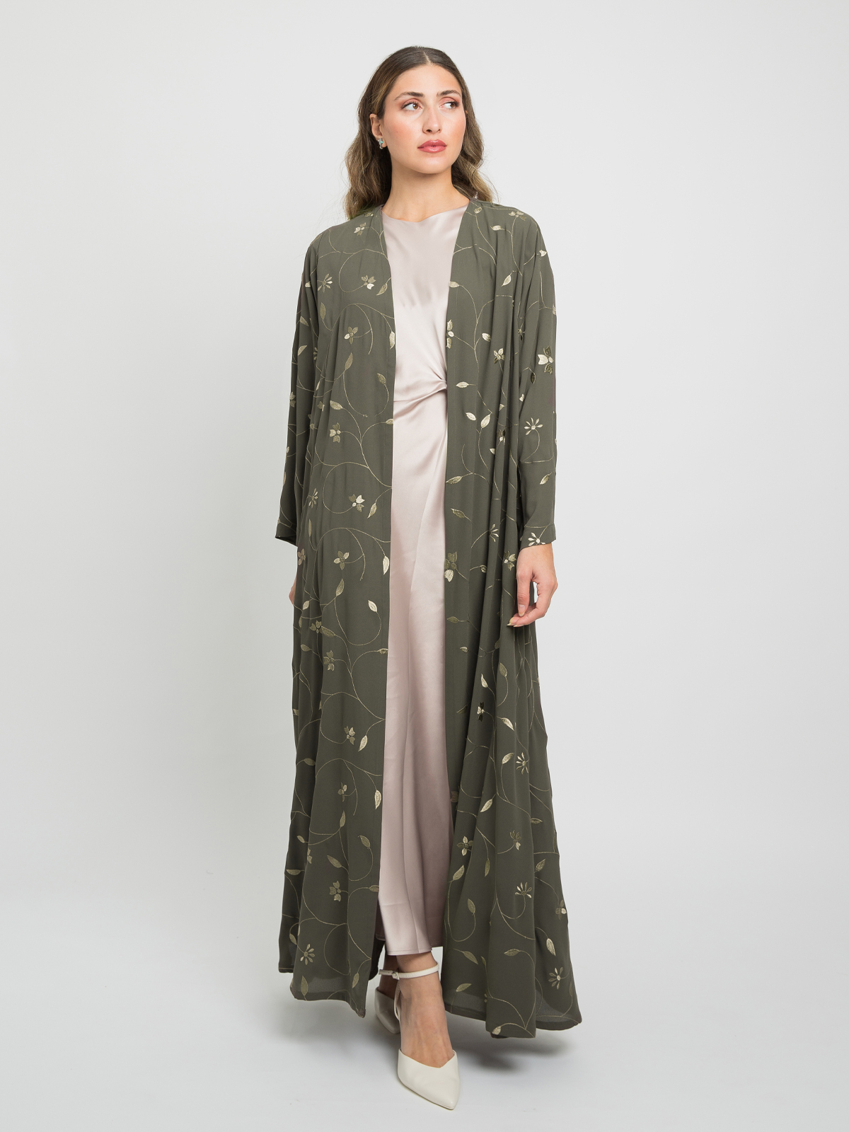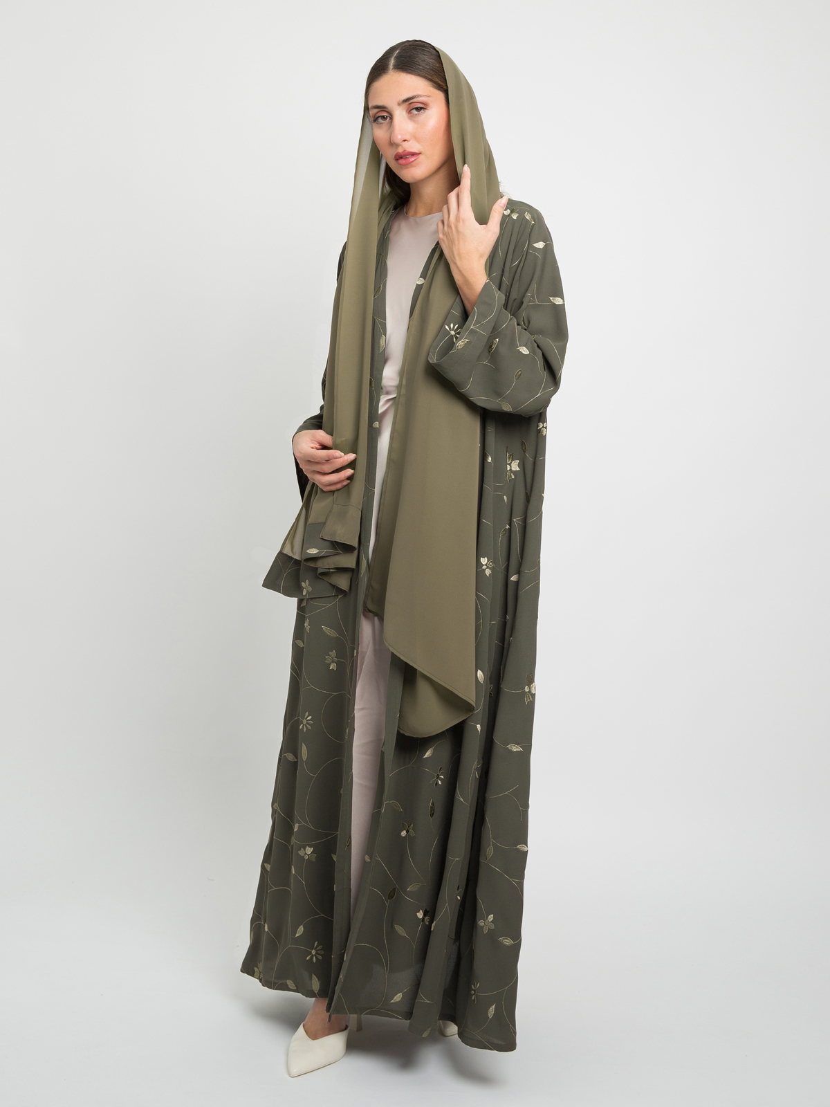 Olive - A Cut Long Open Half Cloche Abaya in Embroidered Light Fabric