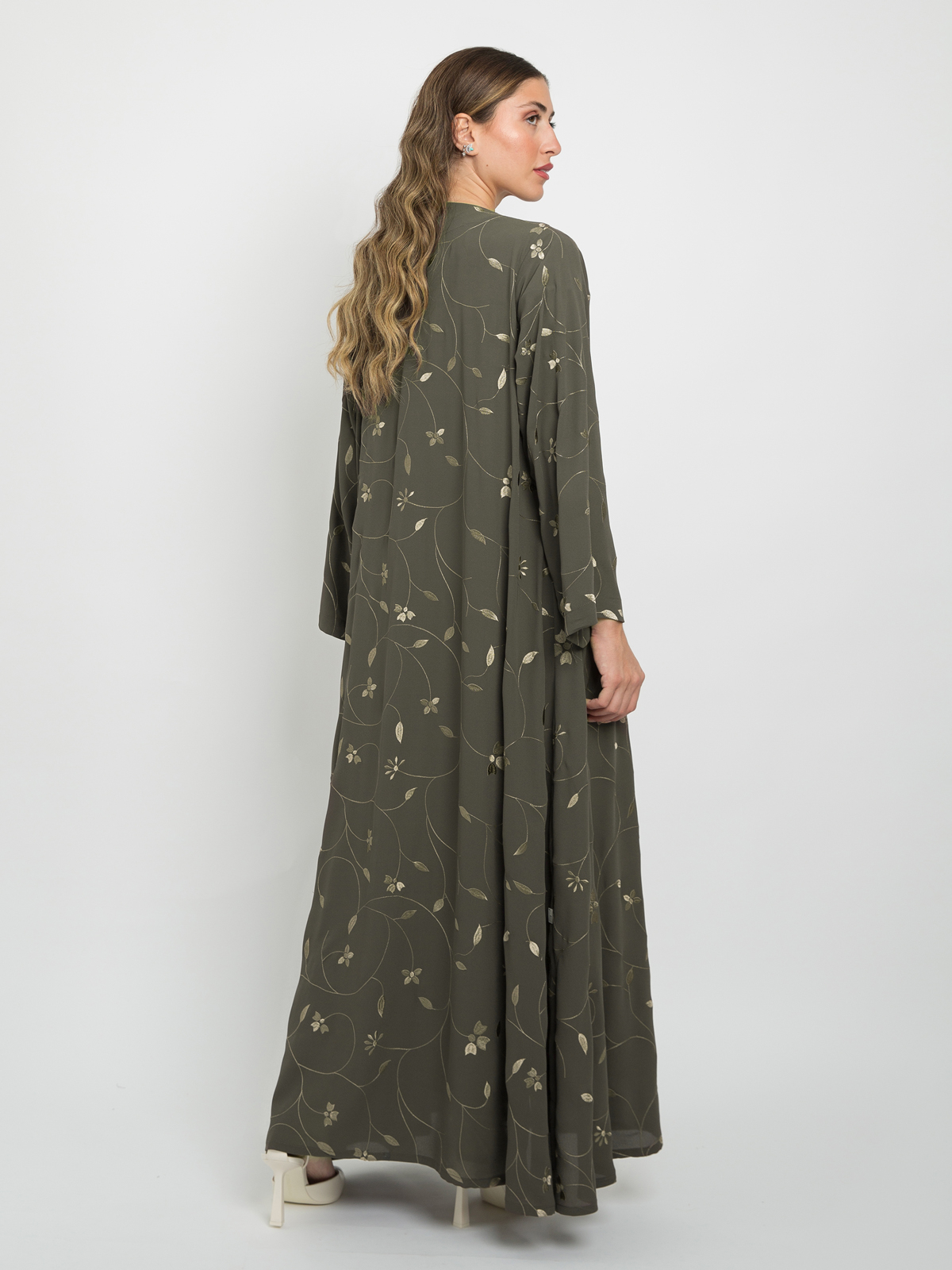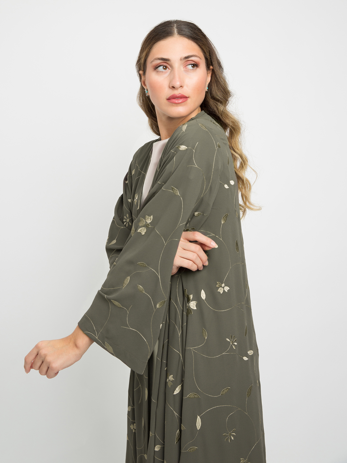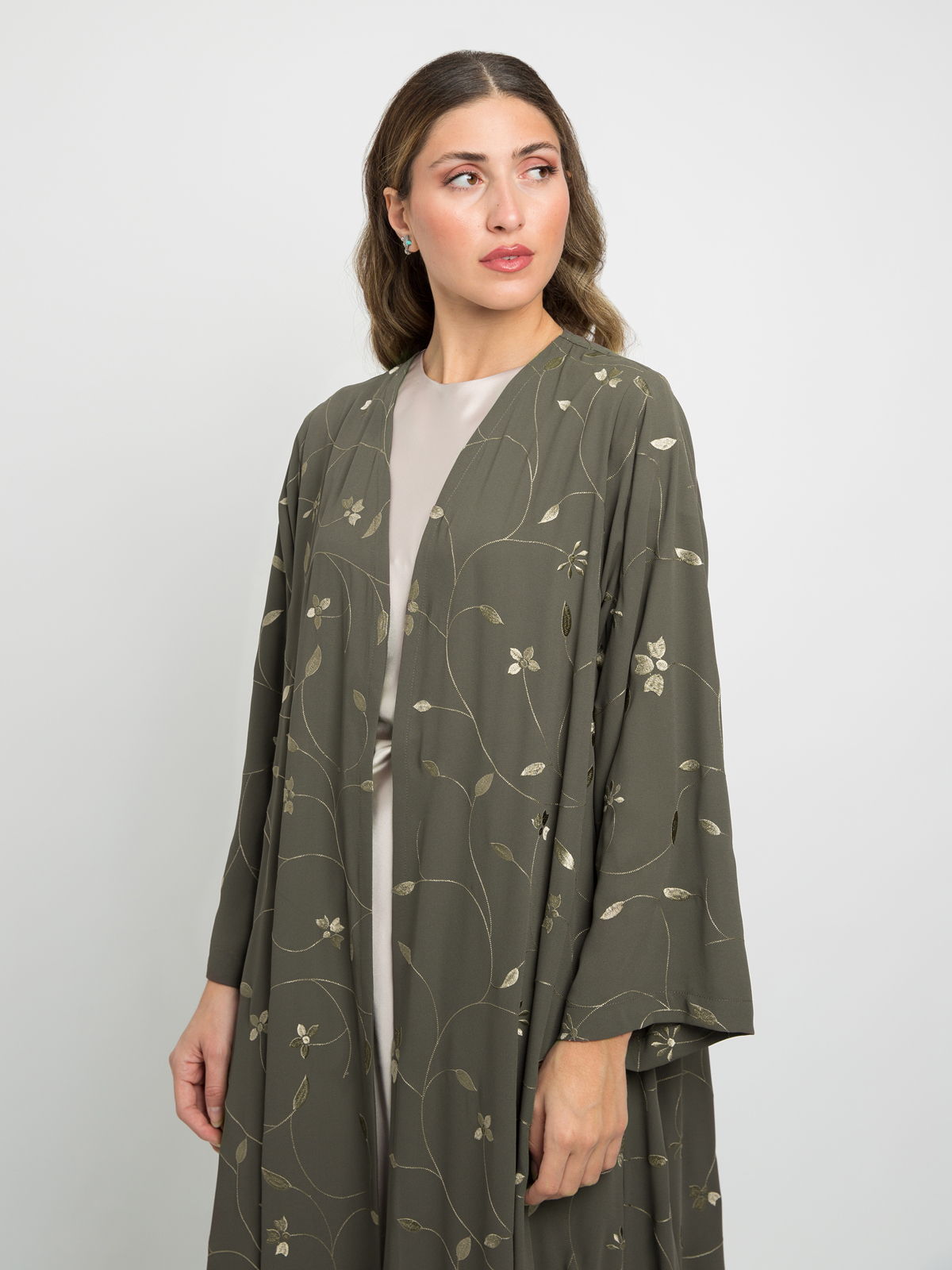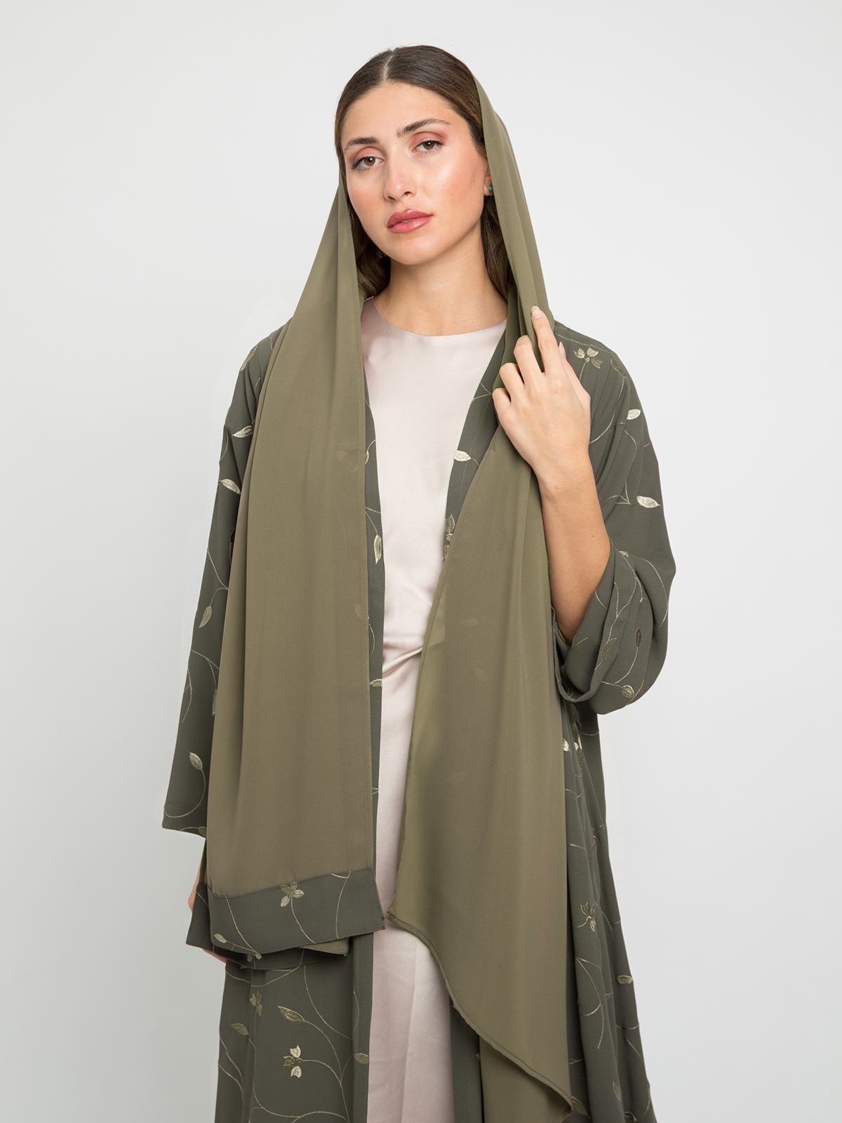 Olive - A Cut Long Open Half Cloche Abaya in Embroidered Light Fabric