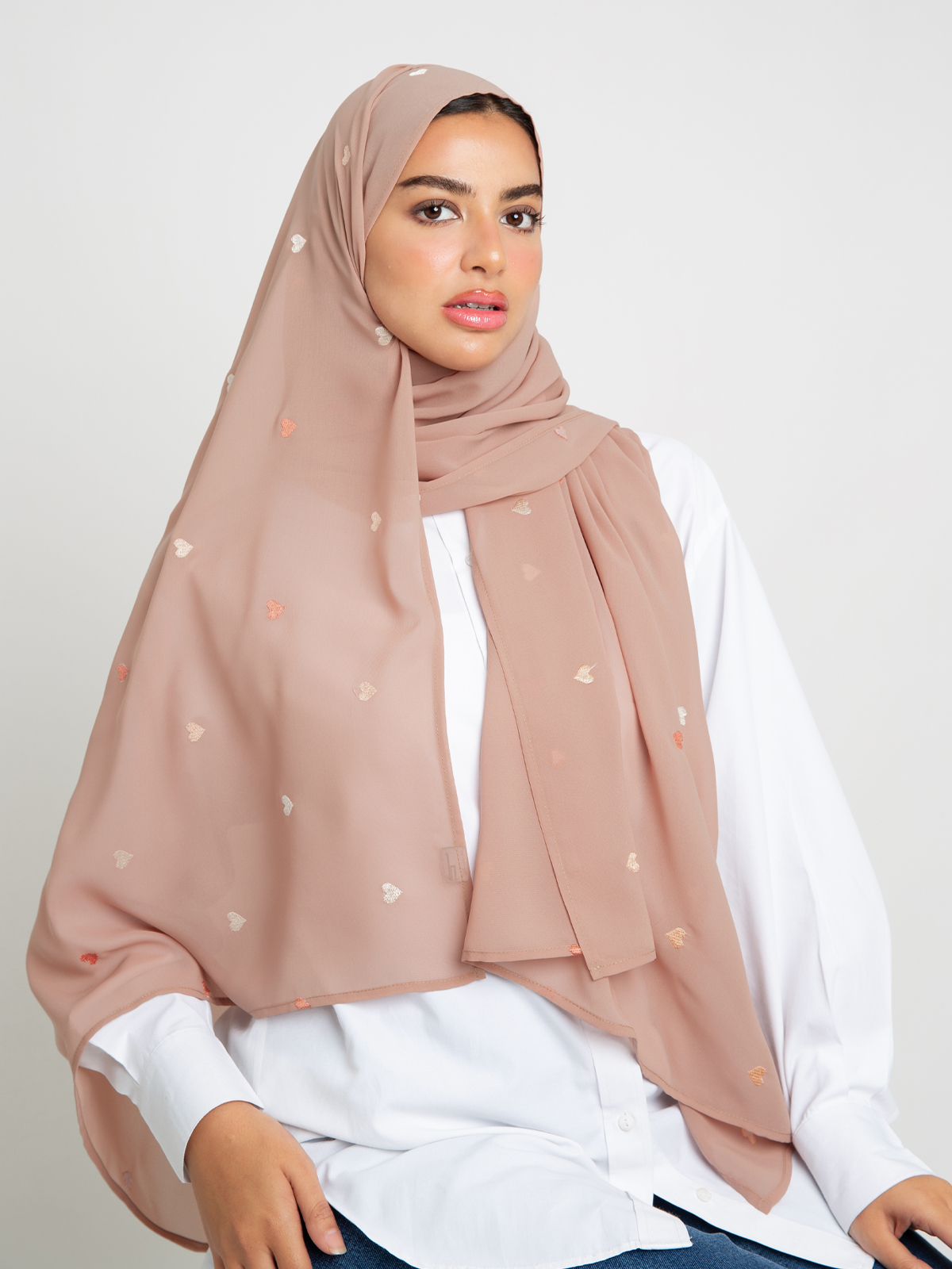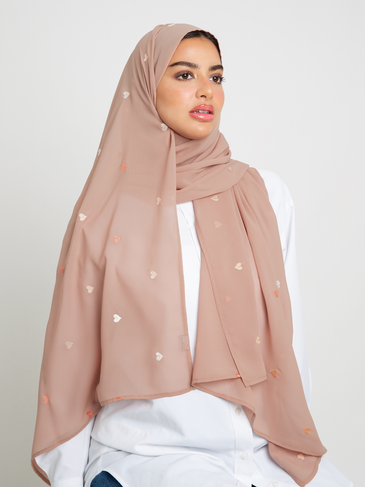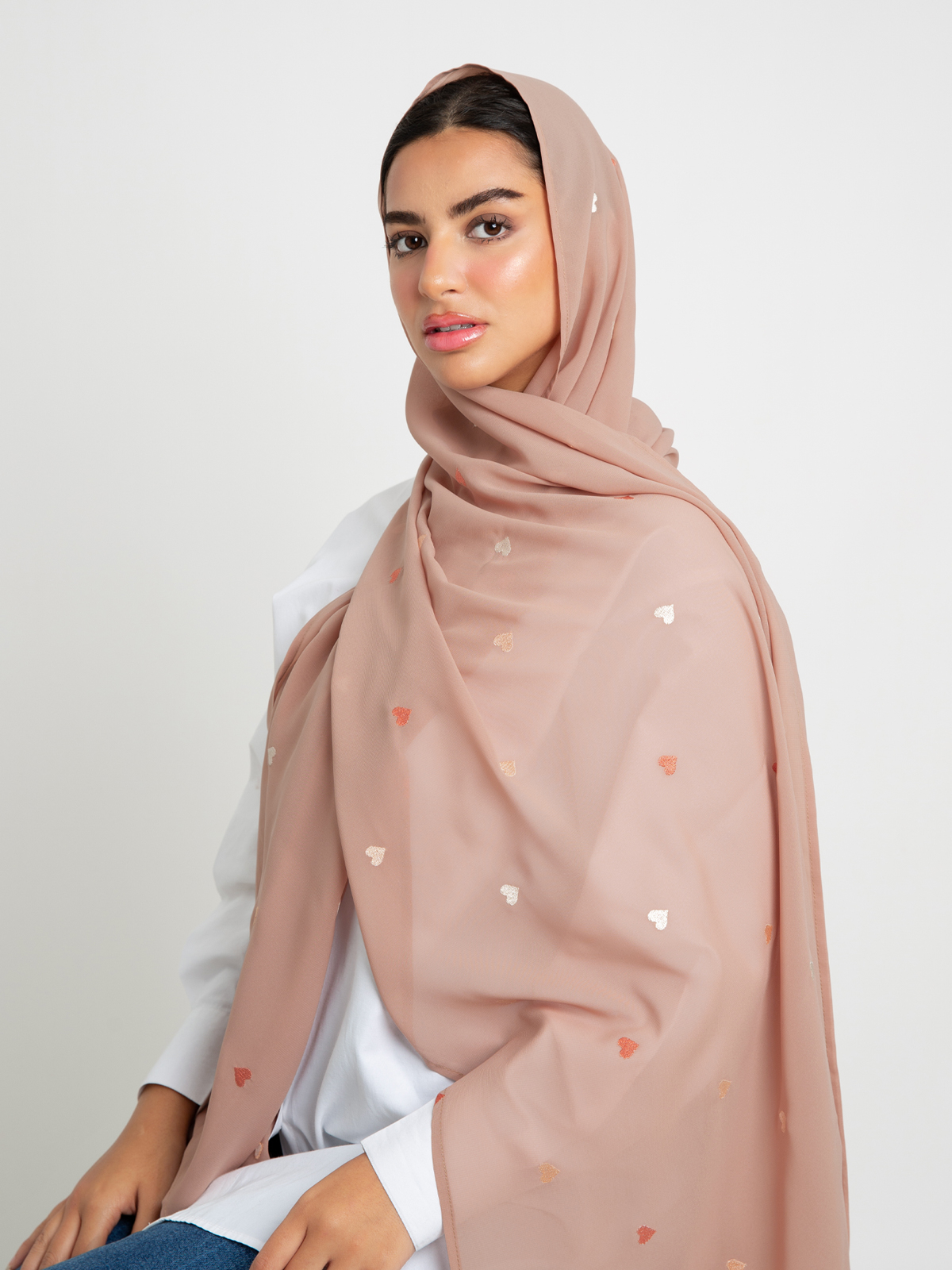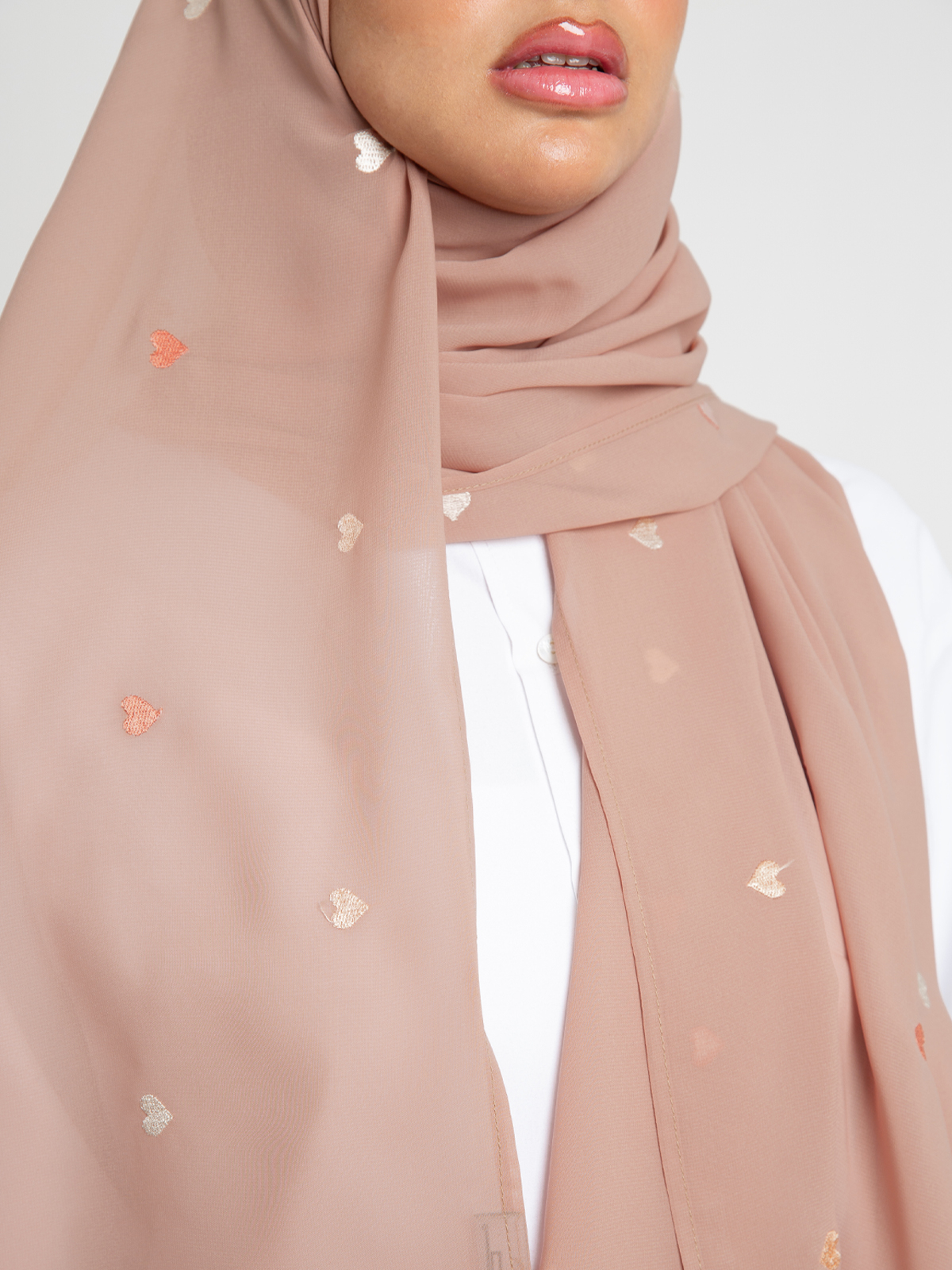 Hijab color: Peach with Colorful Hearts Embroidery.