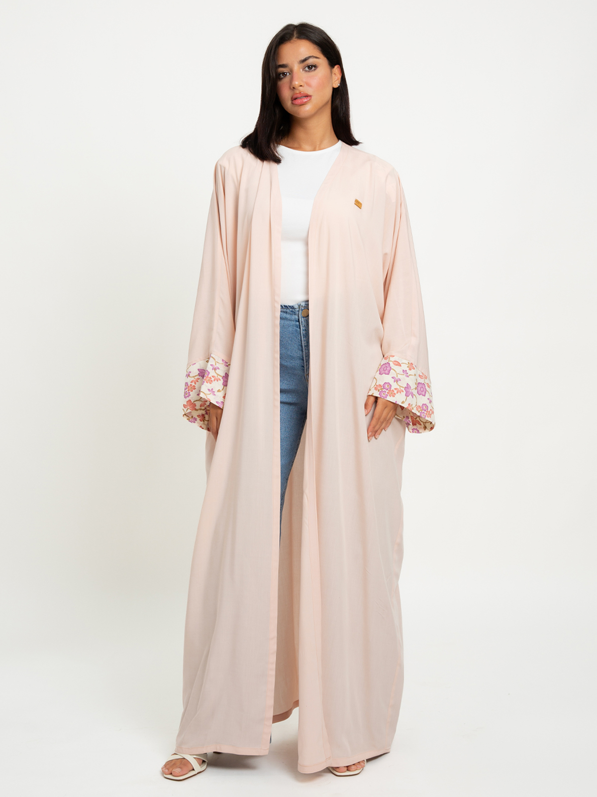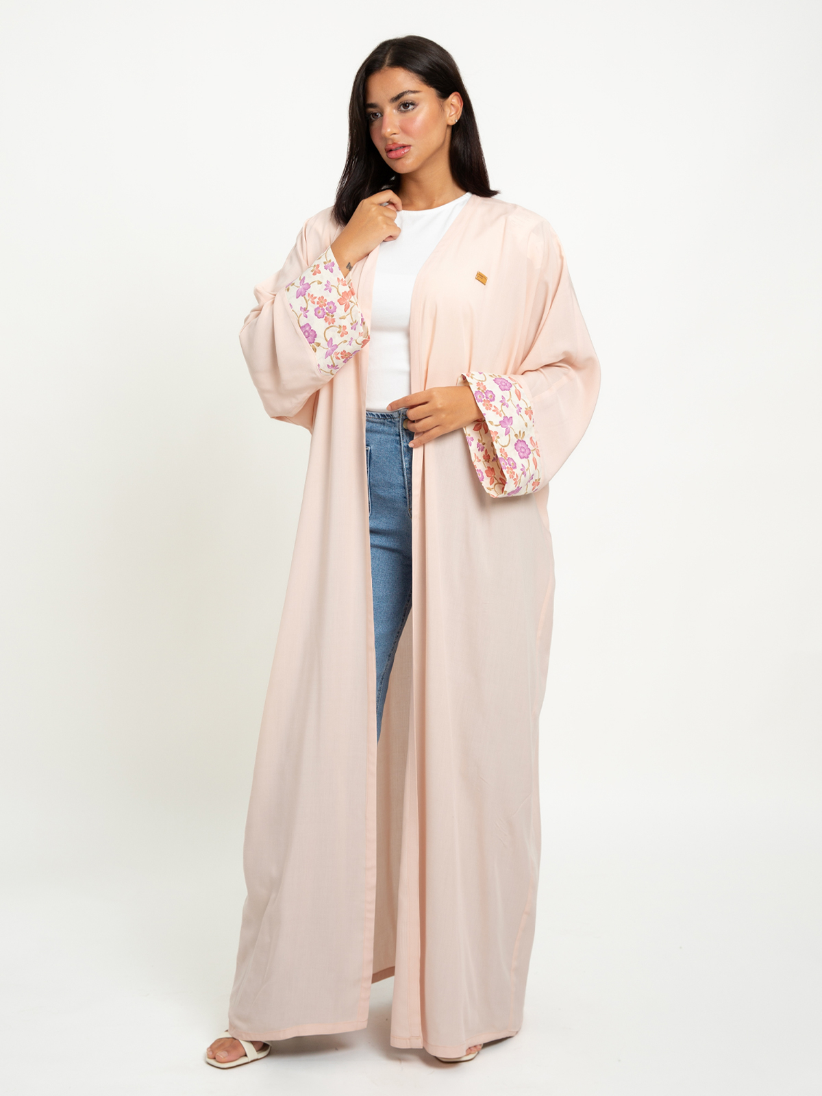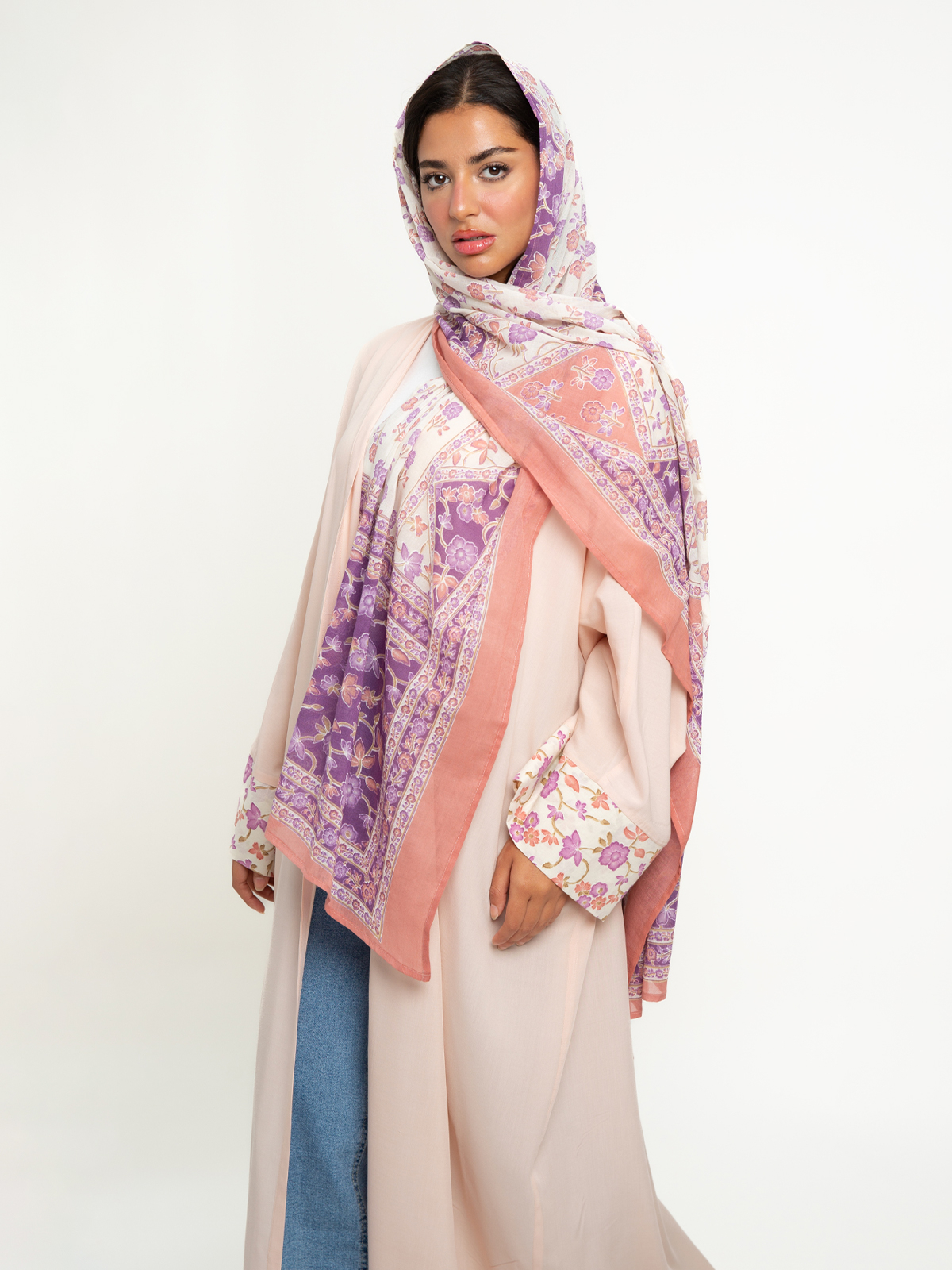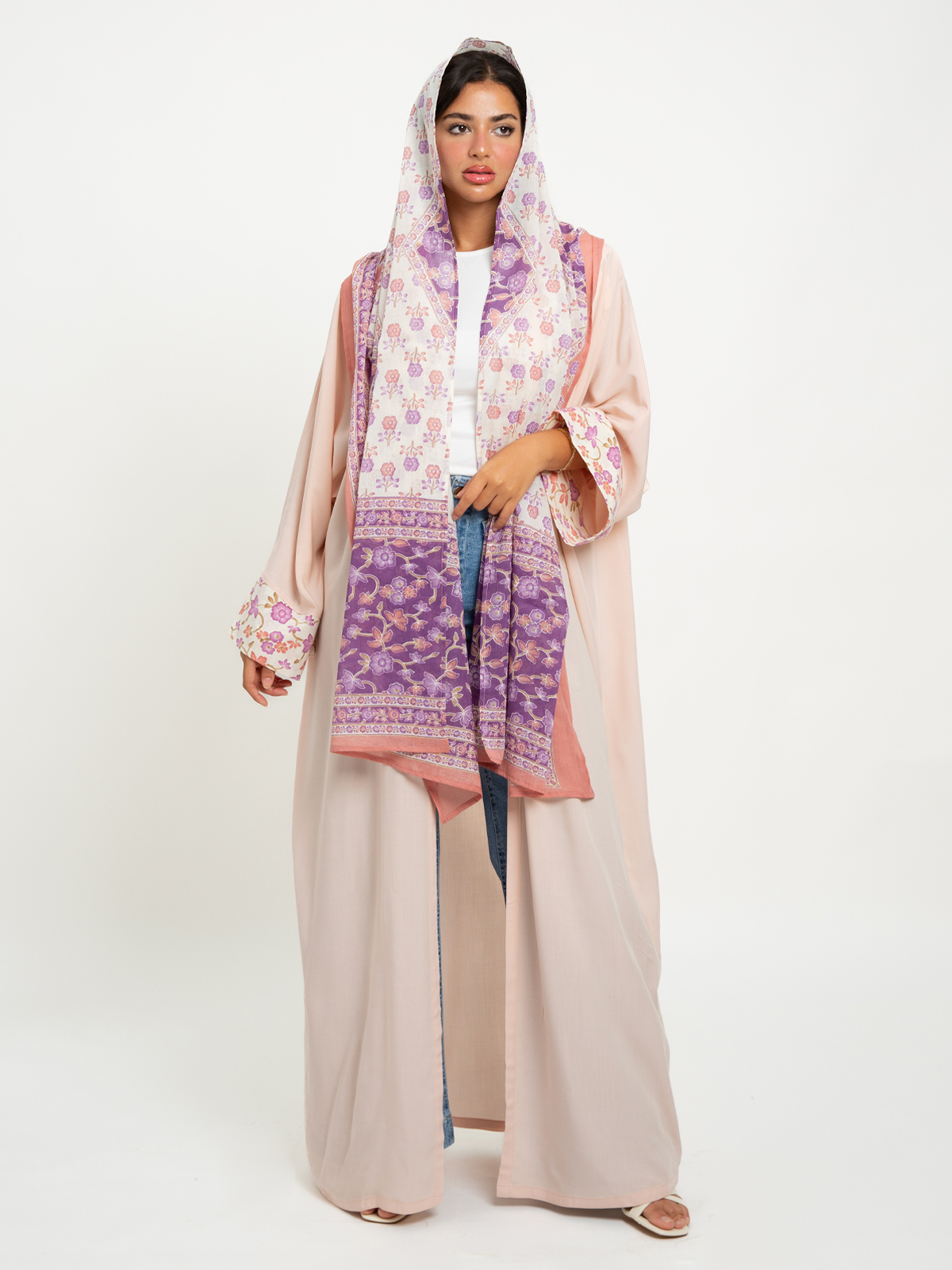 Wide-fit Long Open Abaya in Printed Cotton Fabric