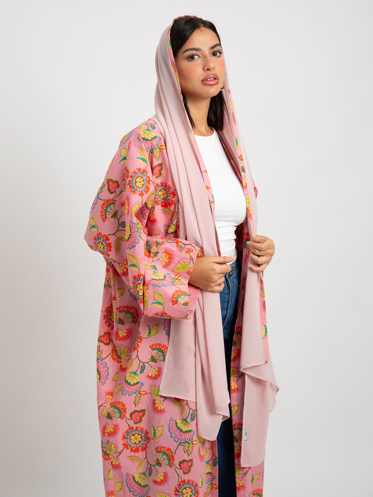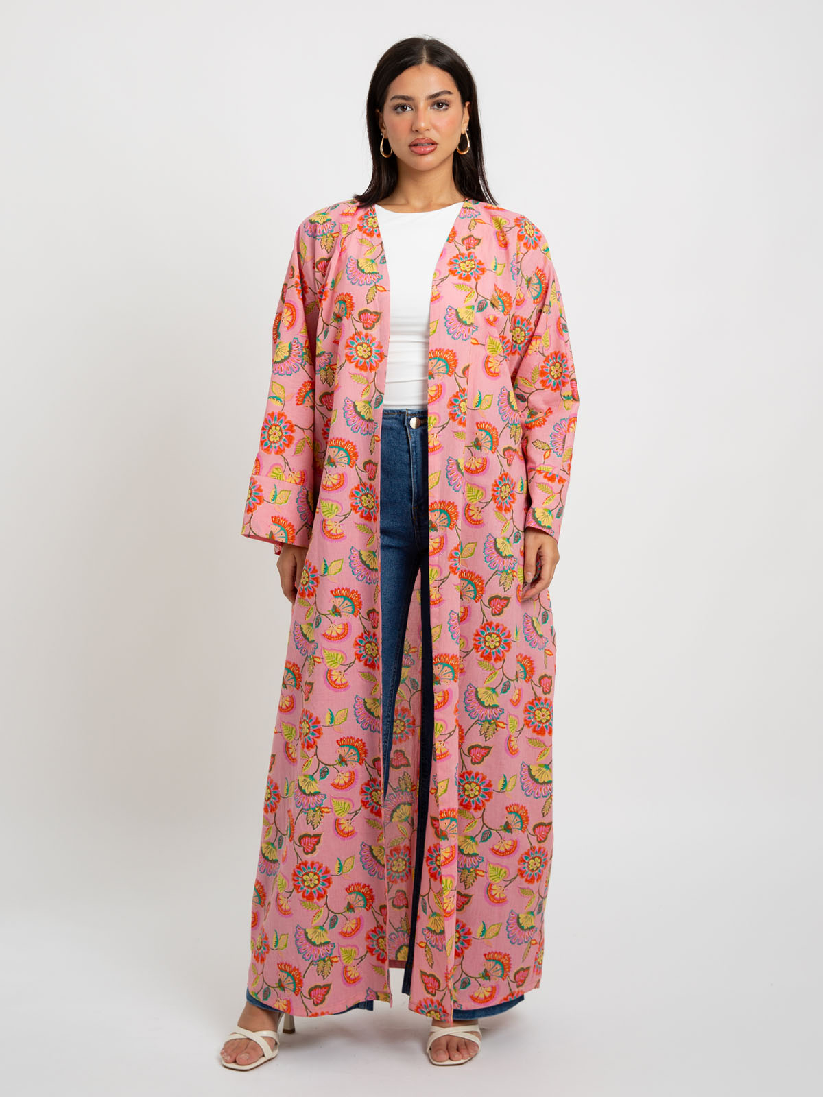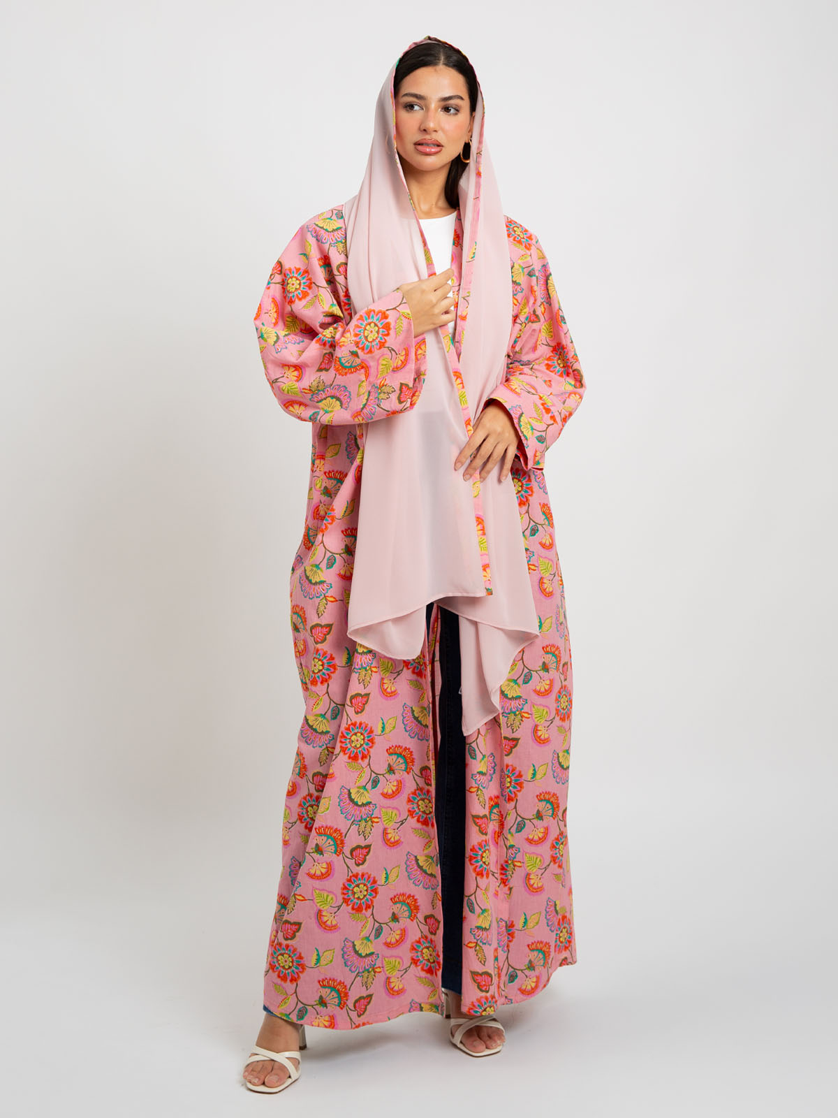 Wide-fit Long Open Abaya in ِِPrinted Cotton Fabric