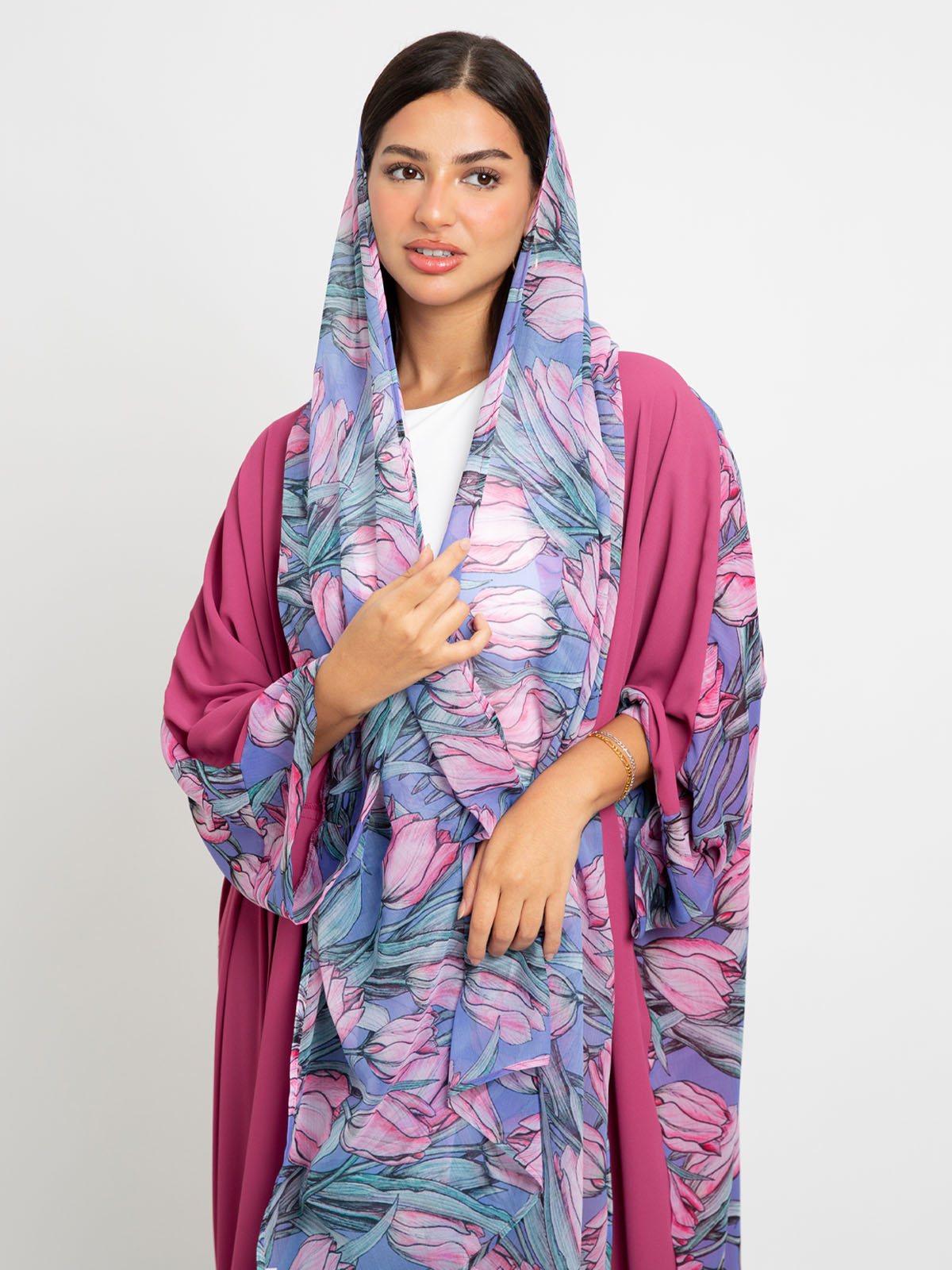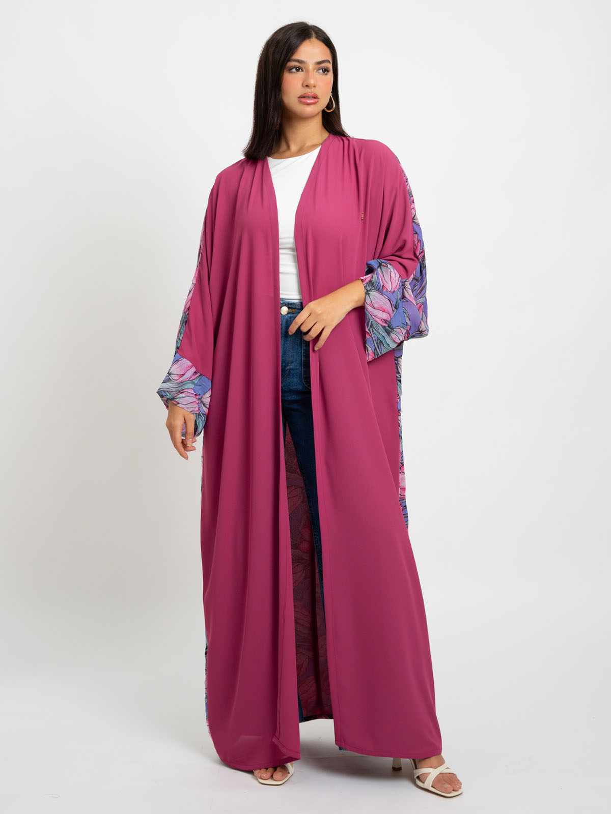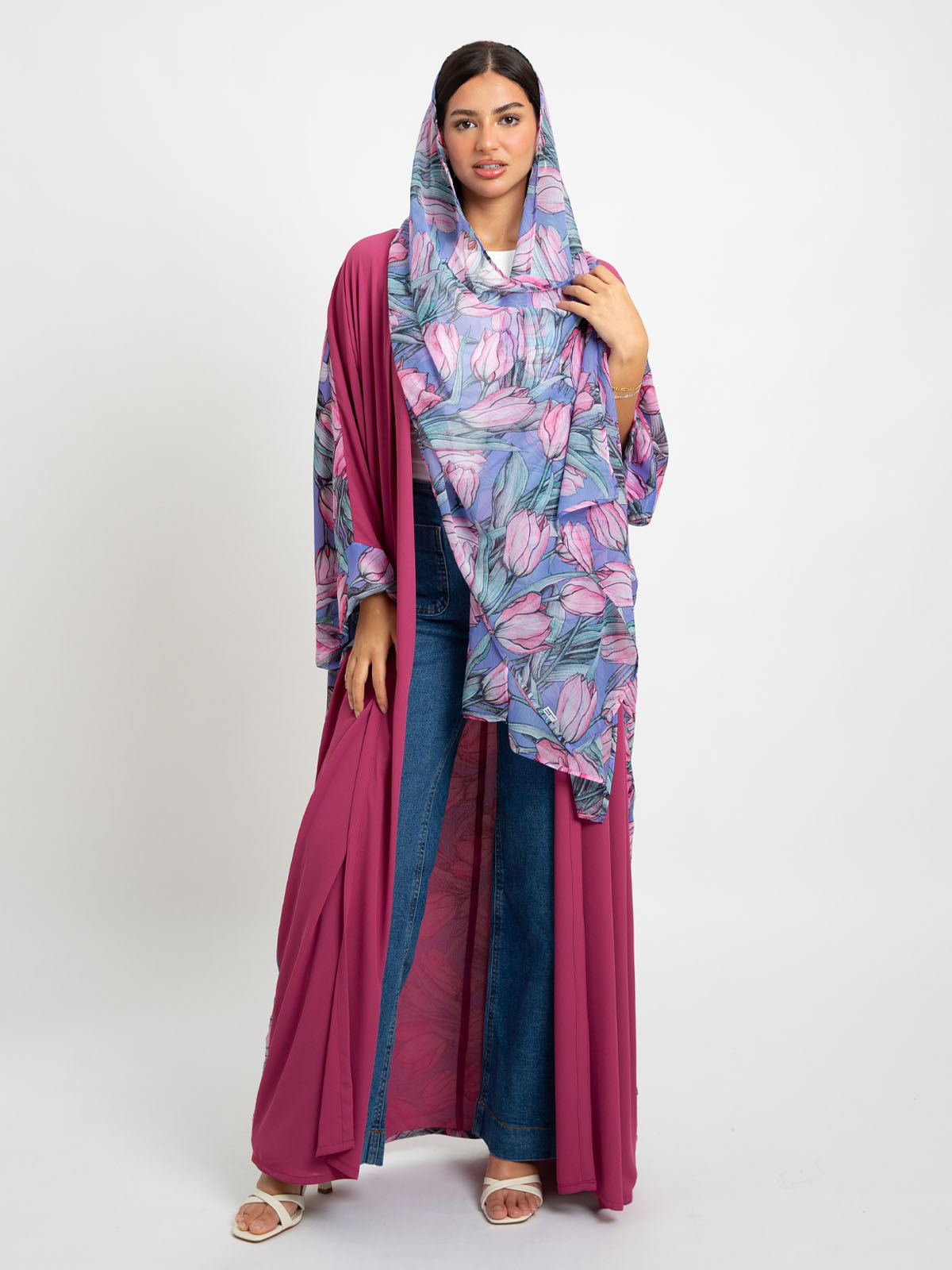 Wide-fit Long Open Abaya in ِِPrinted Chiffon Fabric