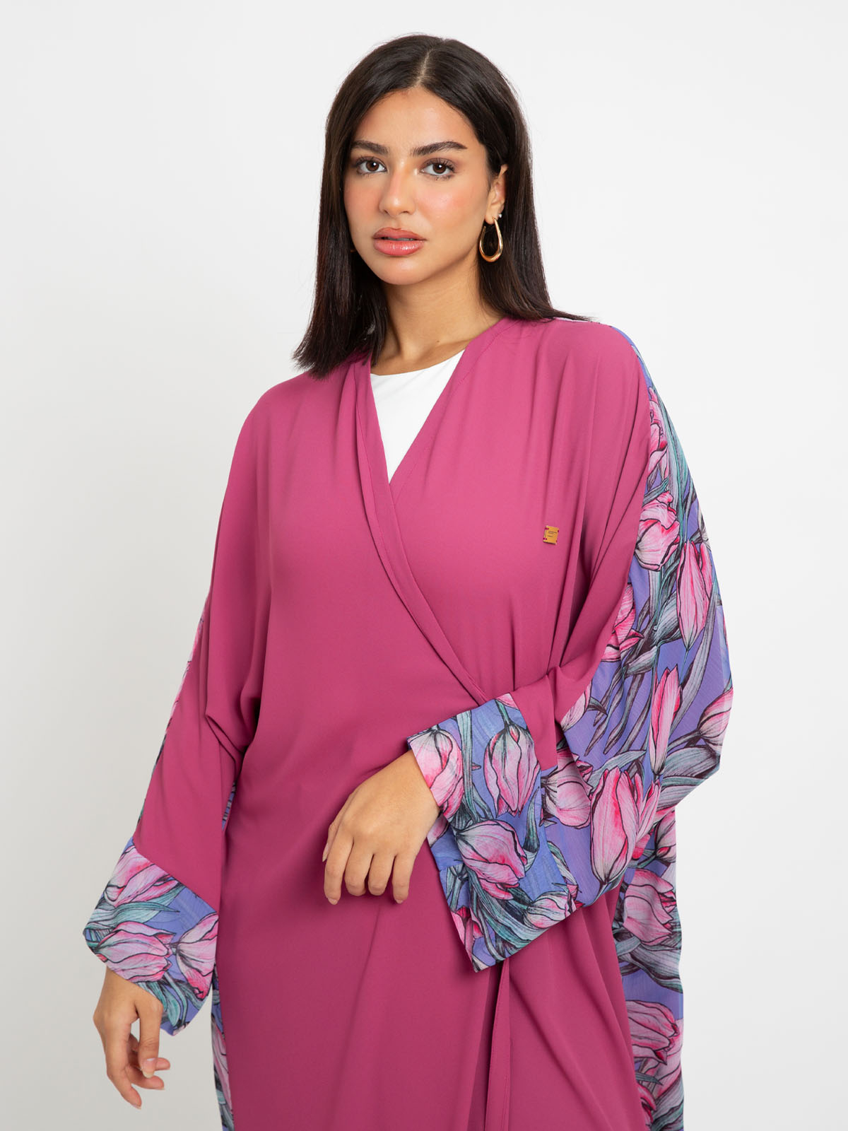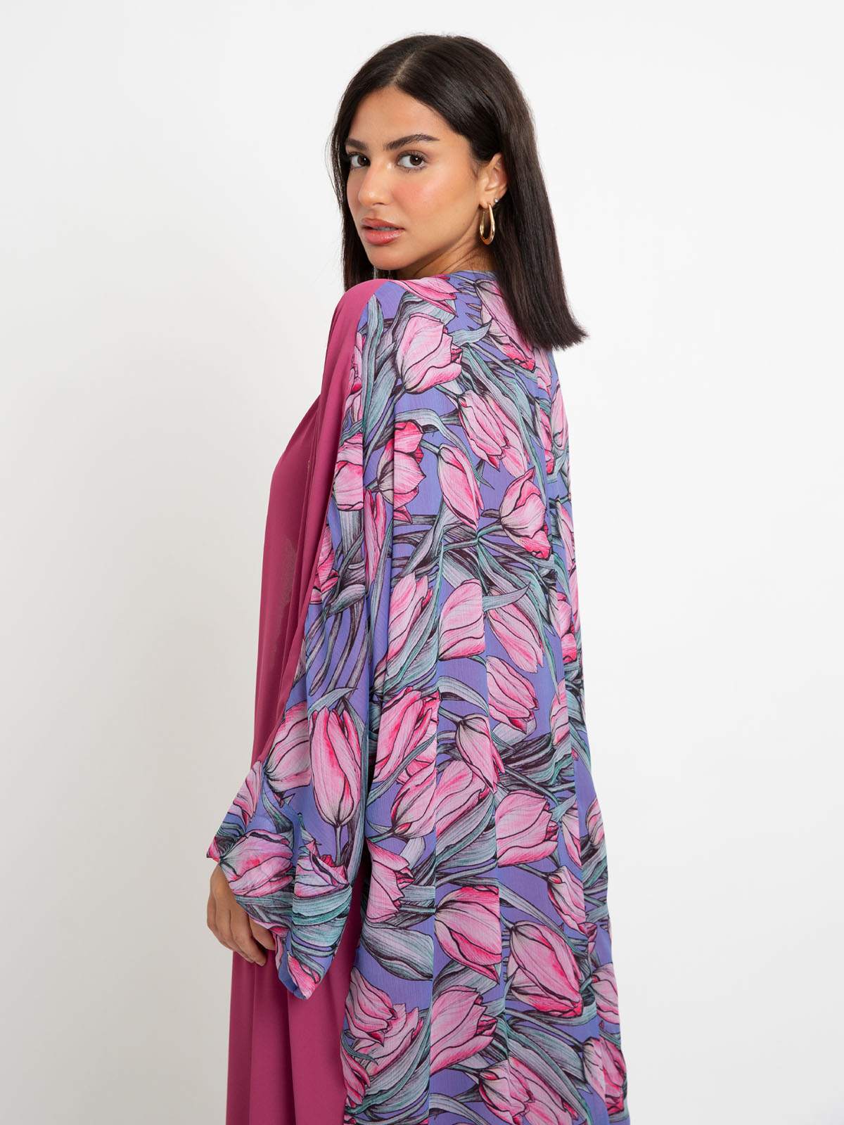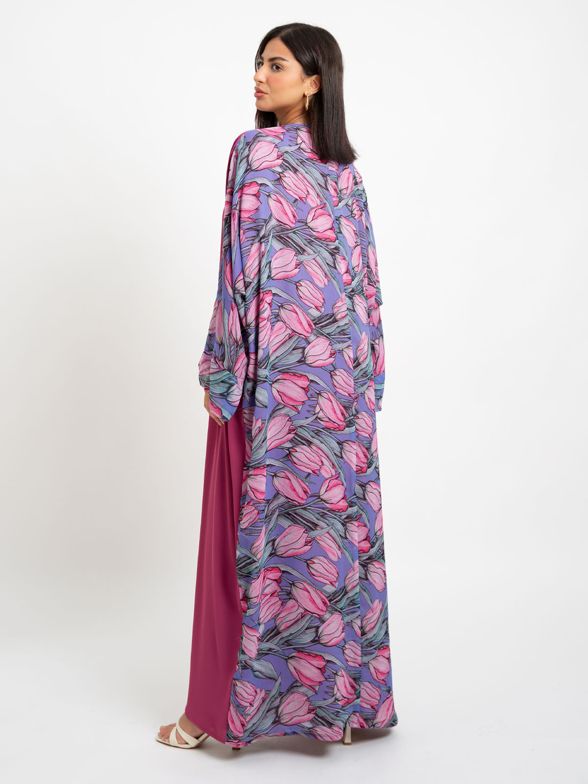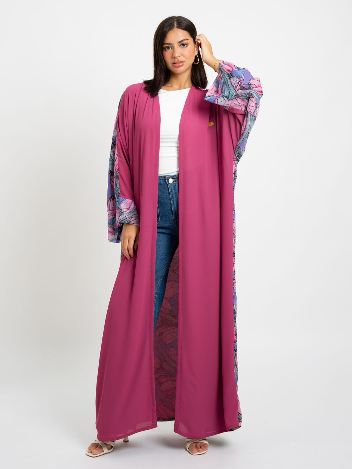 Wide-fit Long Open Abaya in ِِPrinted Chiffon Fabric
