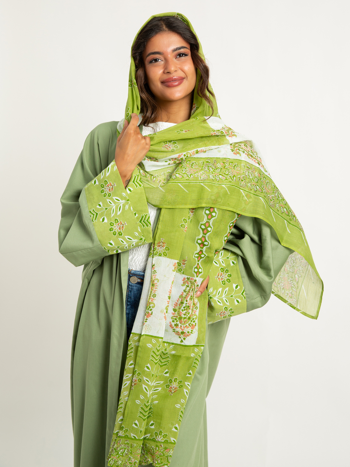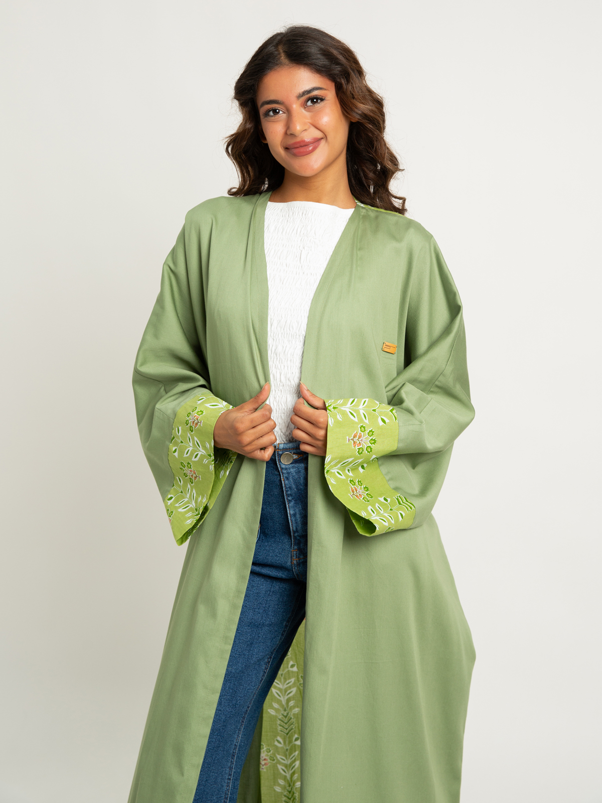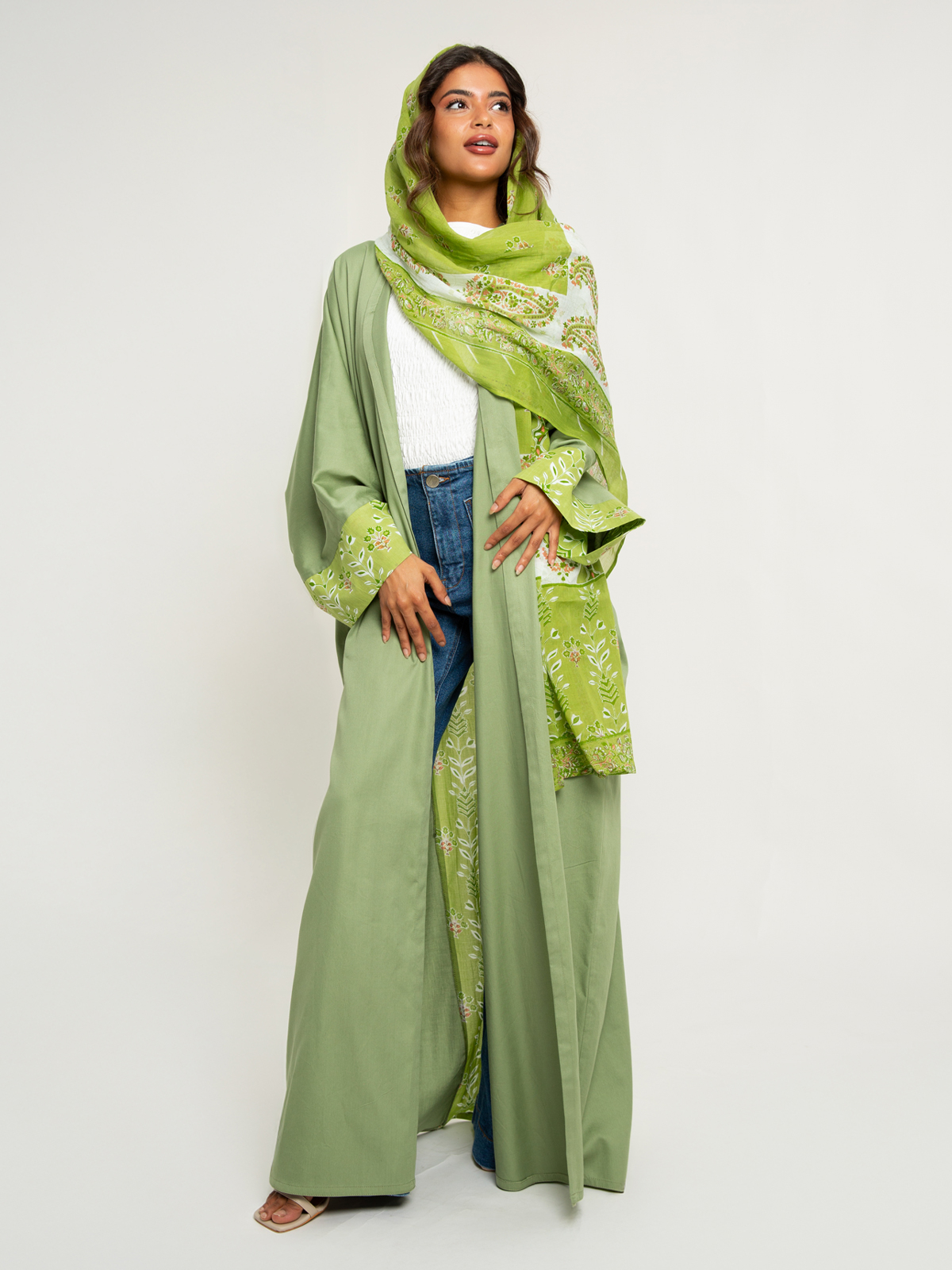 Wide-fit Long Open Abaya in Printed Cotton Fabric
