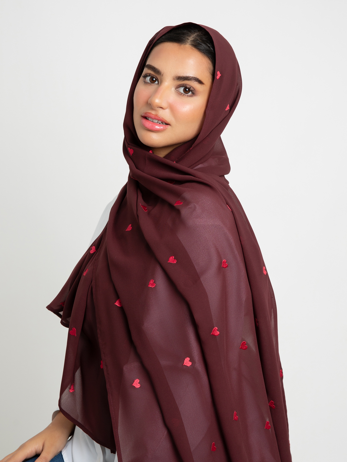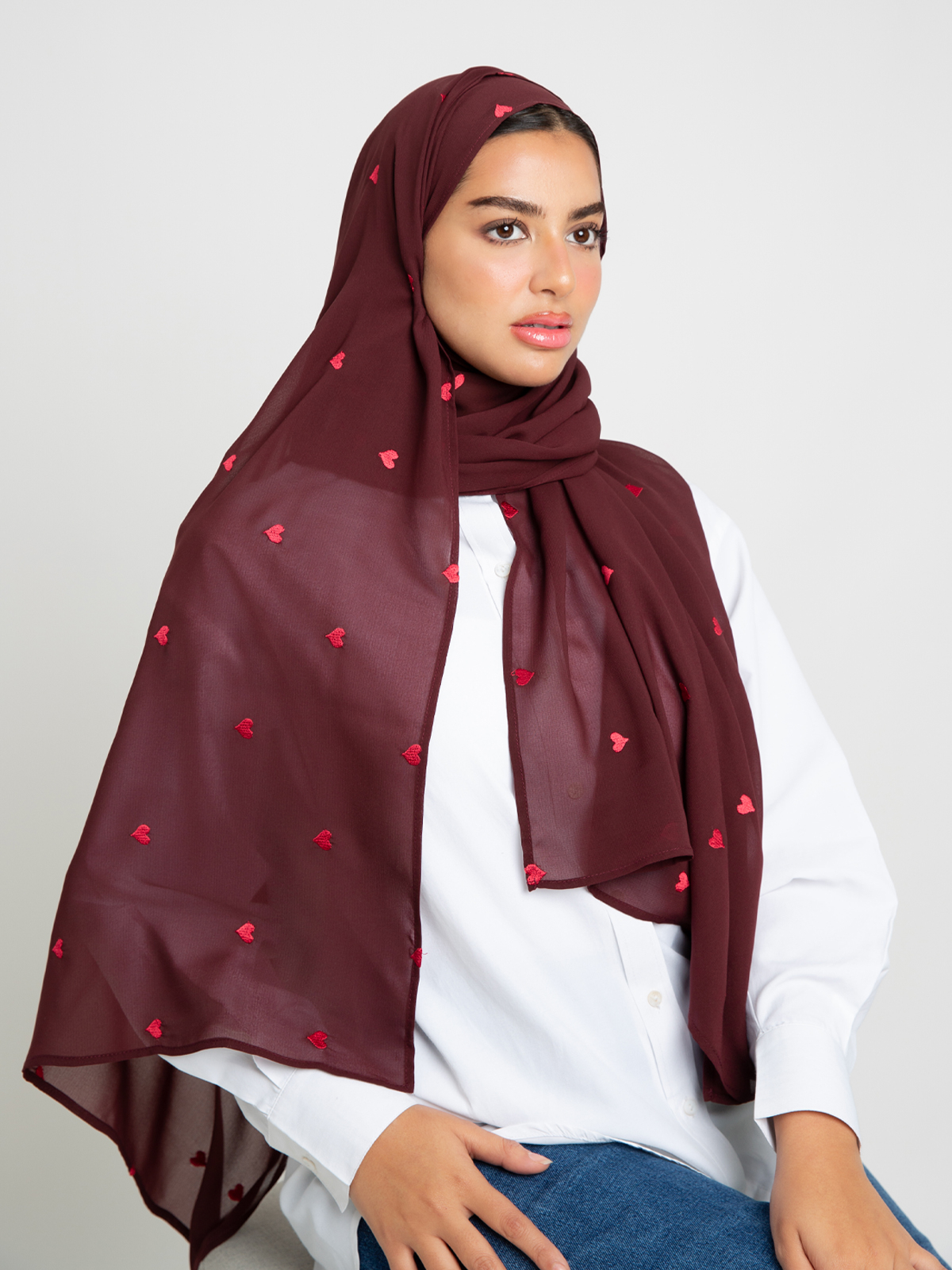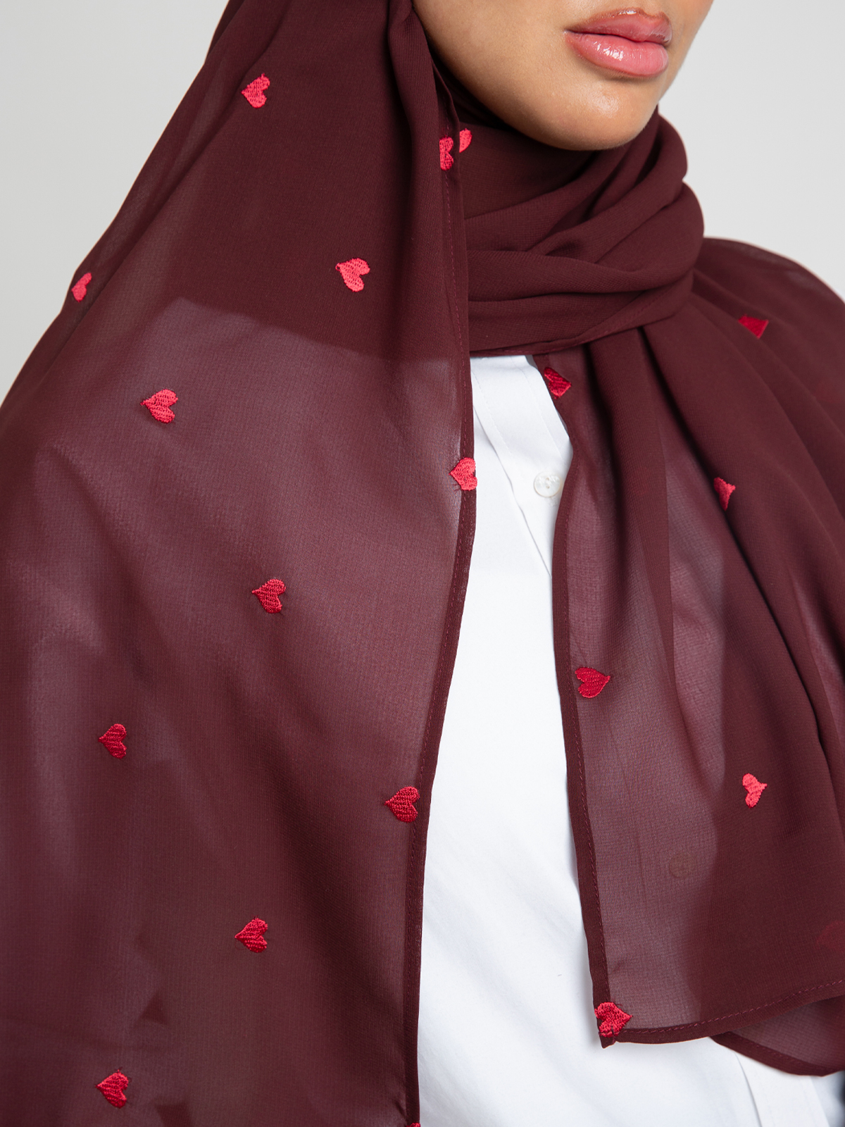 Hijab color: Ruby with Colorful Hearts Embroidery.