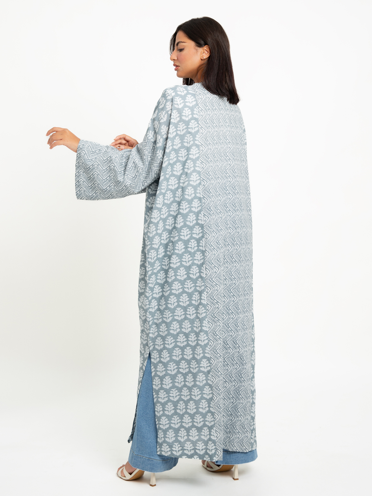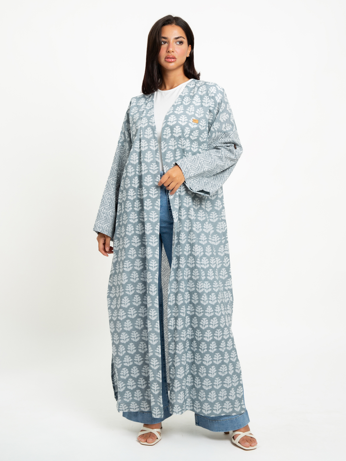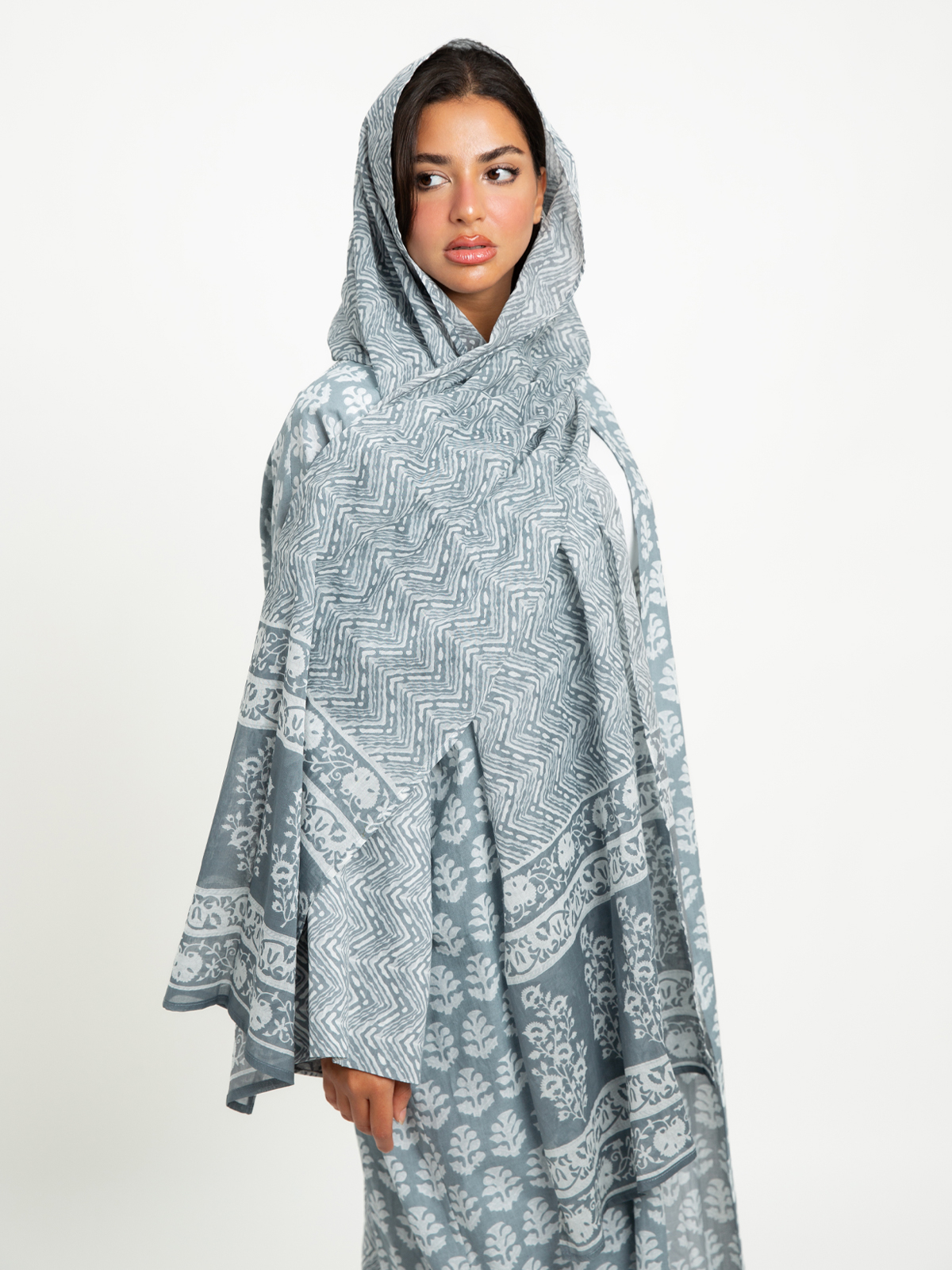 Long Wide-fit Open Abaya in Printed Cotton Fabric