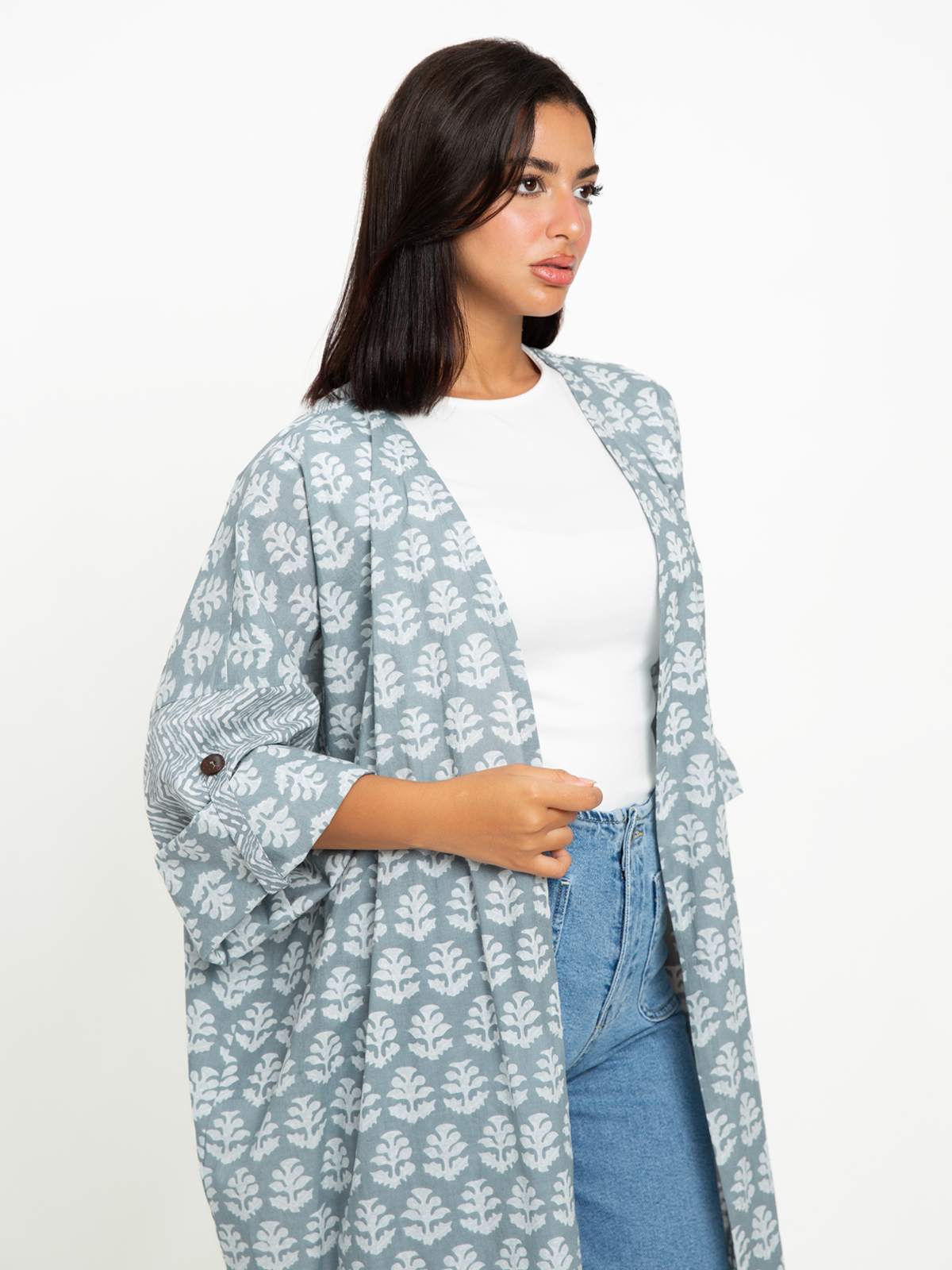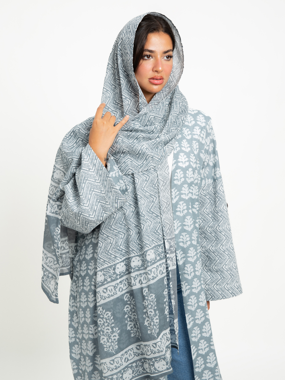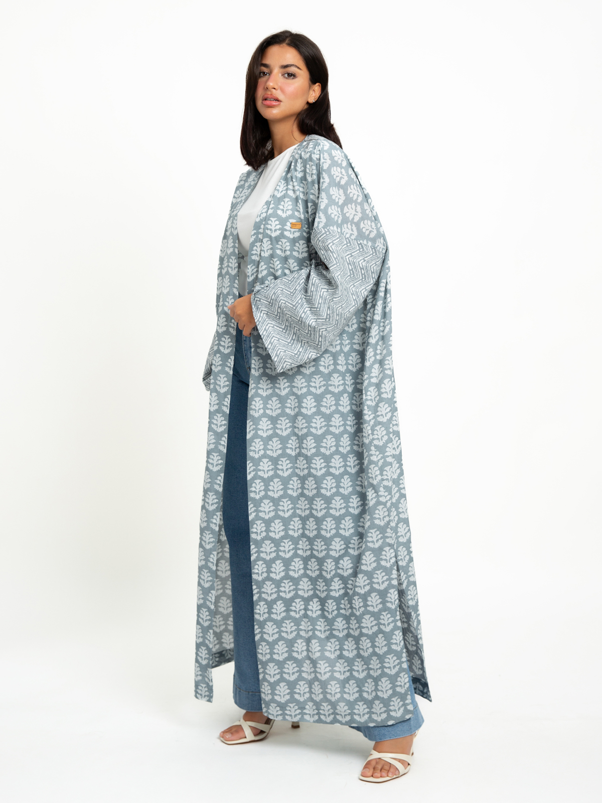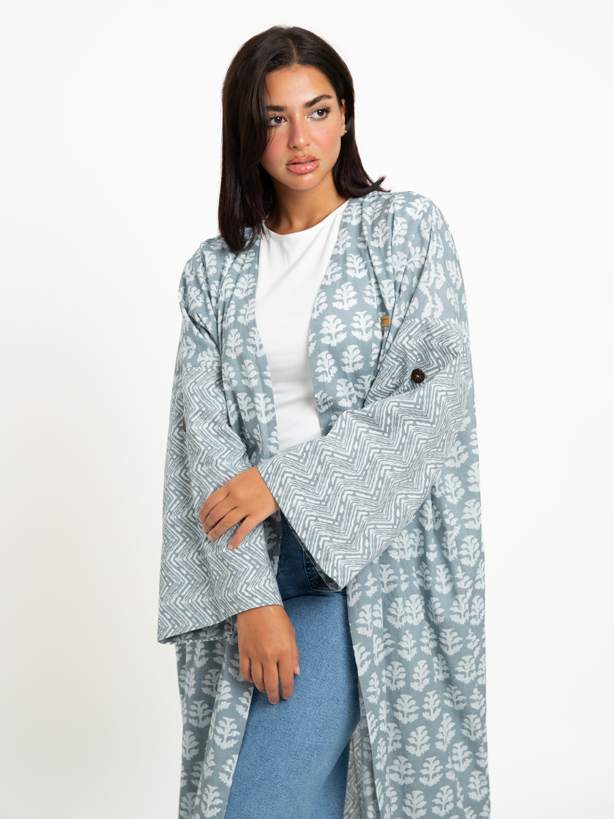 Long Wide-fit Open Abaya in Printed Cotton Fabric