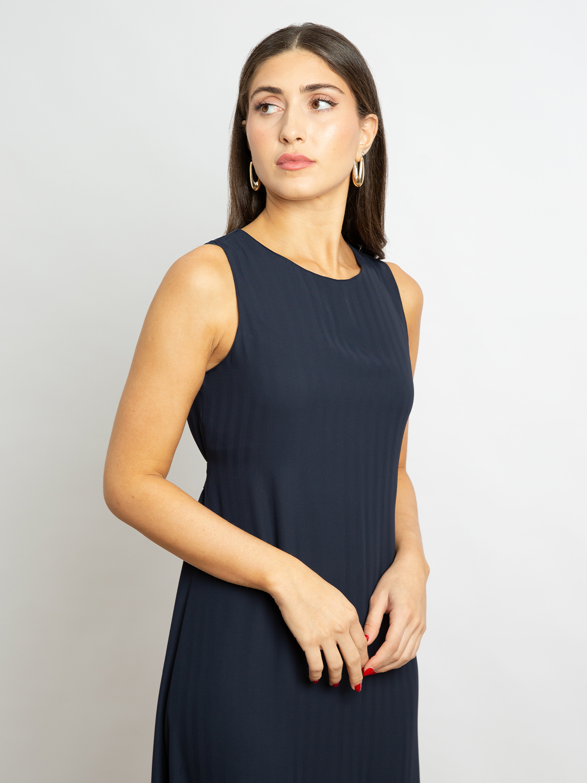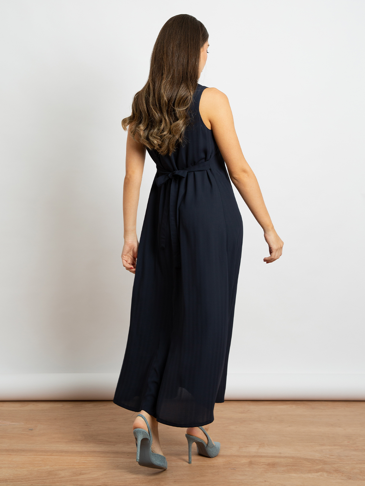 Striped Navy - Light Sleeveless Long Dress with Belt