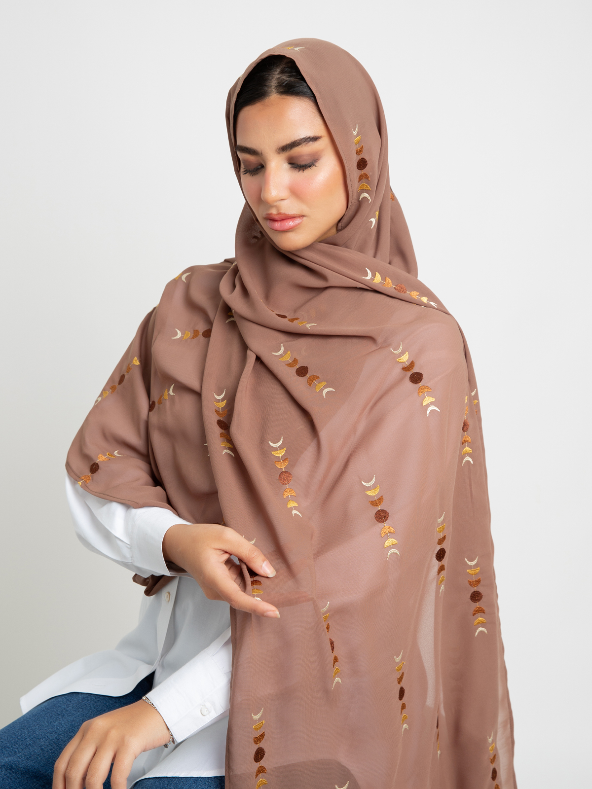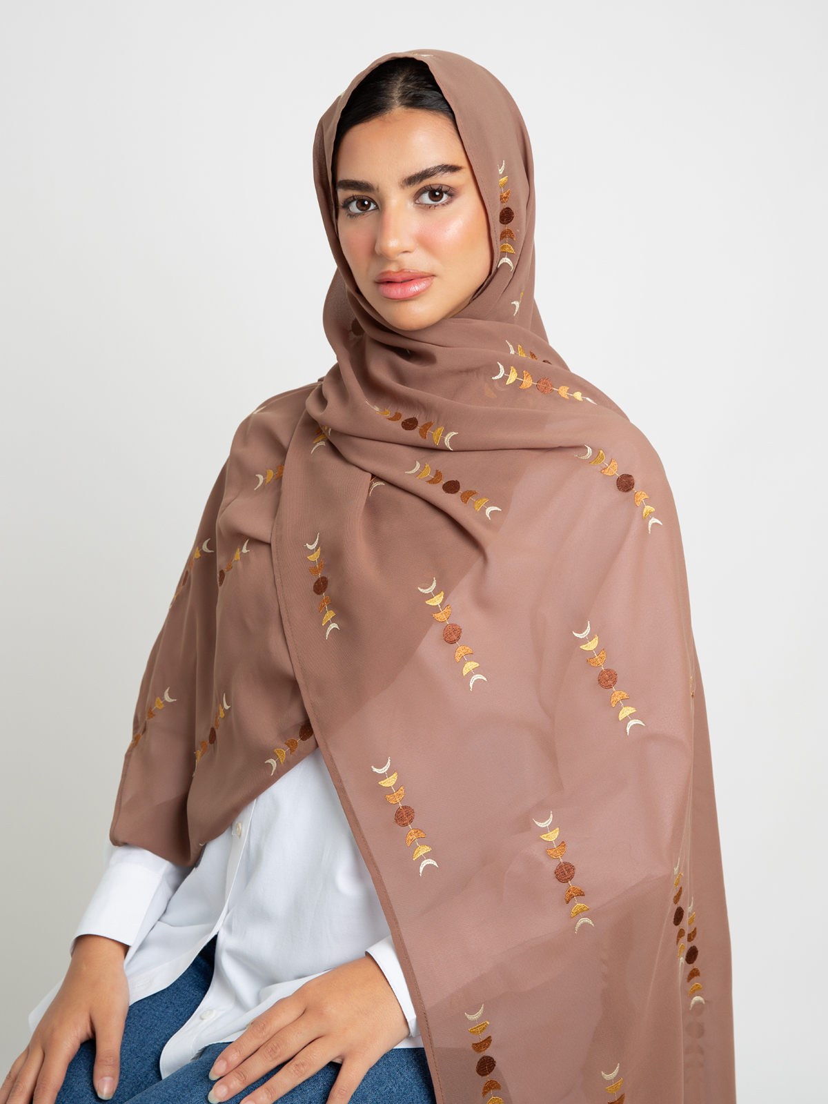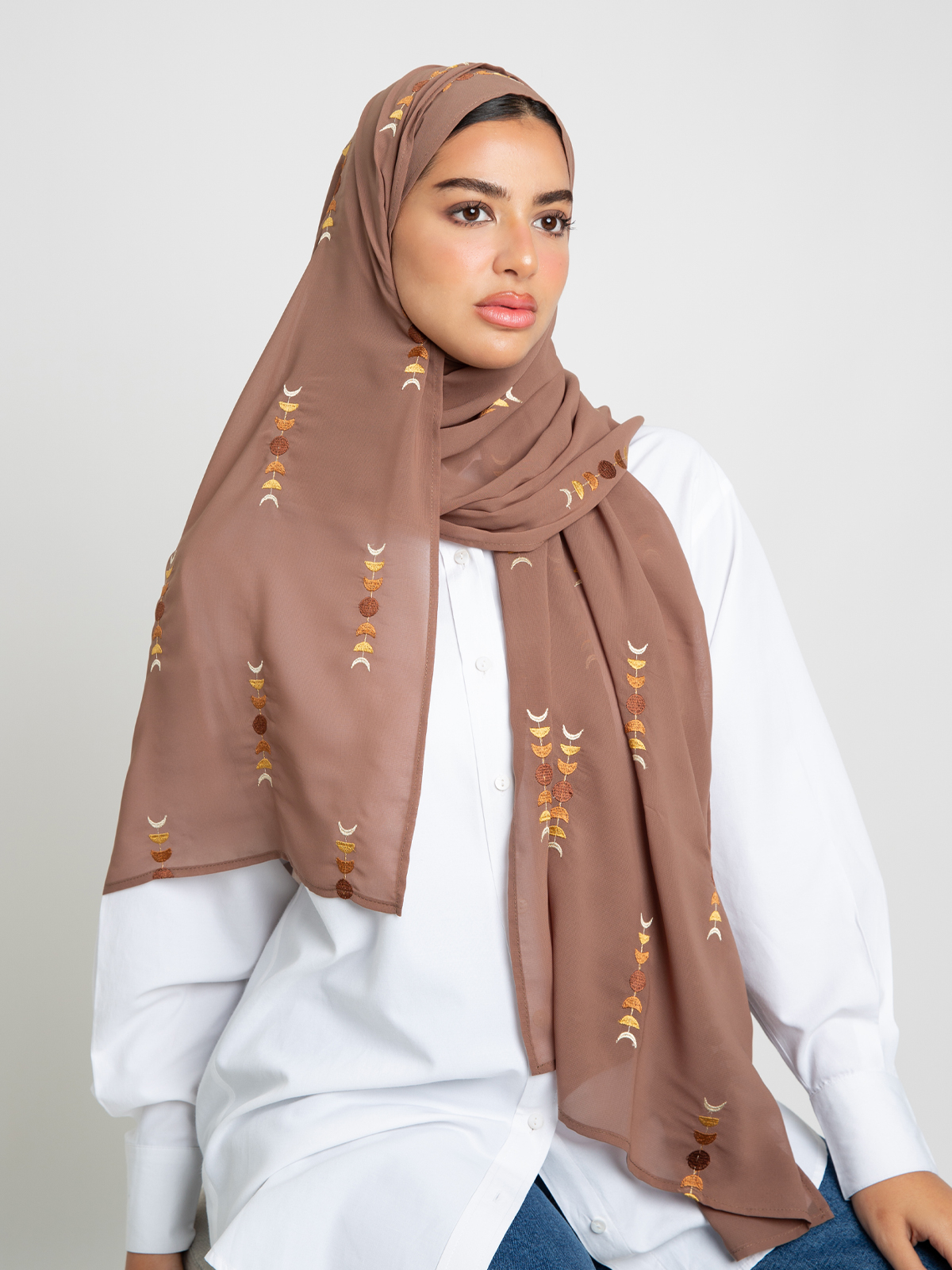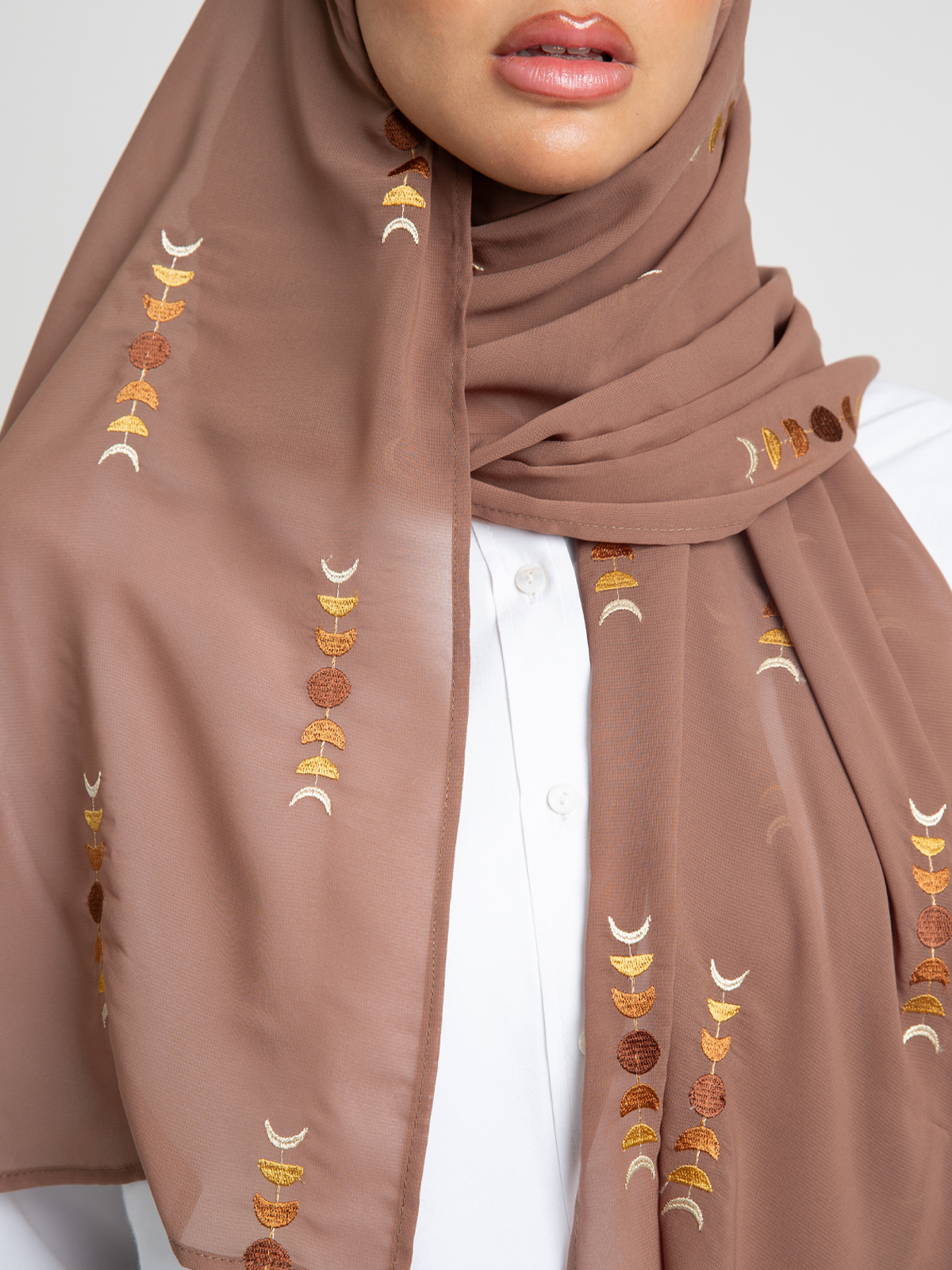 Hijab color: Mocha with Moon Embroidery.
