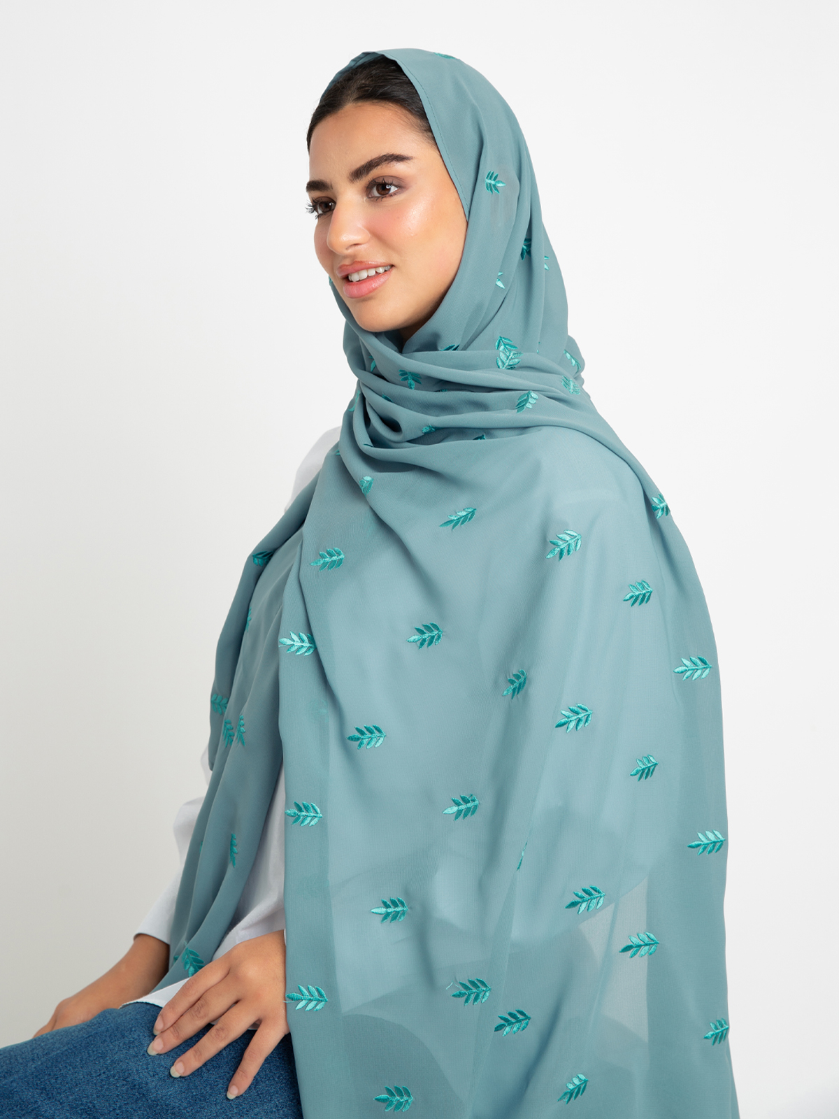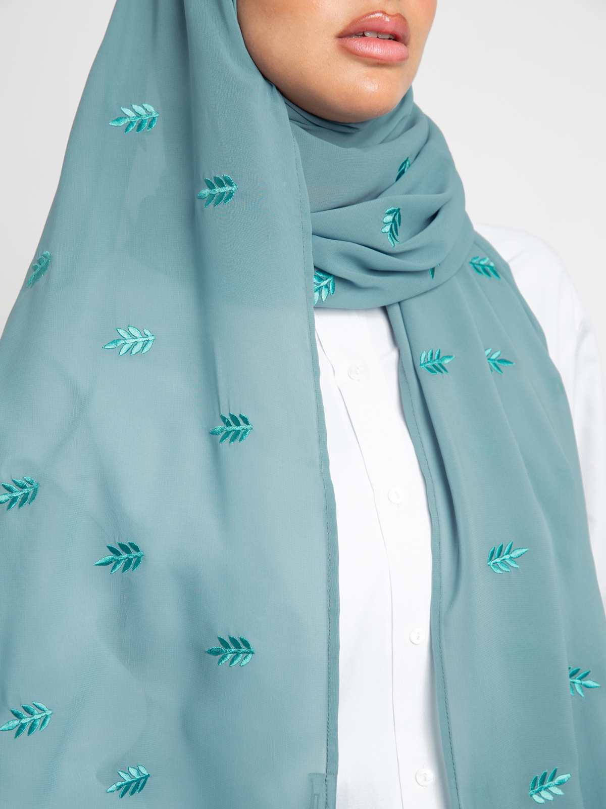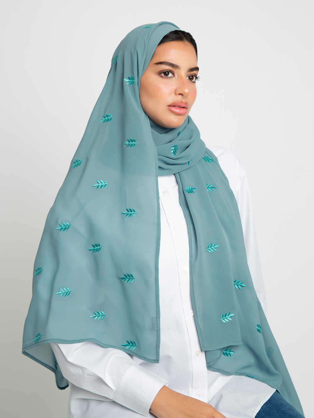 Hijab color: Turquoise with Pine Rose Embroidery.