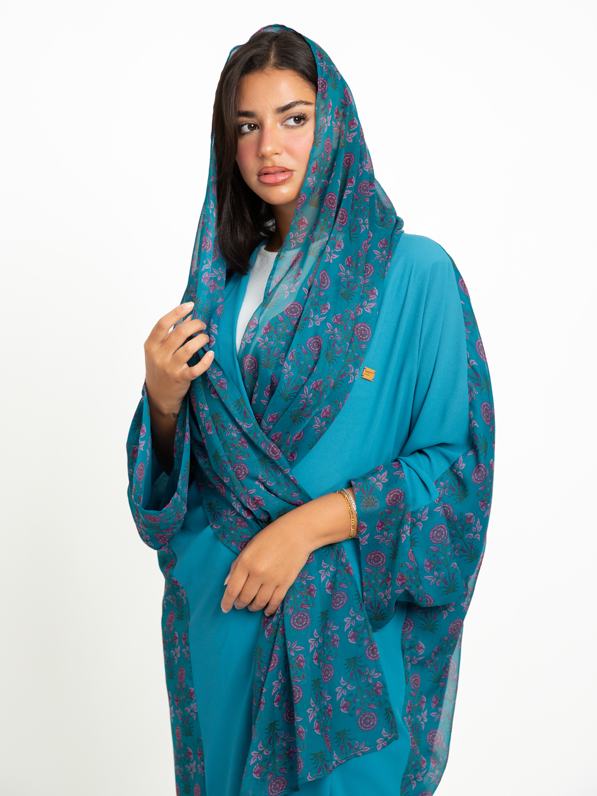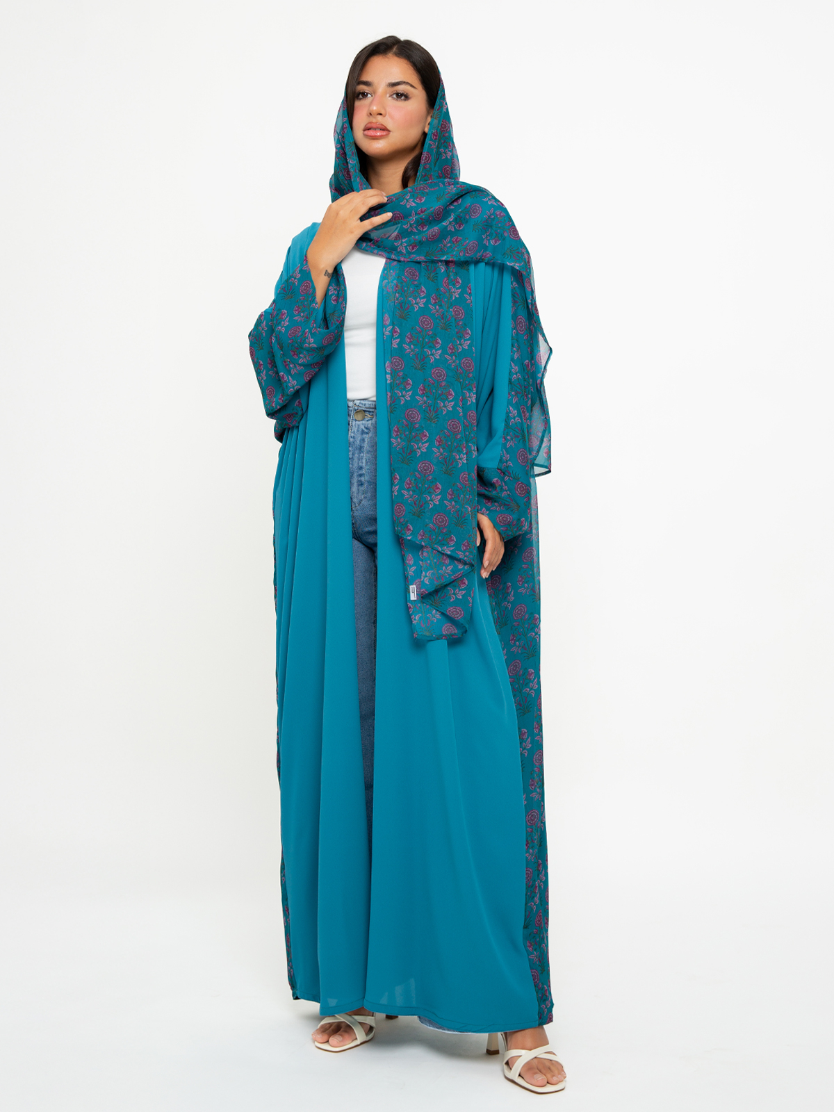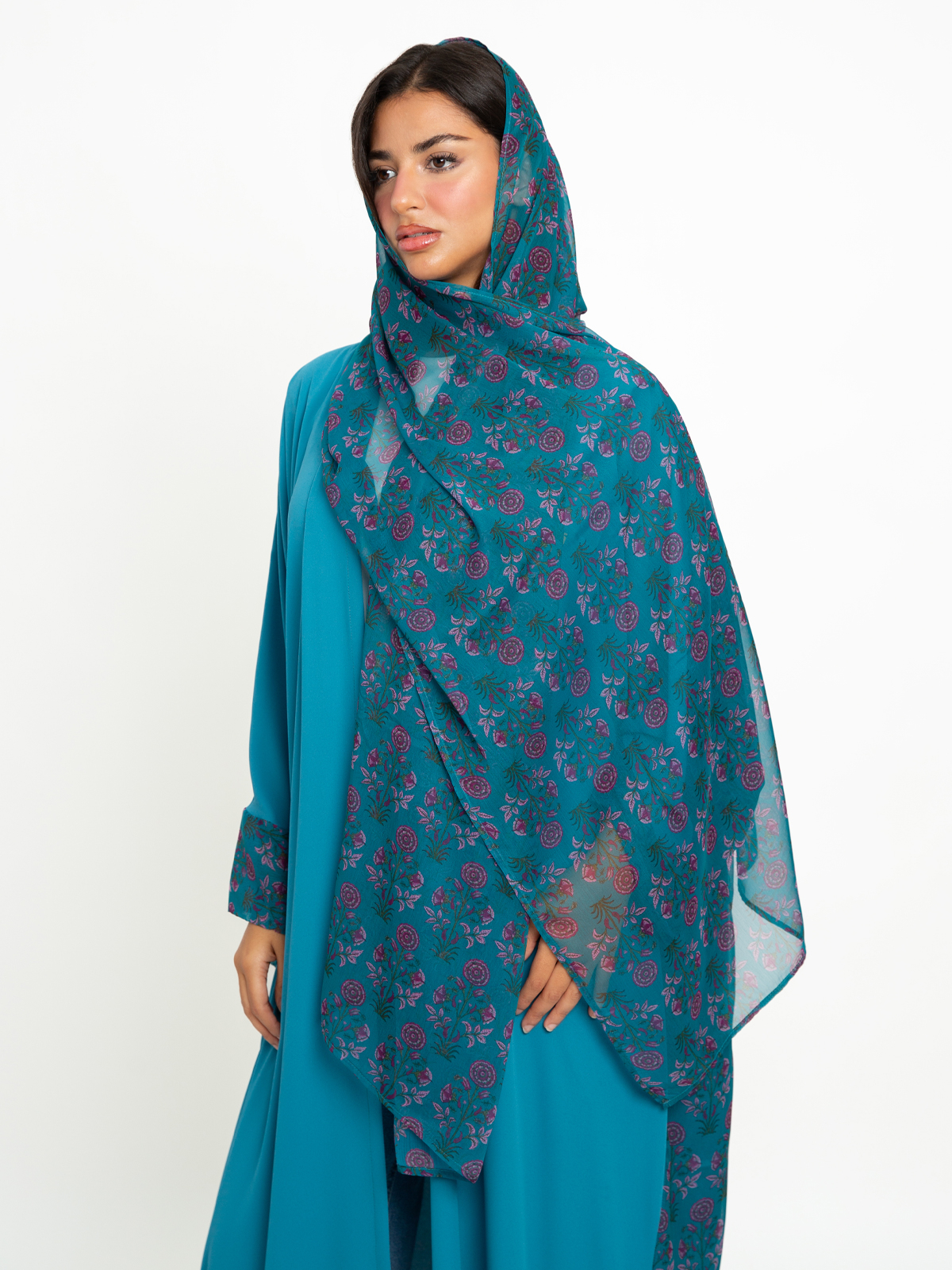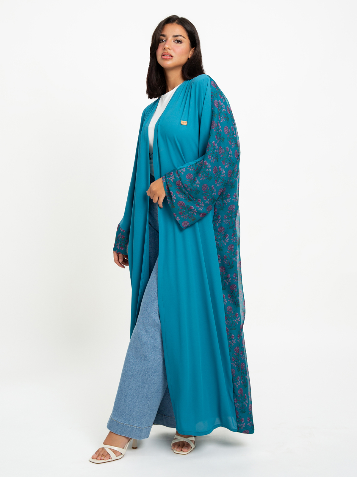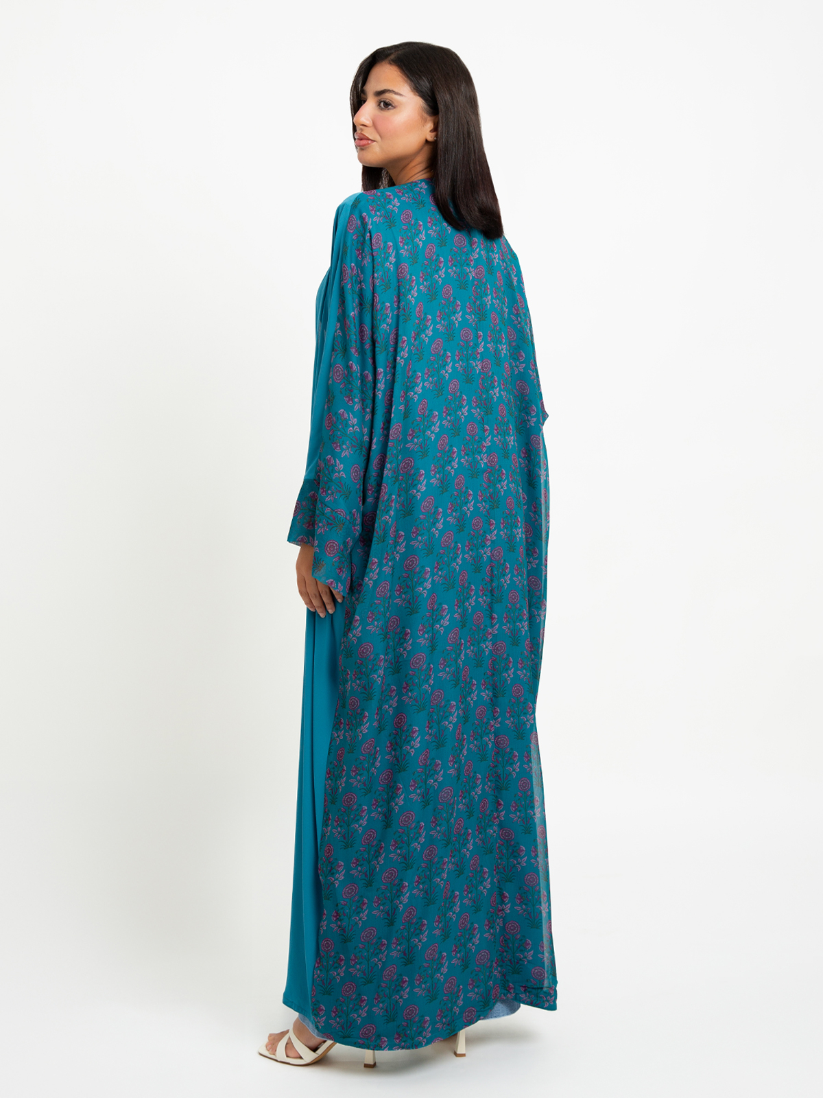 Wide-fit Long Open Abaya in Printed Chiffon Fabric