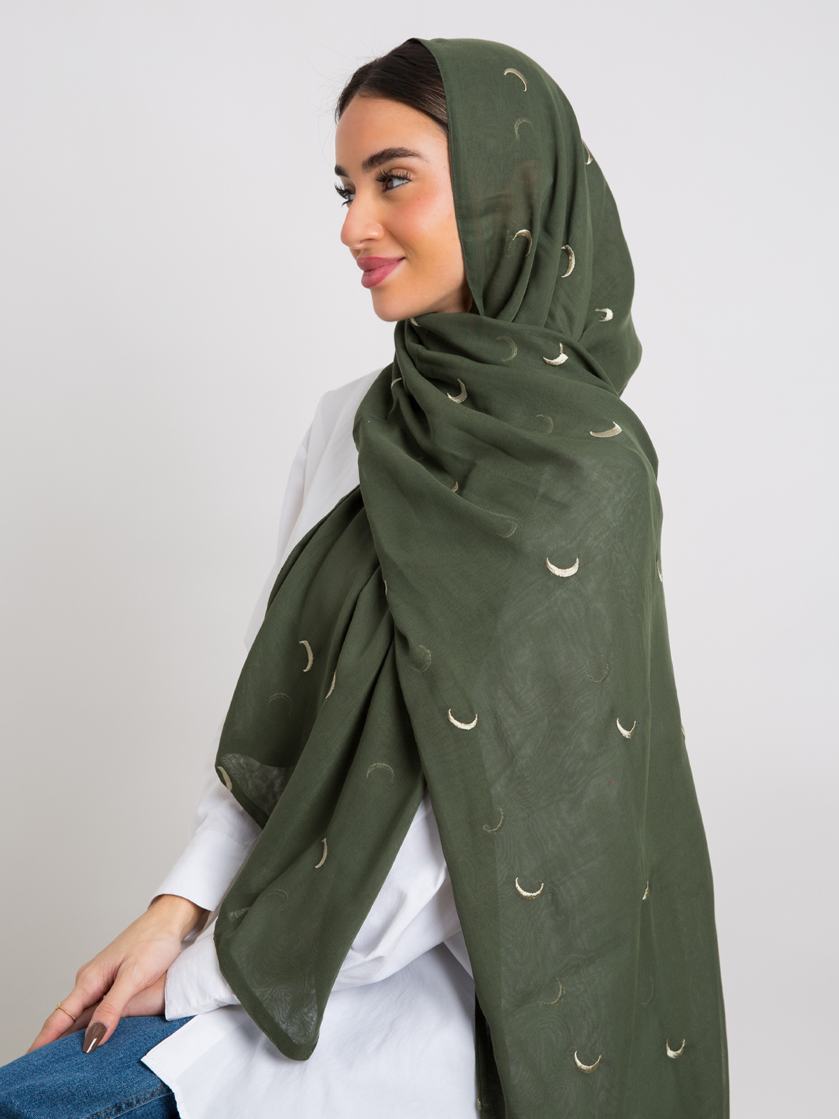 Hijab color: Pale Olive with Crescents Embroidery.