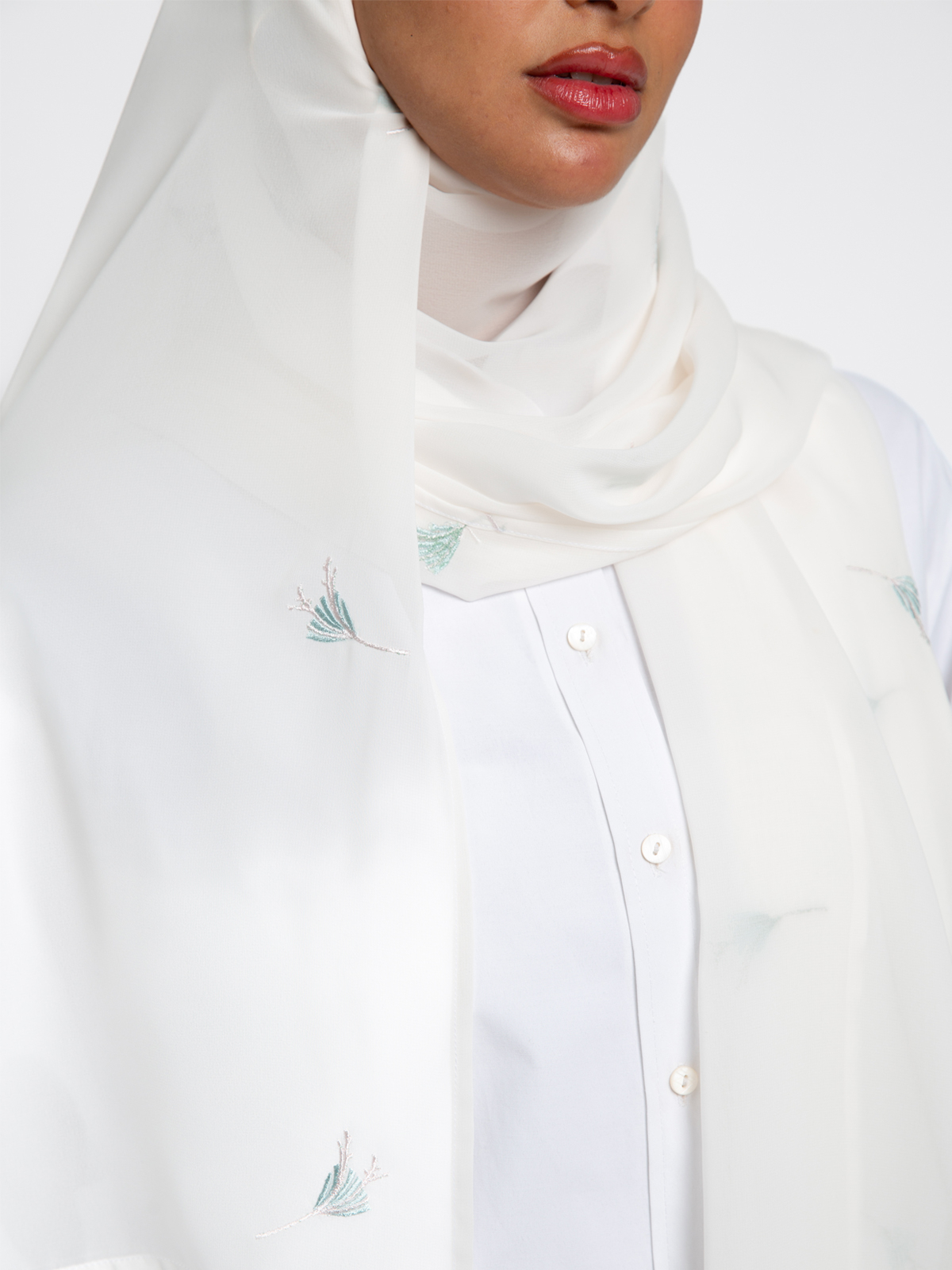 Hijab color: Off White Tarha with Powder Flower Embroidery.