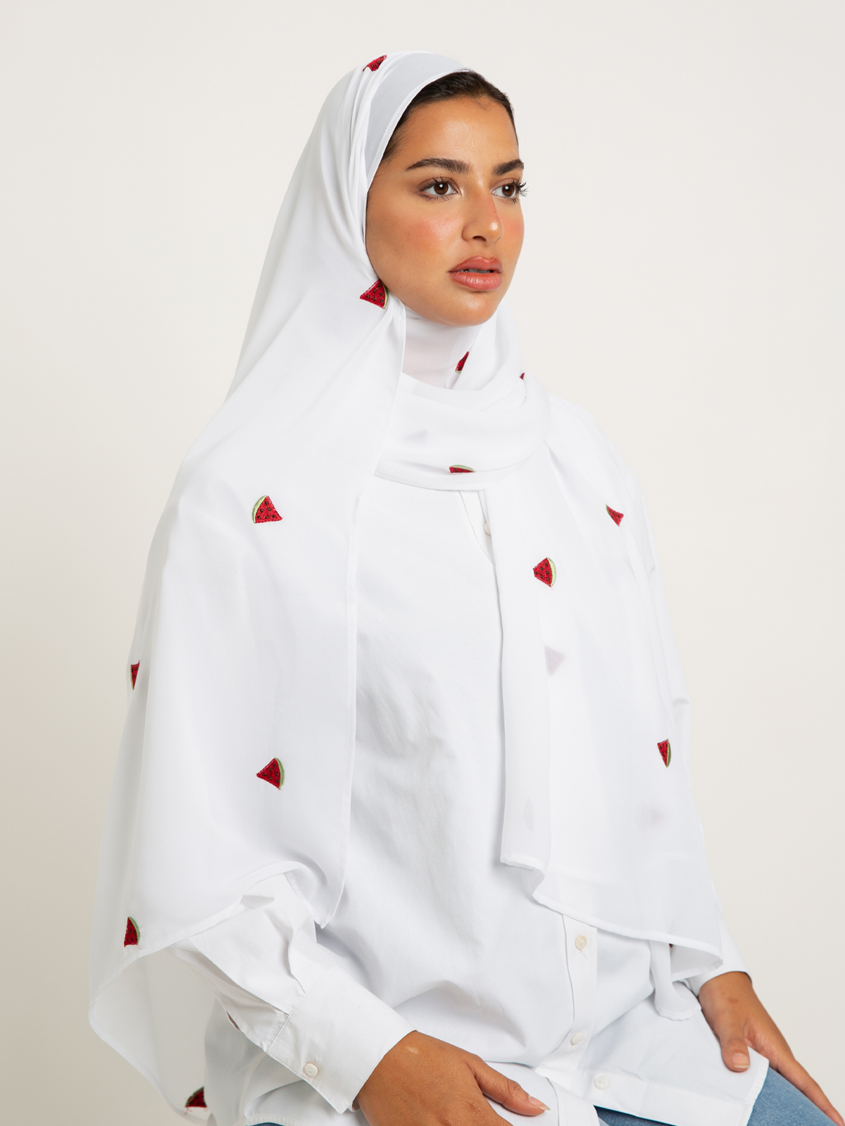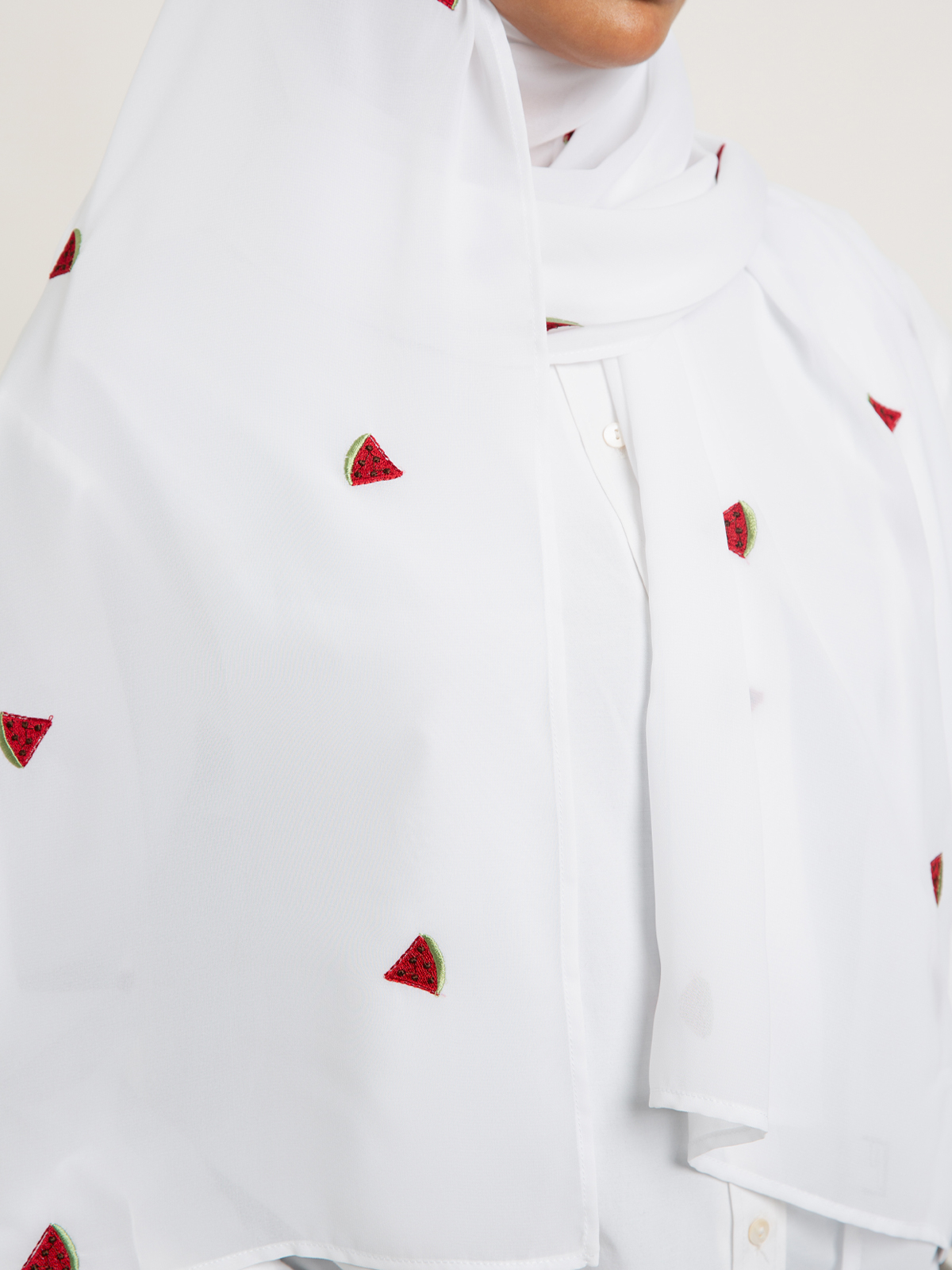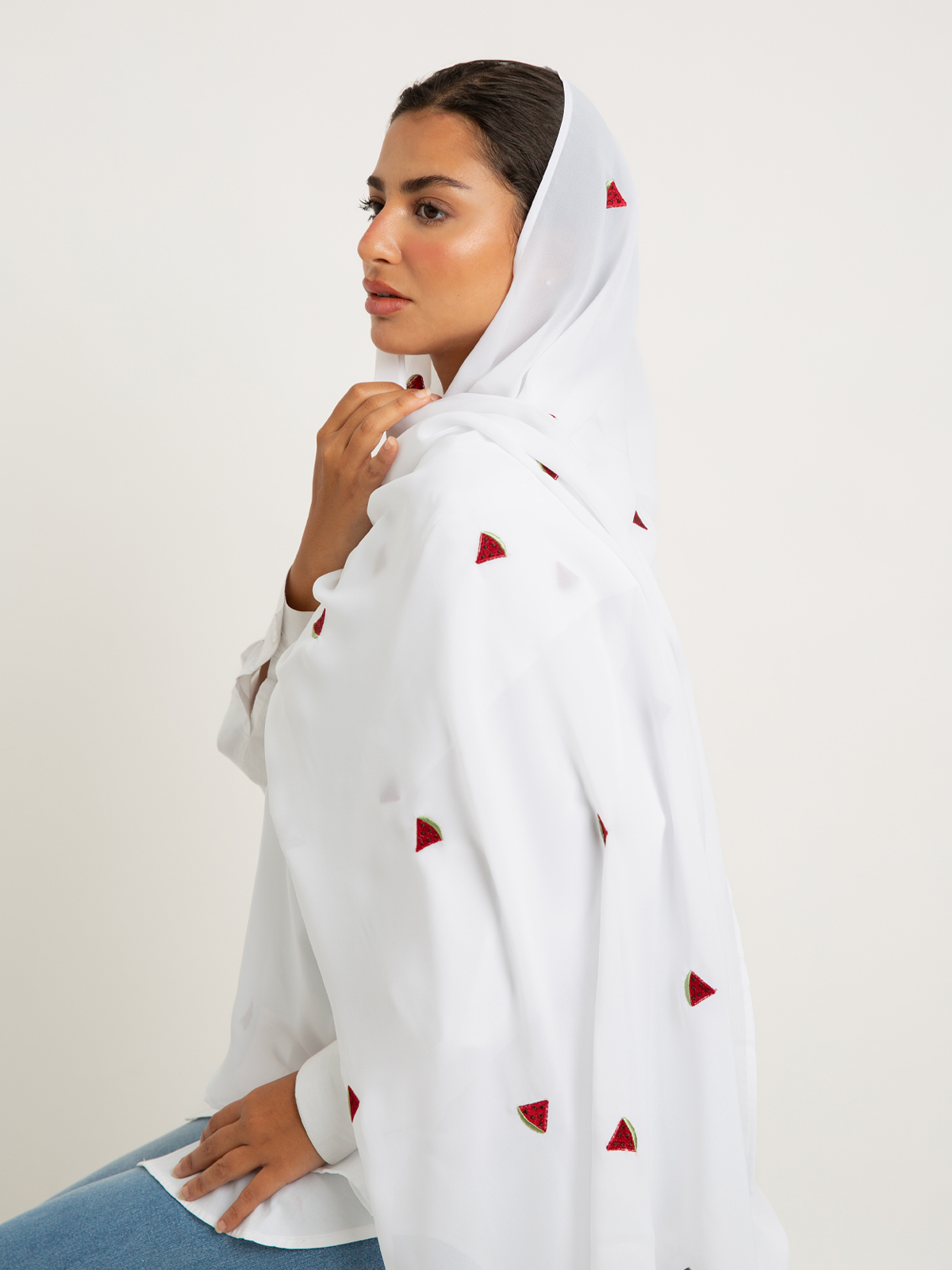 Our light embroidered laser chiffon tarha is full of summer vibes, with sweet watermelon details that adds a fresh, playful touch to your look. Easy, breezy, and perfect for sunny days!