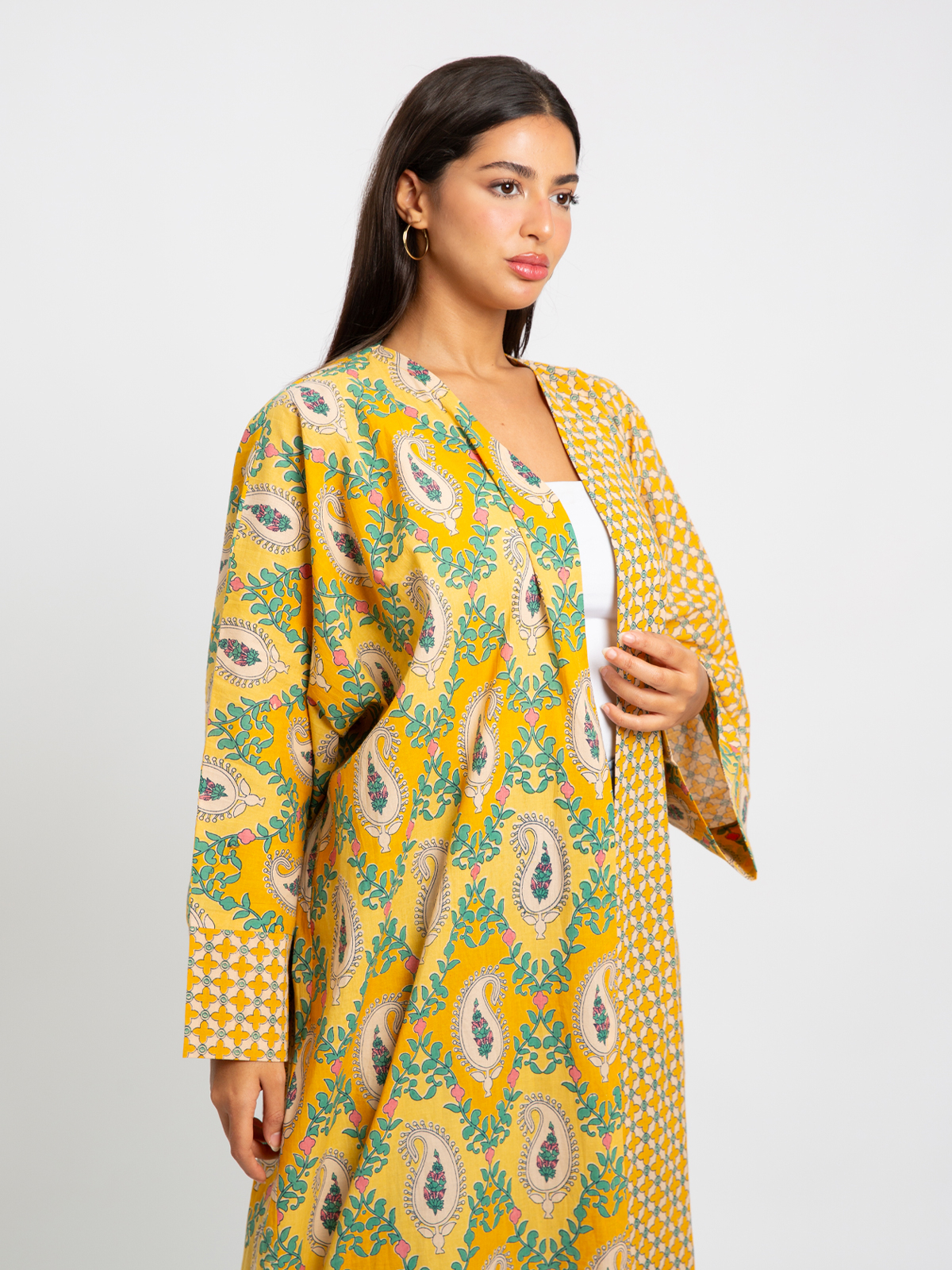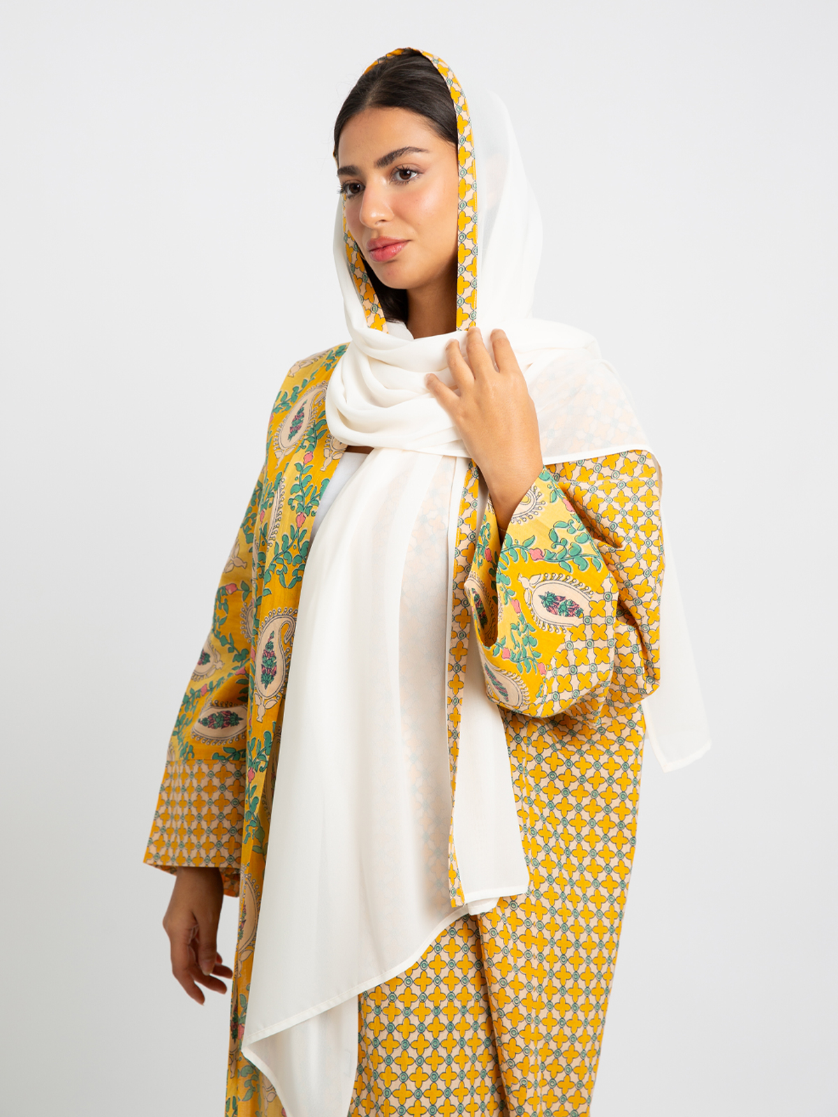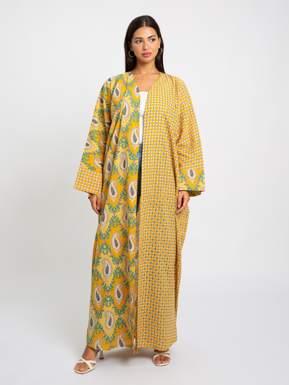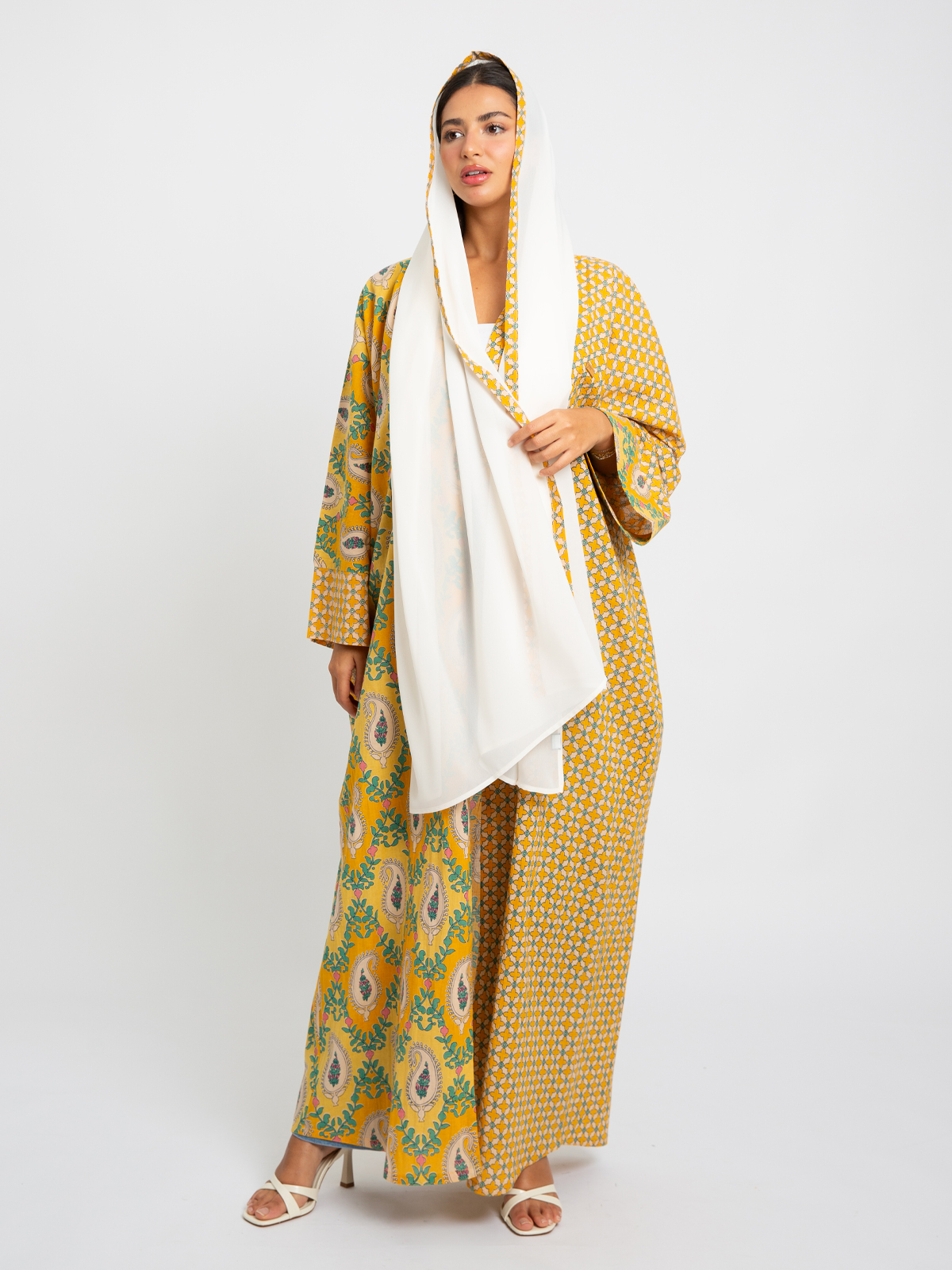 Wide-fit Long Open Abaya in Printed Cotton Fabric